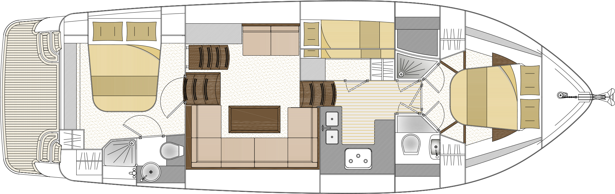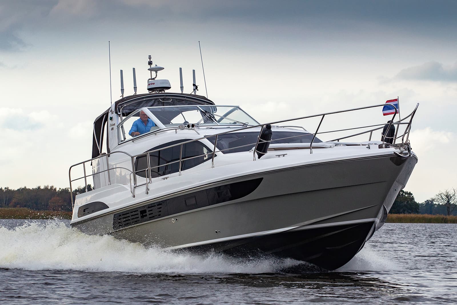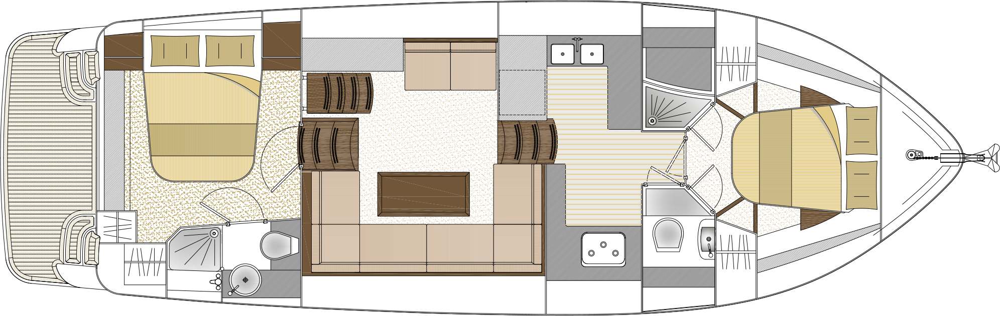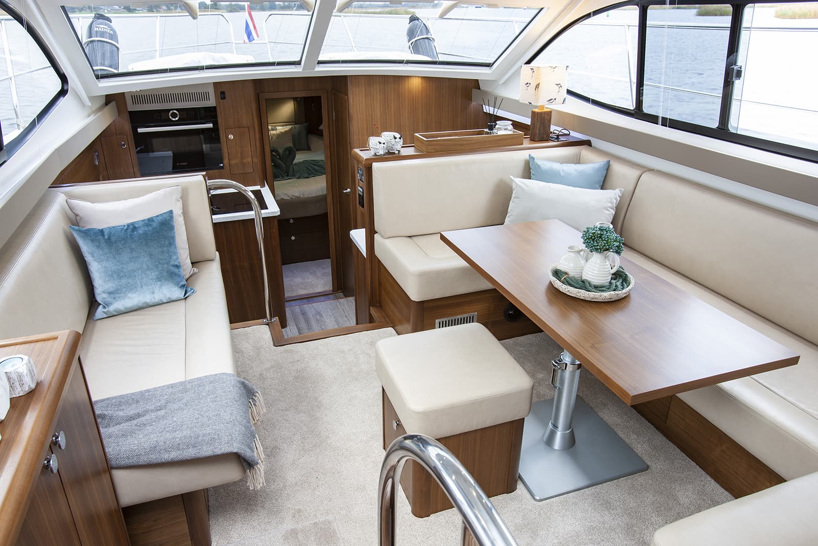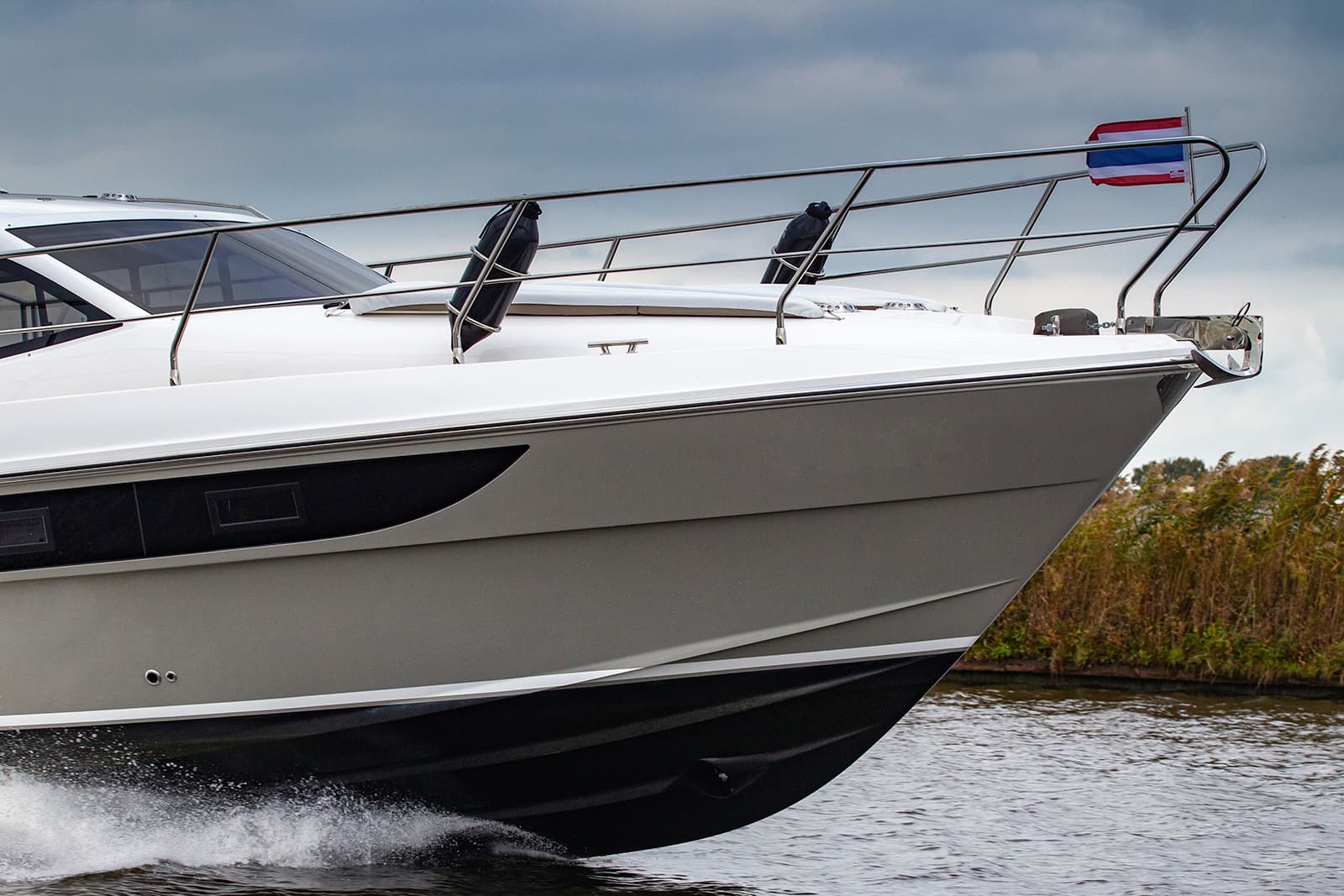 On the aft deck, you’ll find a spacious U-shaped settee, the perfect place to relax and enjoy the panoramic views. The light and airy saloon offers an open and comfortable feel, while the generous, split-level galley provides a practical layout for maximum convenience. Both forward and aft are equipped with spacious cabins, each with its own bathroom, so you and your guests can stay in ultimate comfort. Looking for extra sleeping space? Then opt for a layout with a third cabin, equipped with a bunk bed. The Haines 400 AC is also available in an offshore version with a planing hull, making the yacht a smooth and comfortable cruiser at all speeds. Whether you choose a single or twin engine configuration, the possibilities are endless. With the freedom to fully customize the yacht to your own requirements, the Haines 400 AC offers customization at its best. What does your ideal Haines 400 AC look like?