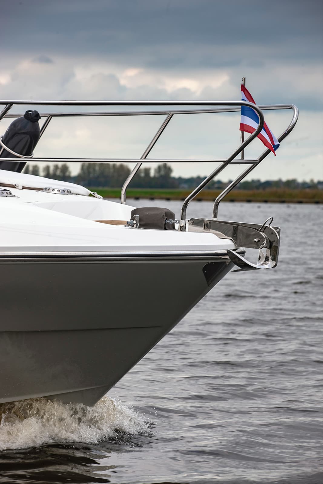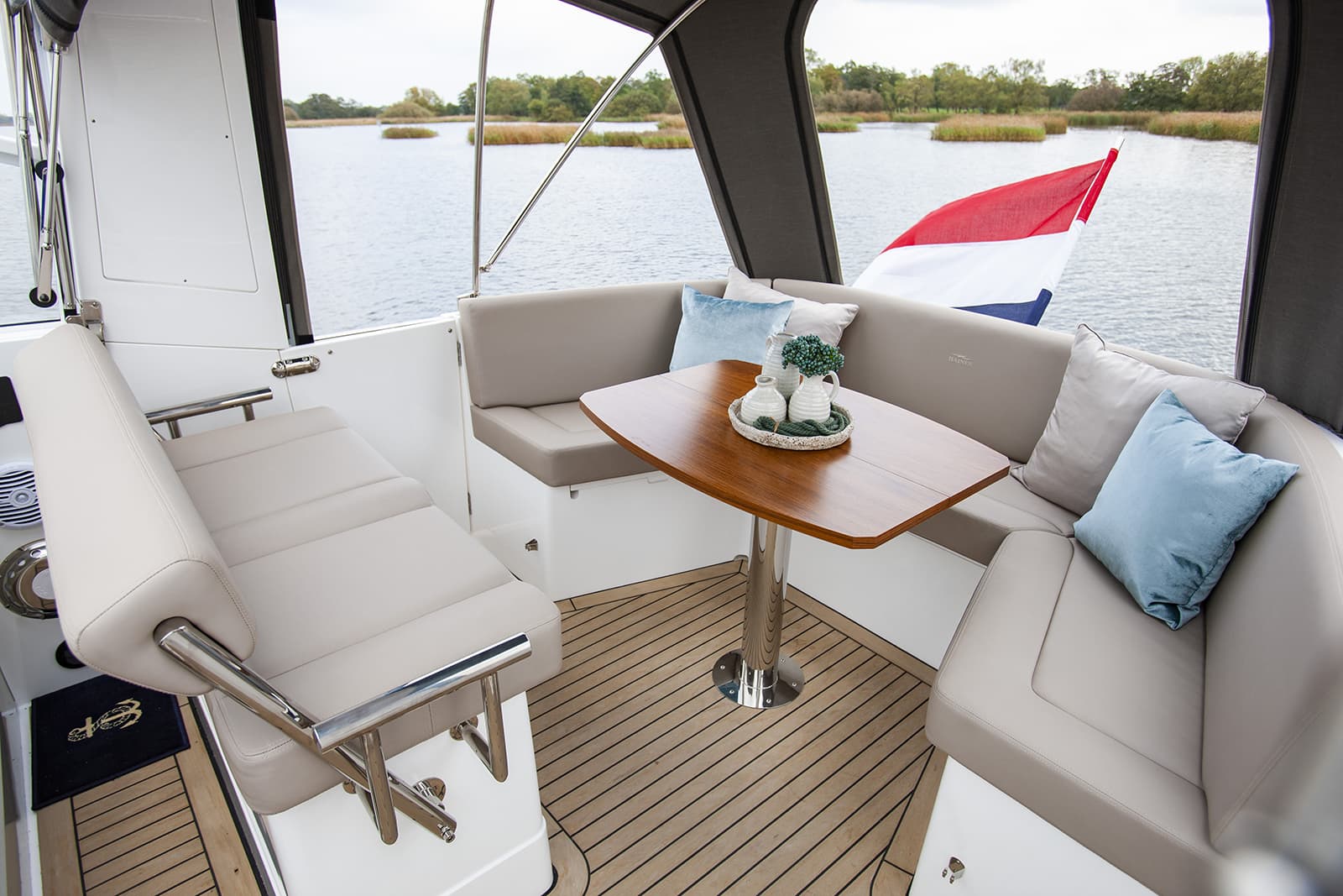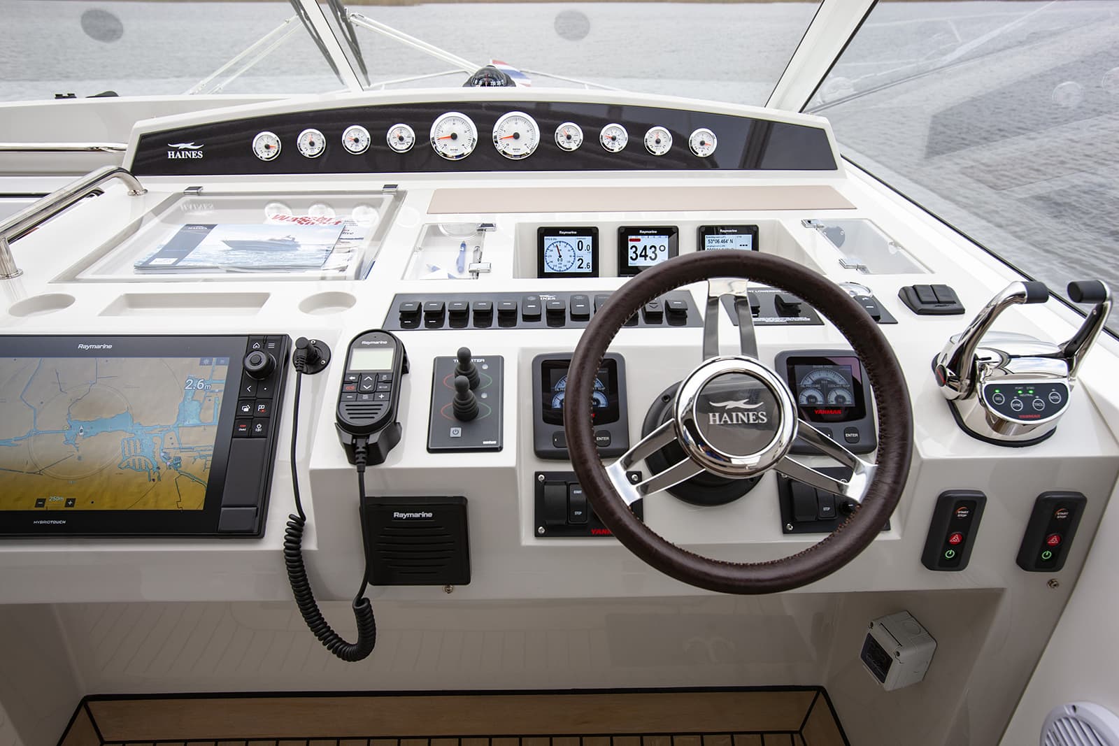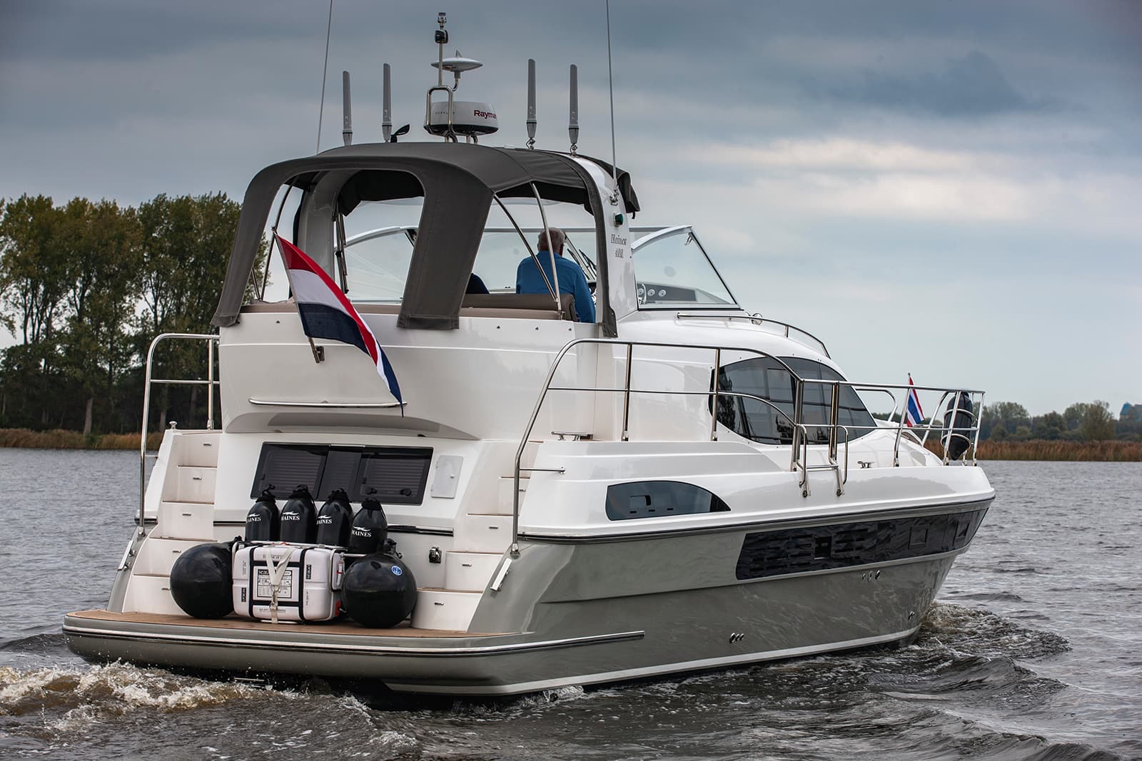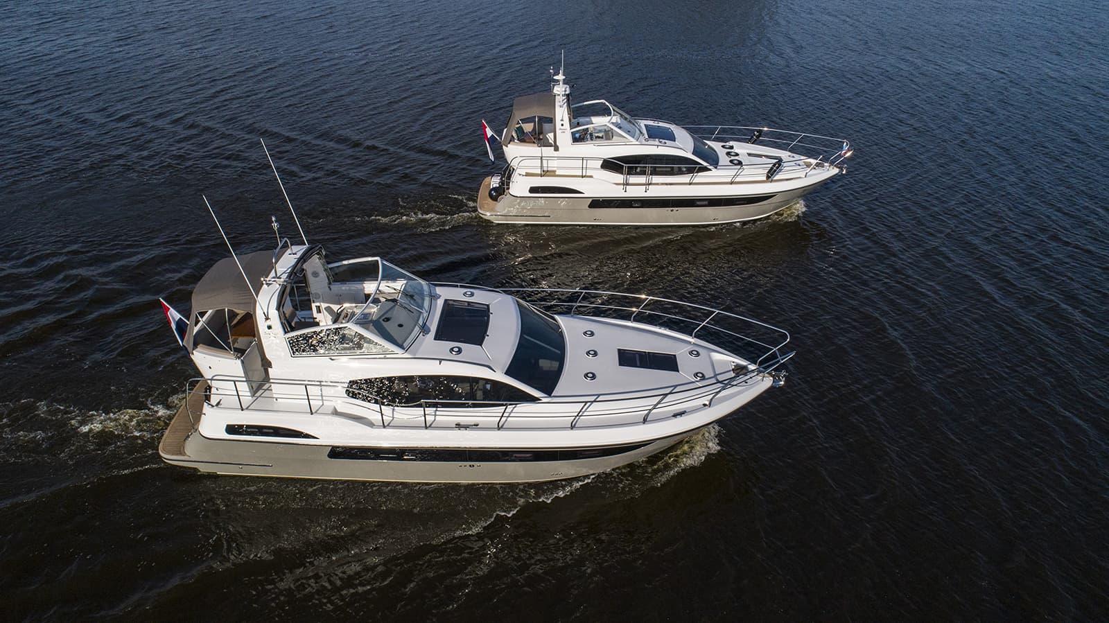 On the aft deck, you’ll find a spacious U-shaped settee, the perfect place to relax and enjoy the panoramic views. The light and airy saloon offers an open and comfortable feel, while the generous, split-level galley provides a practical layout for maximum convenience. Both forward and aft are equipped with spacious cabins, each with its own bathroom, so you and your guests can stay in ultimate comfort. Looking for extra sleeping space? Then opt for a layout with a third cabin, equipped with a bunk bed. The Haines 400 AC is also available in an offshore version with a planing hull, making the yacht a smooth and comfortable cruiser at all speeds. Whether you choose a single or twin engine configuration, the possibilities are endless. With the freedom to fully customize the yacht to your own requirements, the Haines 400 AC offers customization at its best. What does your ideal Haines 400 AC look like?