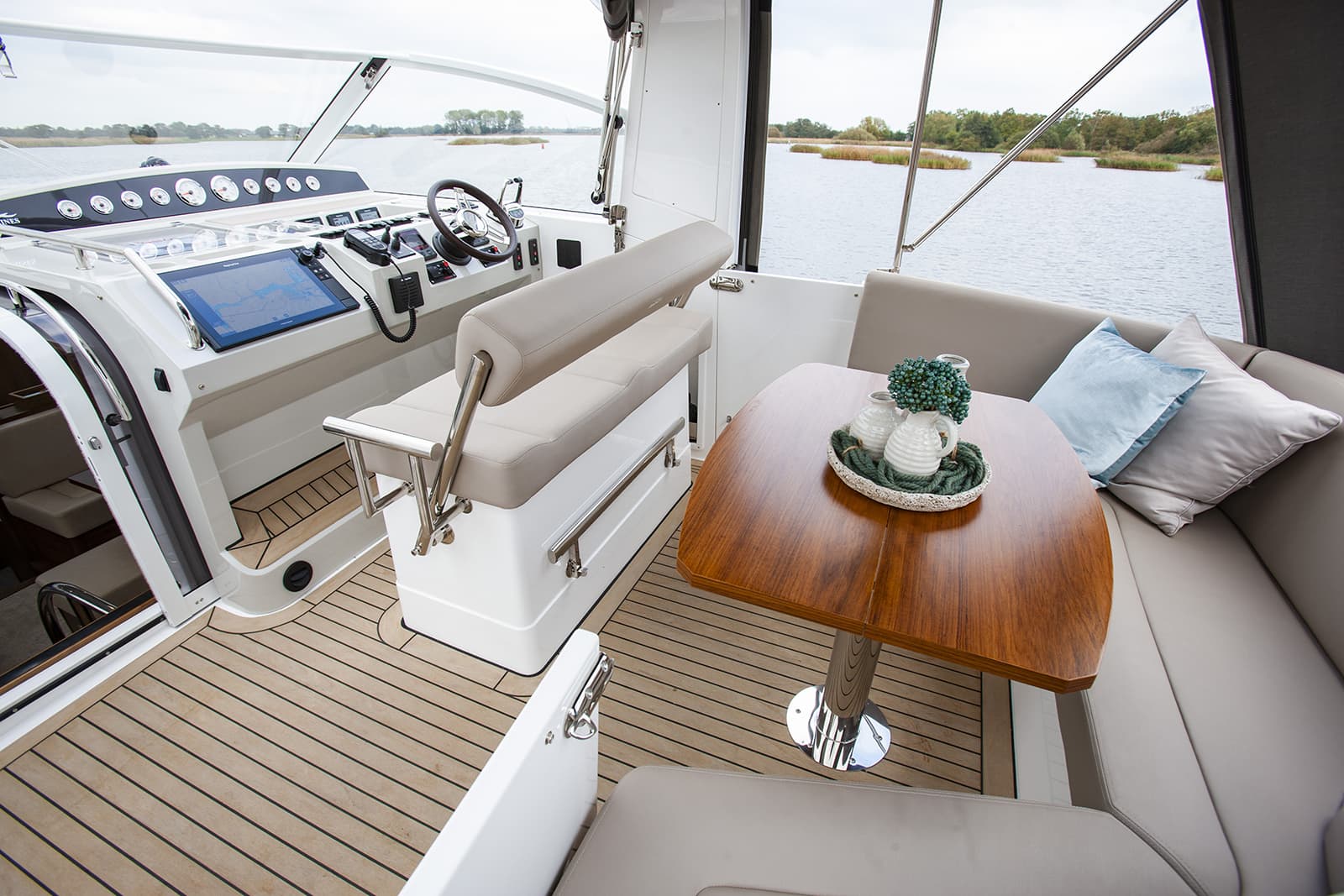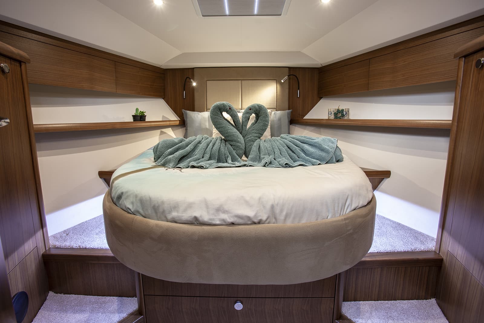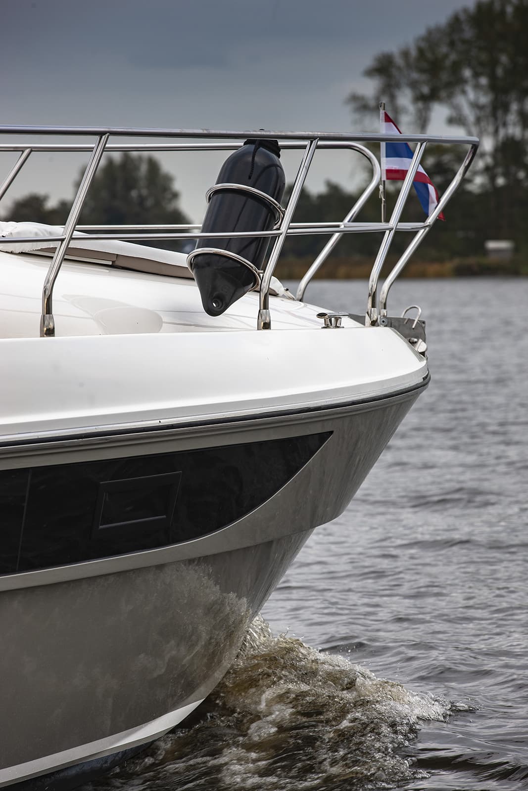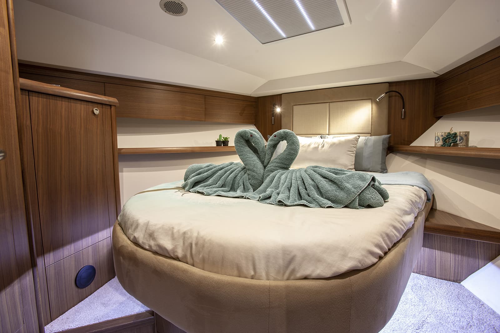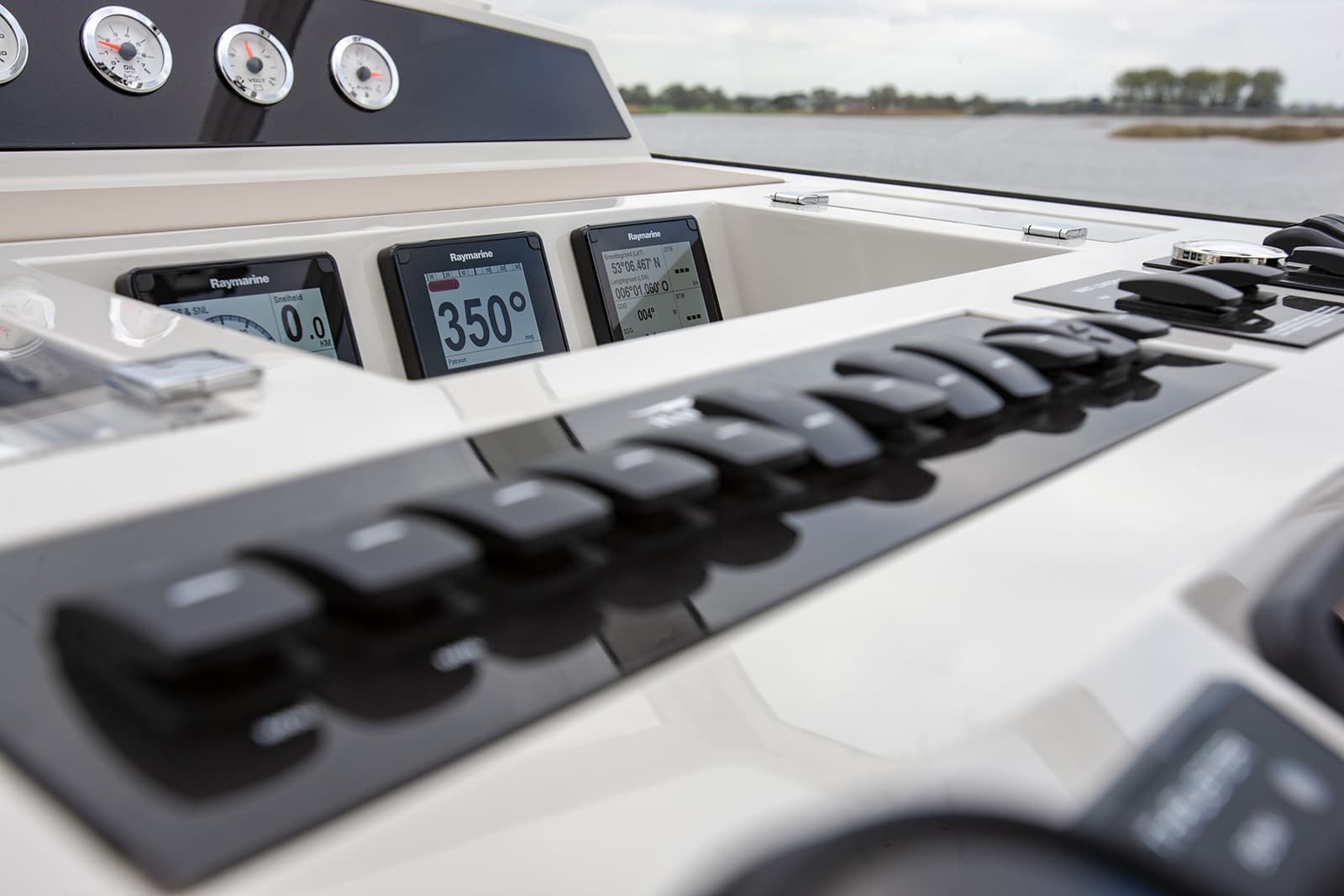 On the aft deck, you’ll find a spacious U-shaped settee, the perfect place to relax and enjoy the panoramic views. The light and airy saloon offers an open and comfortable feel, while the generous, split-level galley provides a practical layout for maximum convenience. Both forward and aft are equipped with spacious cabins, each with its own bathroom, so you and your guests can stay in ultimate comfort. Looking for extra sleeping space? Then opt for a layout with a third cabin, equipped with a bunk bed. The Haines 400 AC is also available in an offshore version with a planing hull, making the yacht a smooth and comfortable cruiser at all speeds. Whether you choose a single or twin engine configuration, the possibilities are endless. With the freedom to fully customize the yacht to your own requirements, the Haines 400 AC offers customization at its best. What does your ideal Haines 400 AC look like?