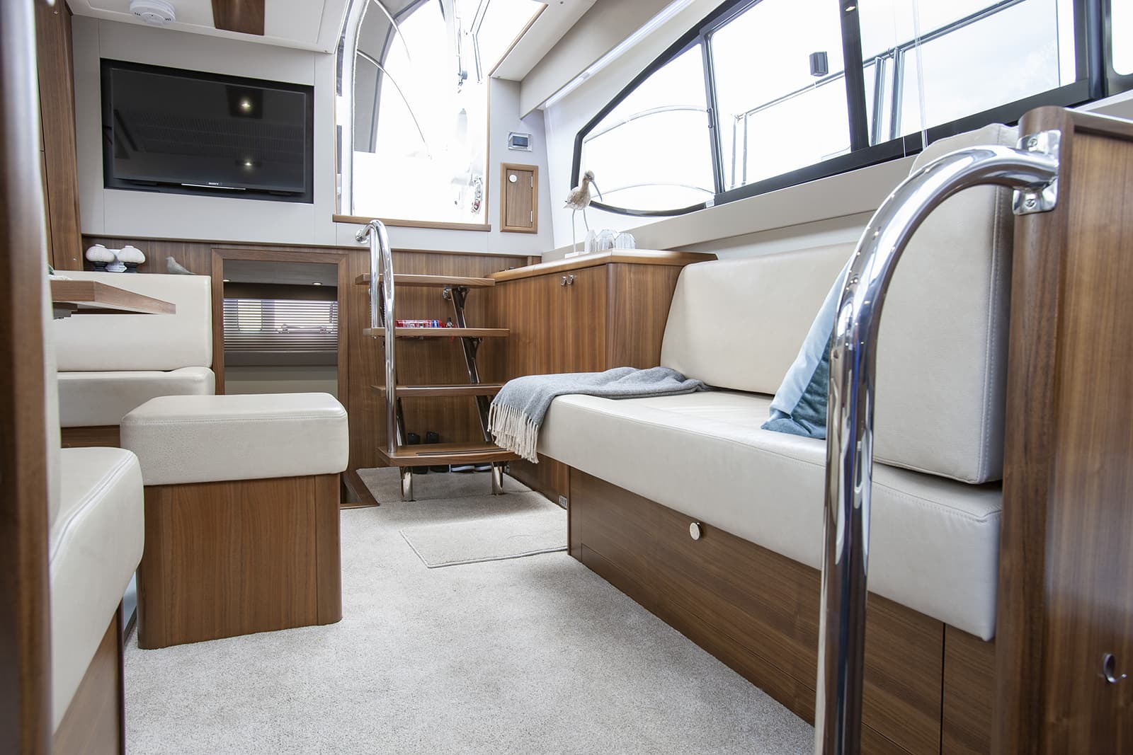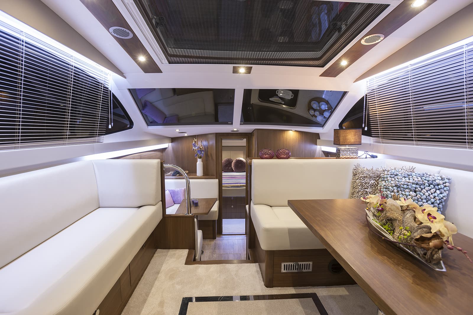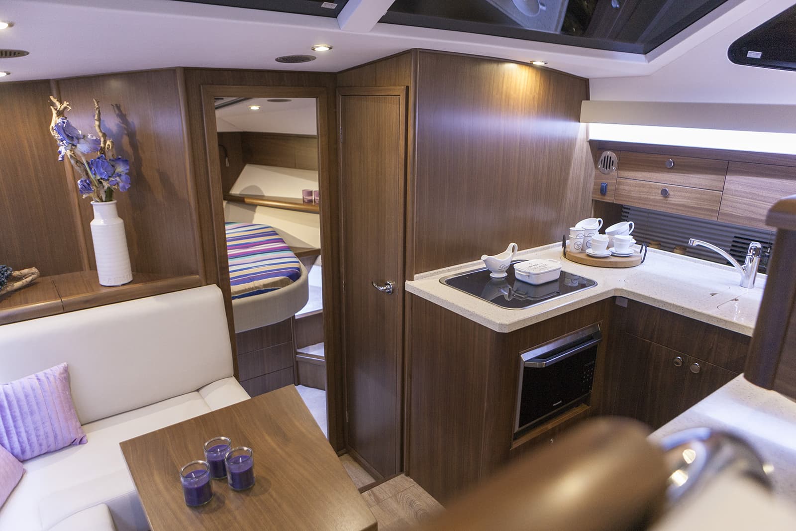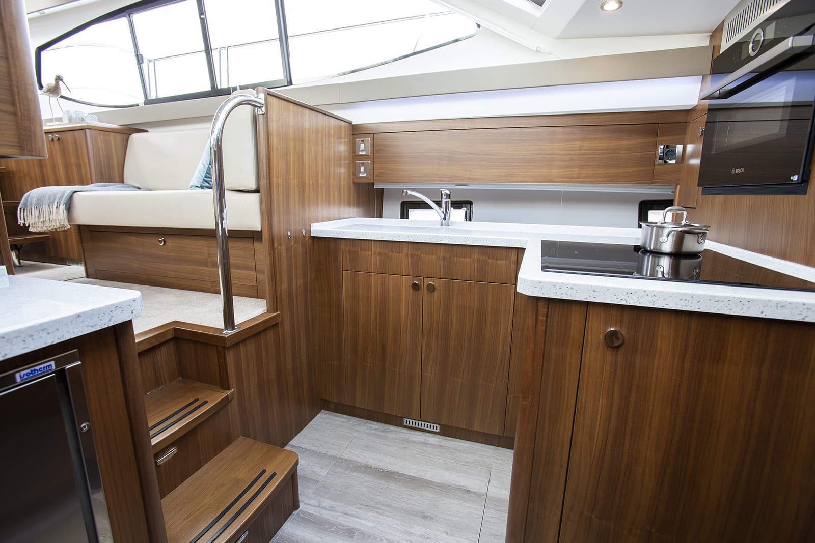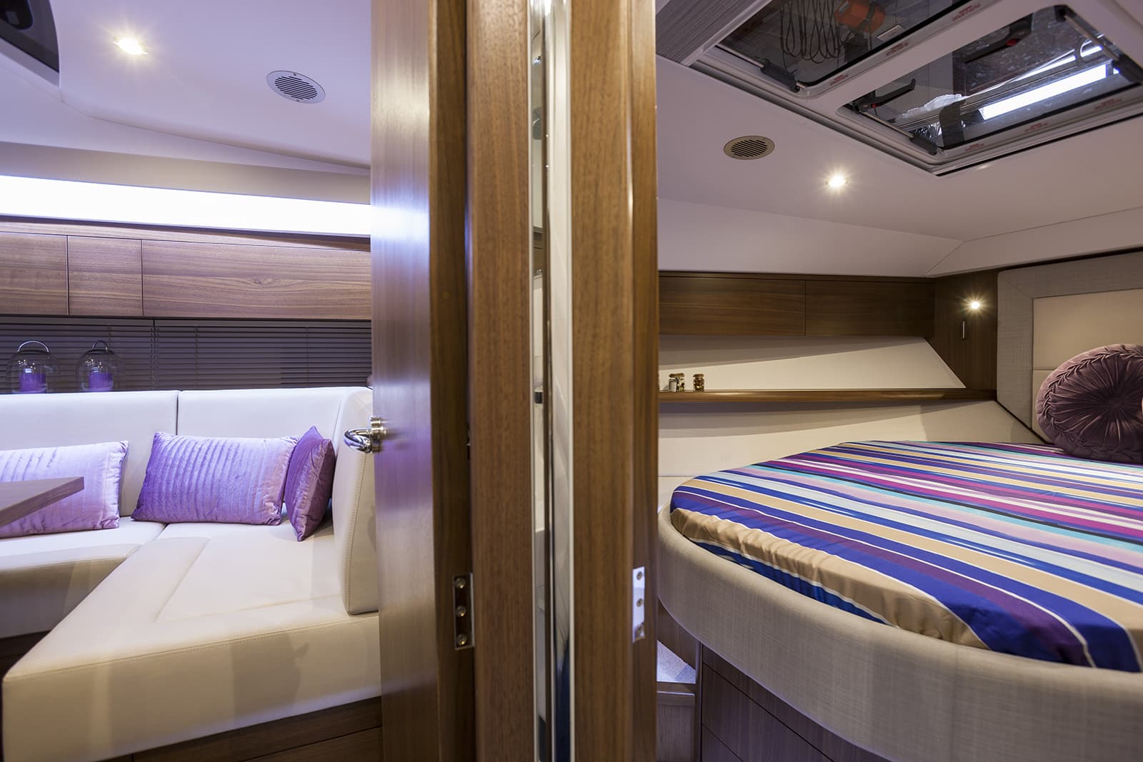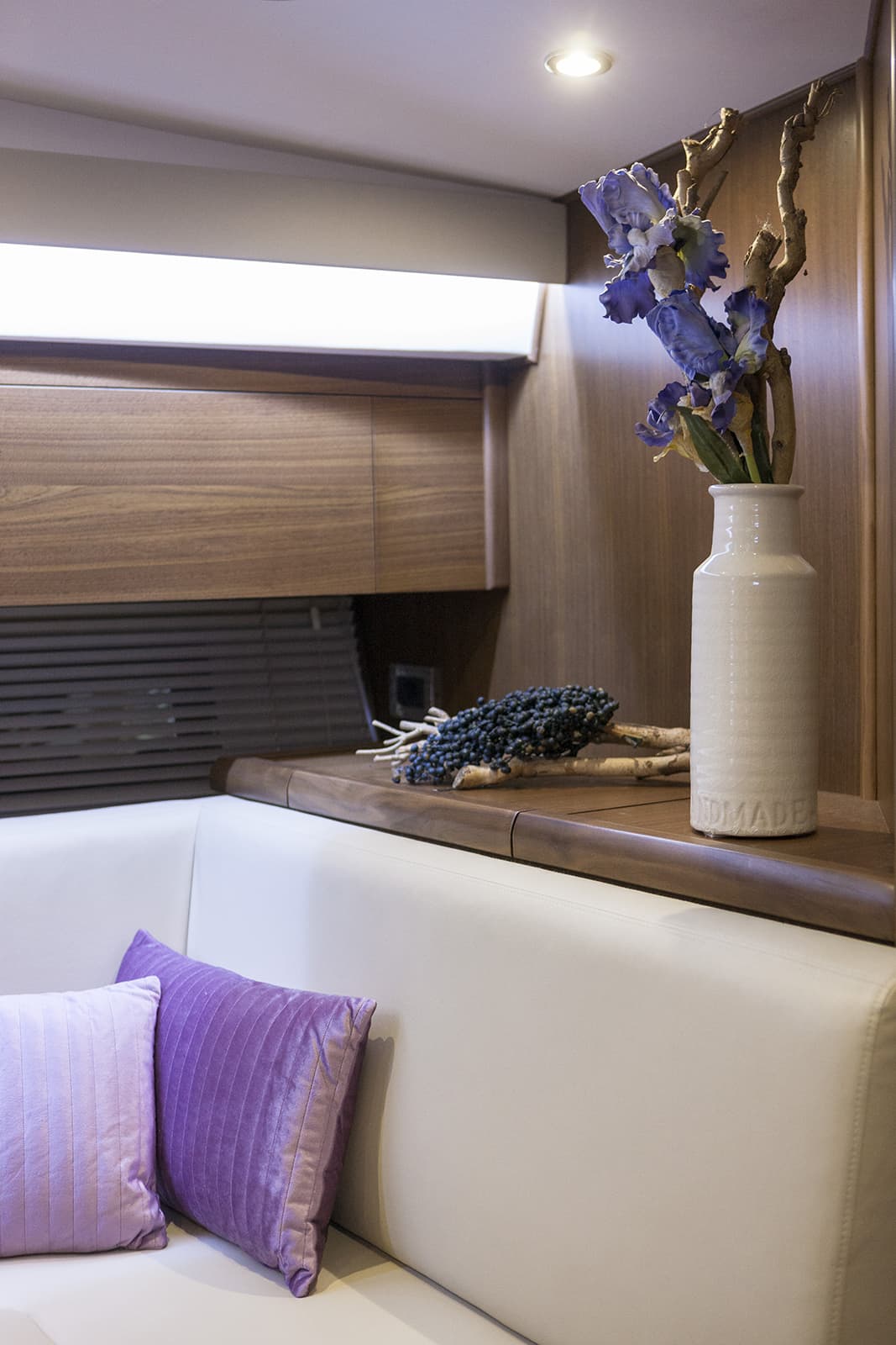 On the aft deck, you’ll find a spacious U-shaped settee, the perfect place to relax and enjoy the panoramic views. The light and airy saloon offers an open and comfortable feel, while the generous, split-level galley provides a practical layout for maximum convenience. Both forward and aft are equipped with spacious cabins, each with its own bathroom, so you and your guests can stay in ultimate comfort. Looking for extra sleeping space? Then opt for a layout with a third cabin, equipped with a bunk bed. The Haines 400 AC is also available in an offshore version with a planing hull, making the yacht a smooth and comfortable cruiser at all speeds. Whether you choose a single or twin engine configuration, the possibilities are endless. With the freedom to fully customize the yacht to your own requirements, the Haines 400 AC offers customization at its best. What does your ideal Haines 400 AC look like?