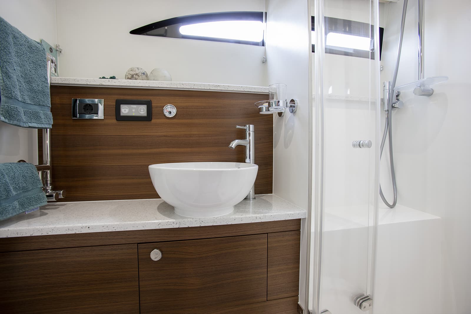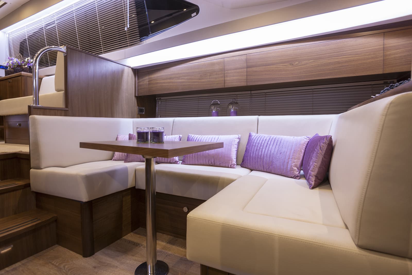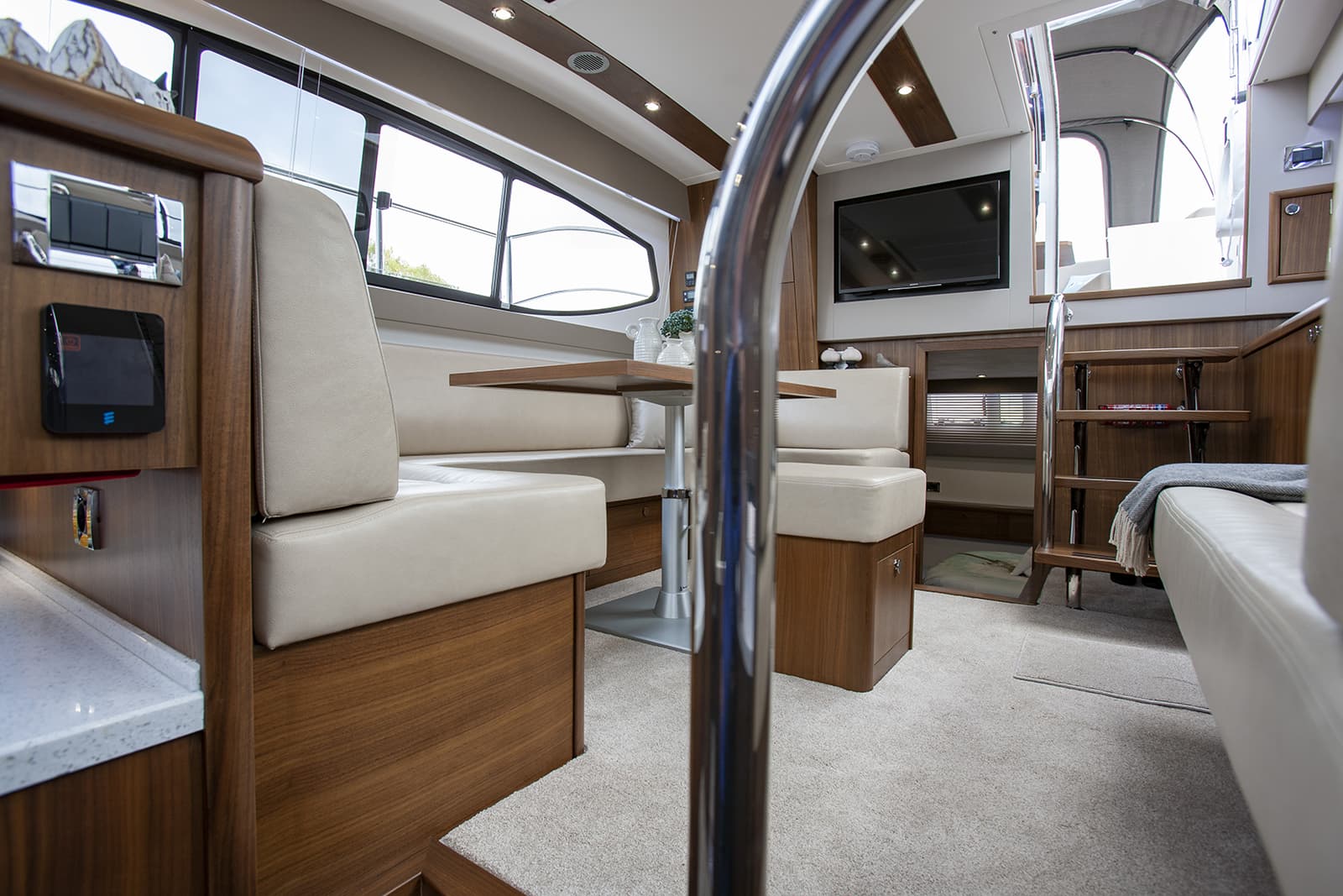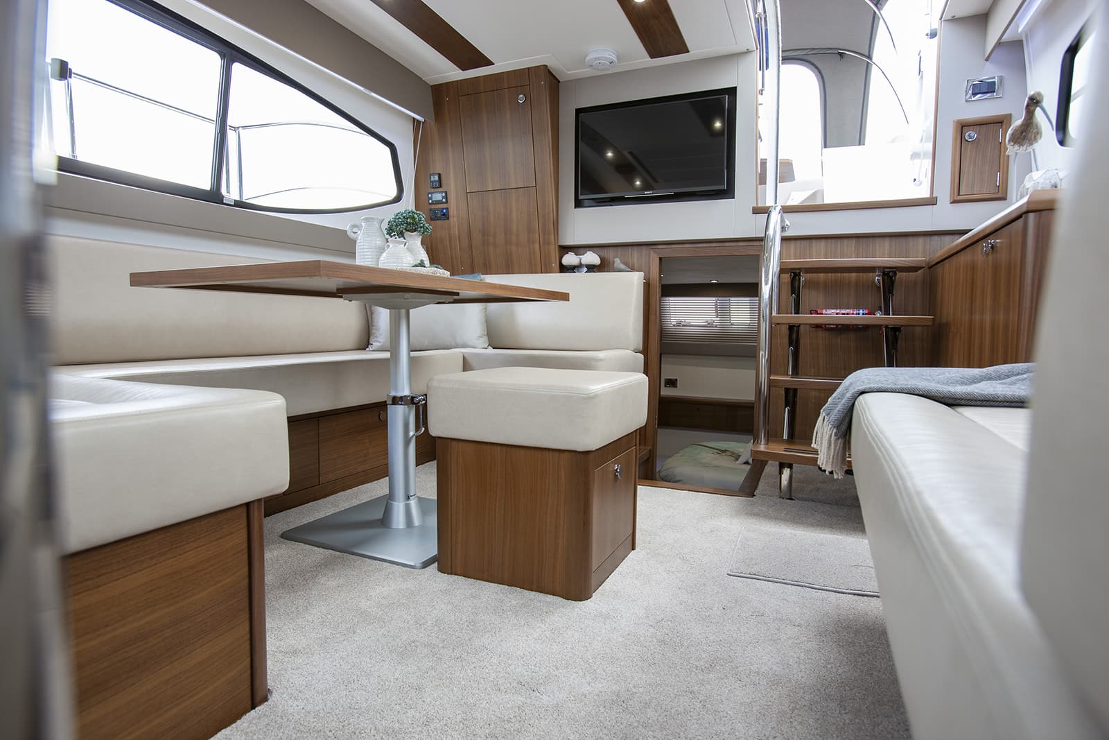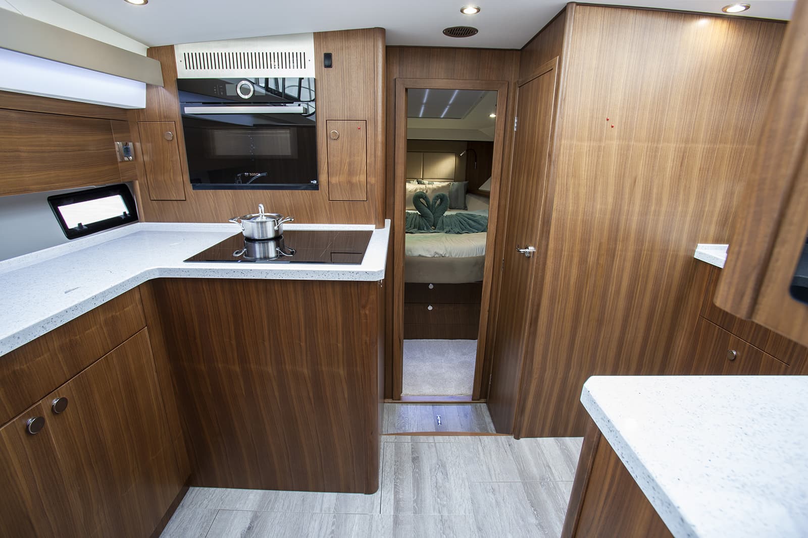 On the aft deck, you’ll find a spacious U-shaped settee, the perfect place to relax and enjoy the panoramic views. The light and airy saloon offers an open and comfortable feel, while the generous, split-level galley provides a practical layout for maximum convenience. Both forward and aft are equipped with spacious cabins, each with its own bathroom, so you and your guests can stay in ultimate comfort. Looking for extra sleeping space? Then opt for a layout with a third cabin, equipped with a bunk bed. The Haines 400 AC is also available in an offshore version with a planing hull, making the yacht a smooth and comfortable cruiser at all speeds. Whether you choose a single or twin engine configuration, the possibilities are endless. With the freedom to fully customize the yacht to your own requirements, the Haines 400 AC offers customization at its best. What does your ideal Haines 400 AC look like?