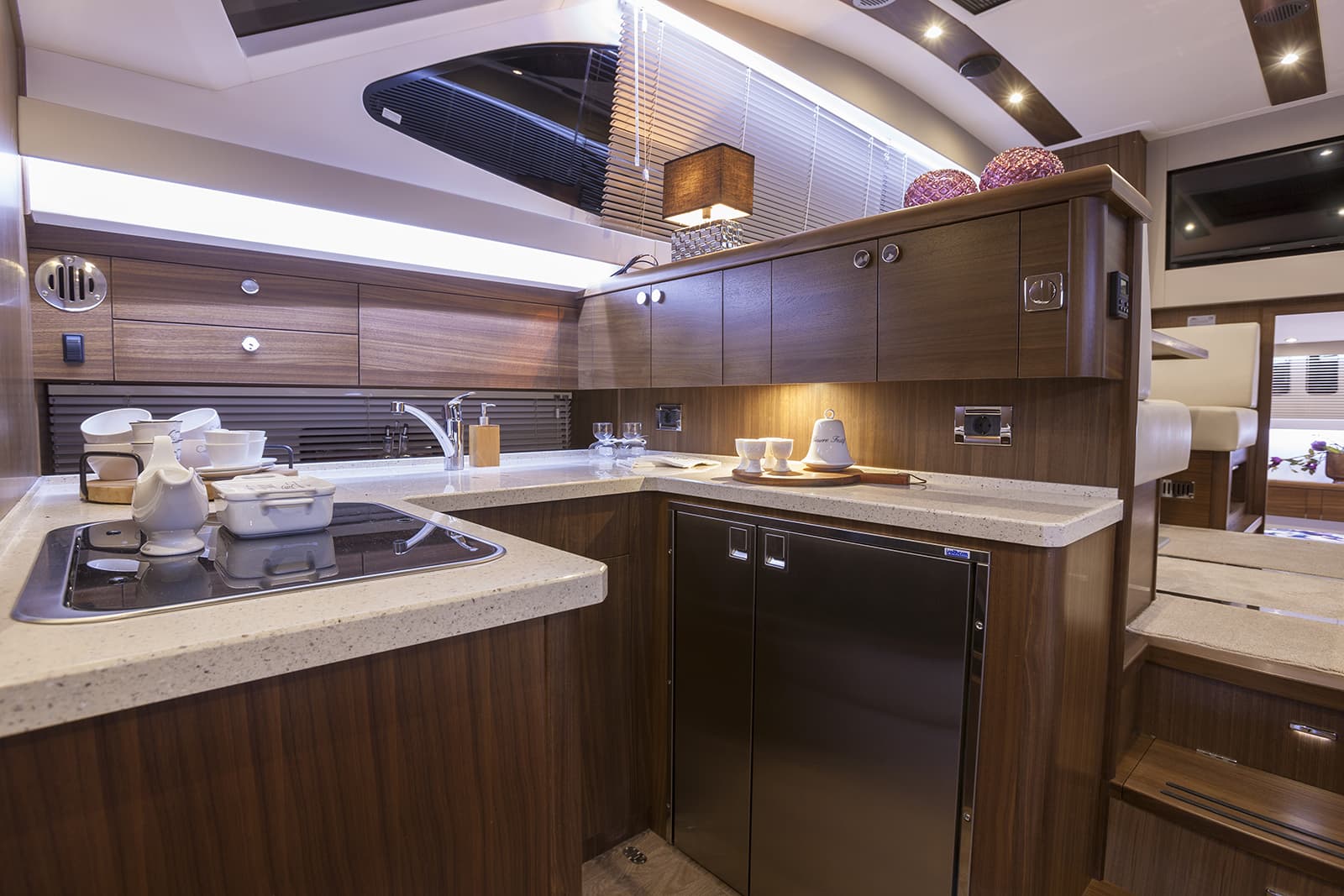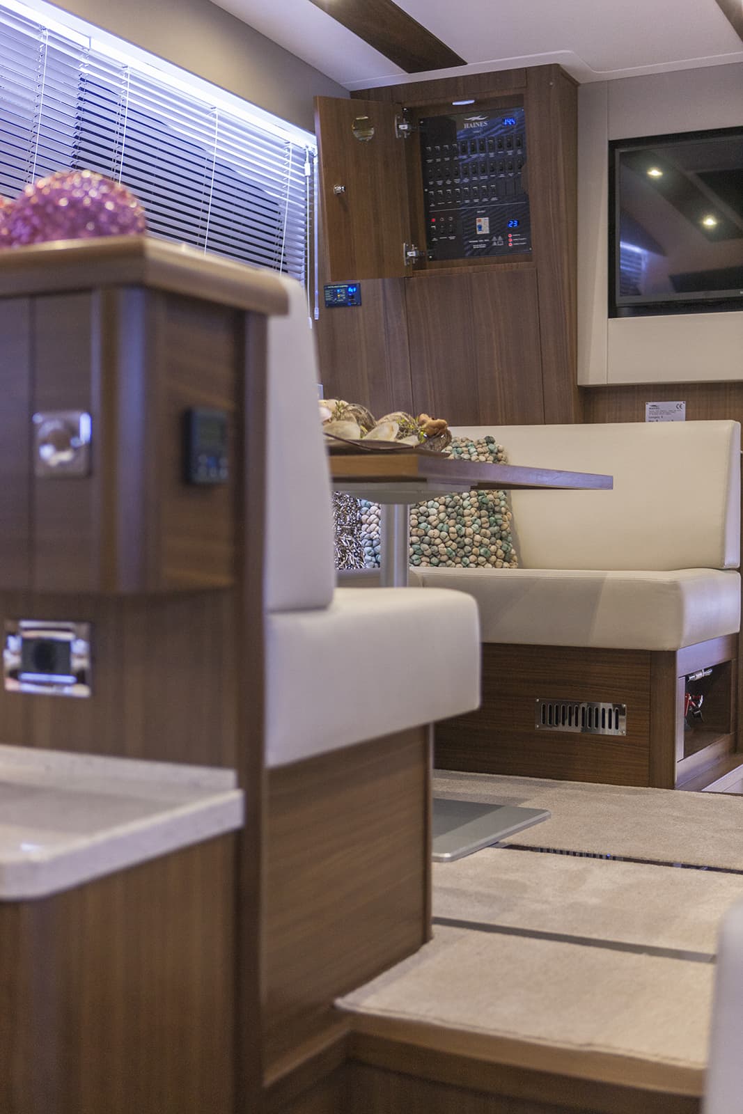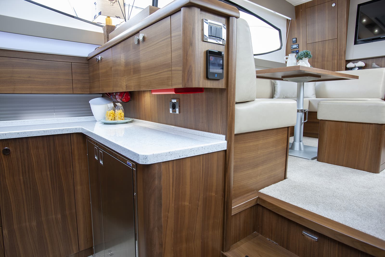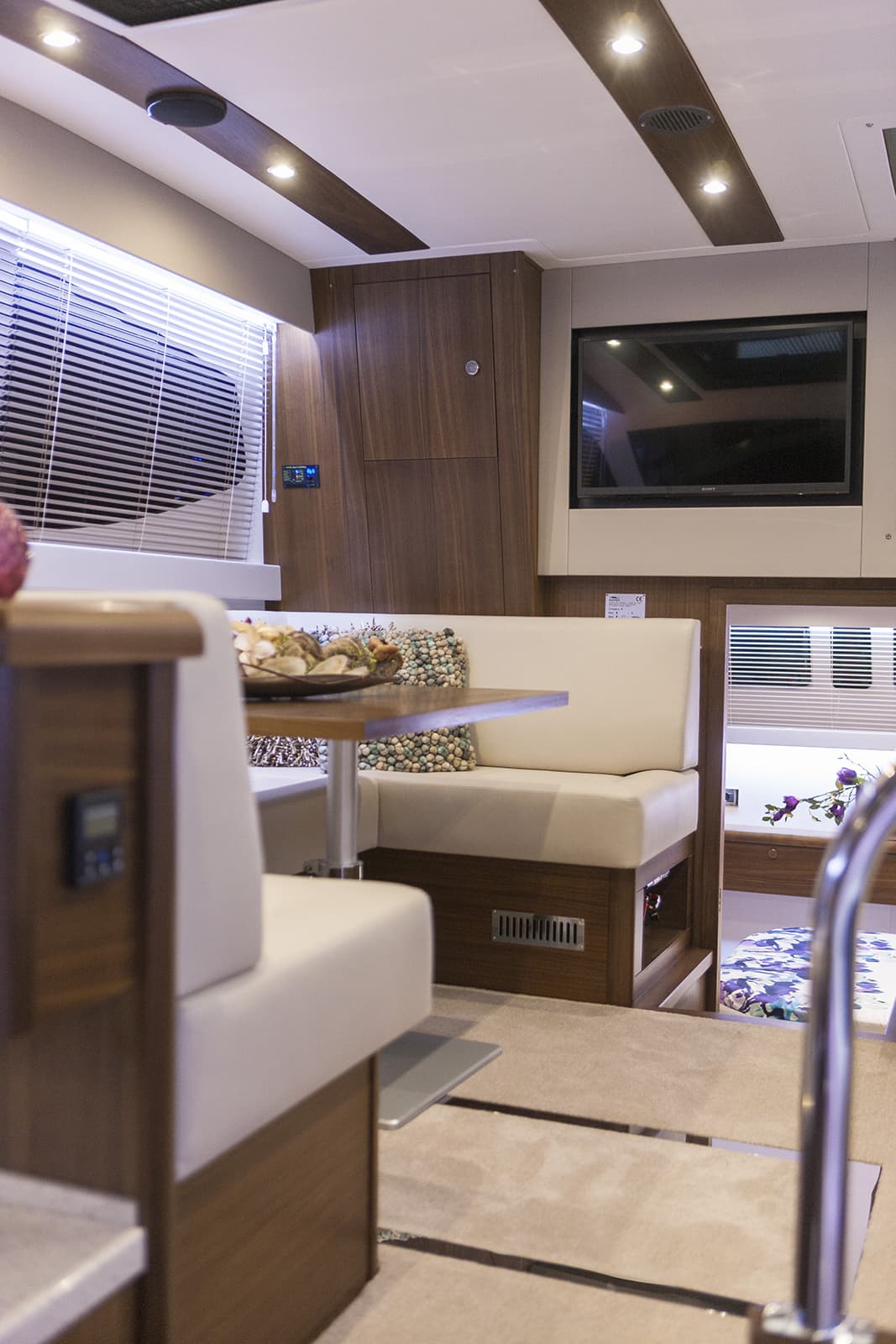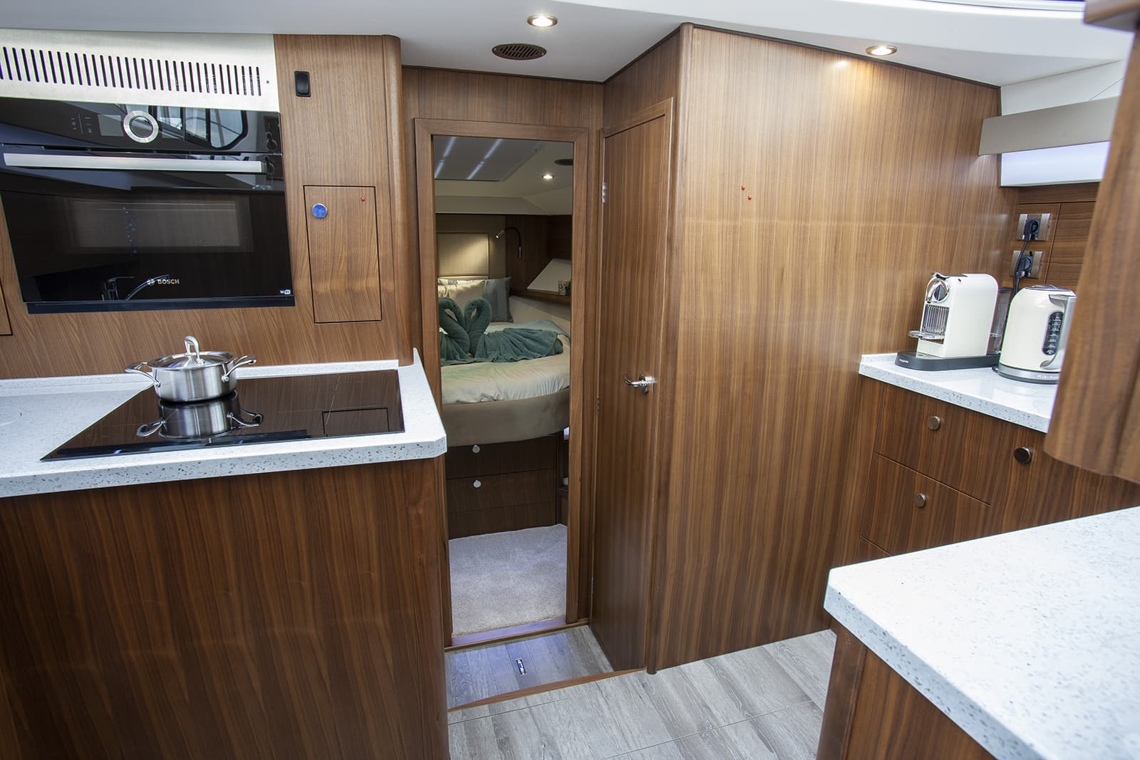 On the aft deck, you’ll find a spacious U-shaped settee, the perfect place to relax and enjoy the panoramic views. The light and airy saloon offers an open and comfortable feel, while the generous, split-level galley provides a practical layout for maximum convenience. Both forward and aft are equipped with spacious cabins, each with its own bathroom, so you and your guests can stay in ultimate comfort. Looking for extra sleeping space? Then opt for a layout with a third cabin, equipped with a bunk bed. The Haines 400 AC is also available in an offshore version with a planing hull, making the yacht a smooth and comfortable cruiser at all speeds. Whether you choose a single or twin engine configuration, the possibilities are endless. With the freedom to fully customize the yacht to your own requirements, the Haines 400 AC offers customization at its best. What does your ideal Haines 400 AC look like?