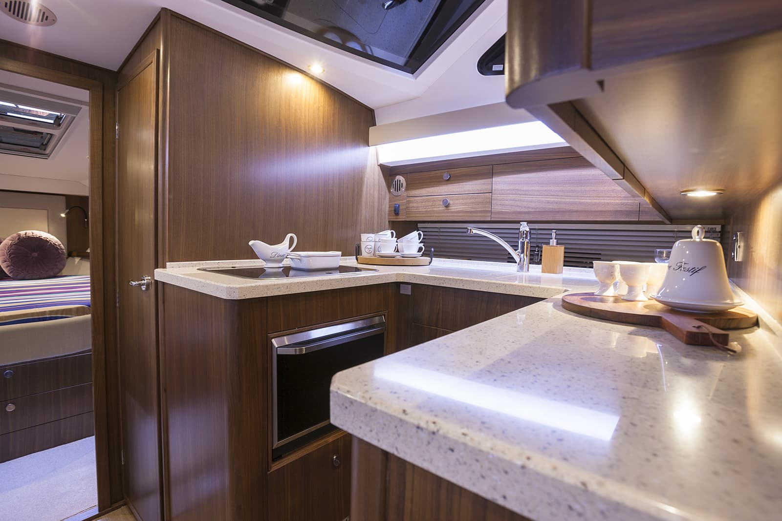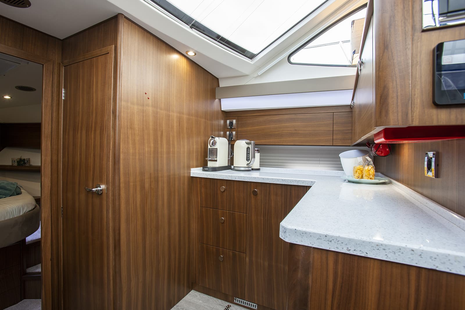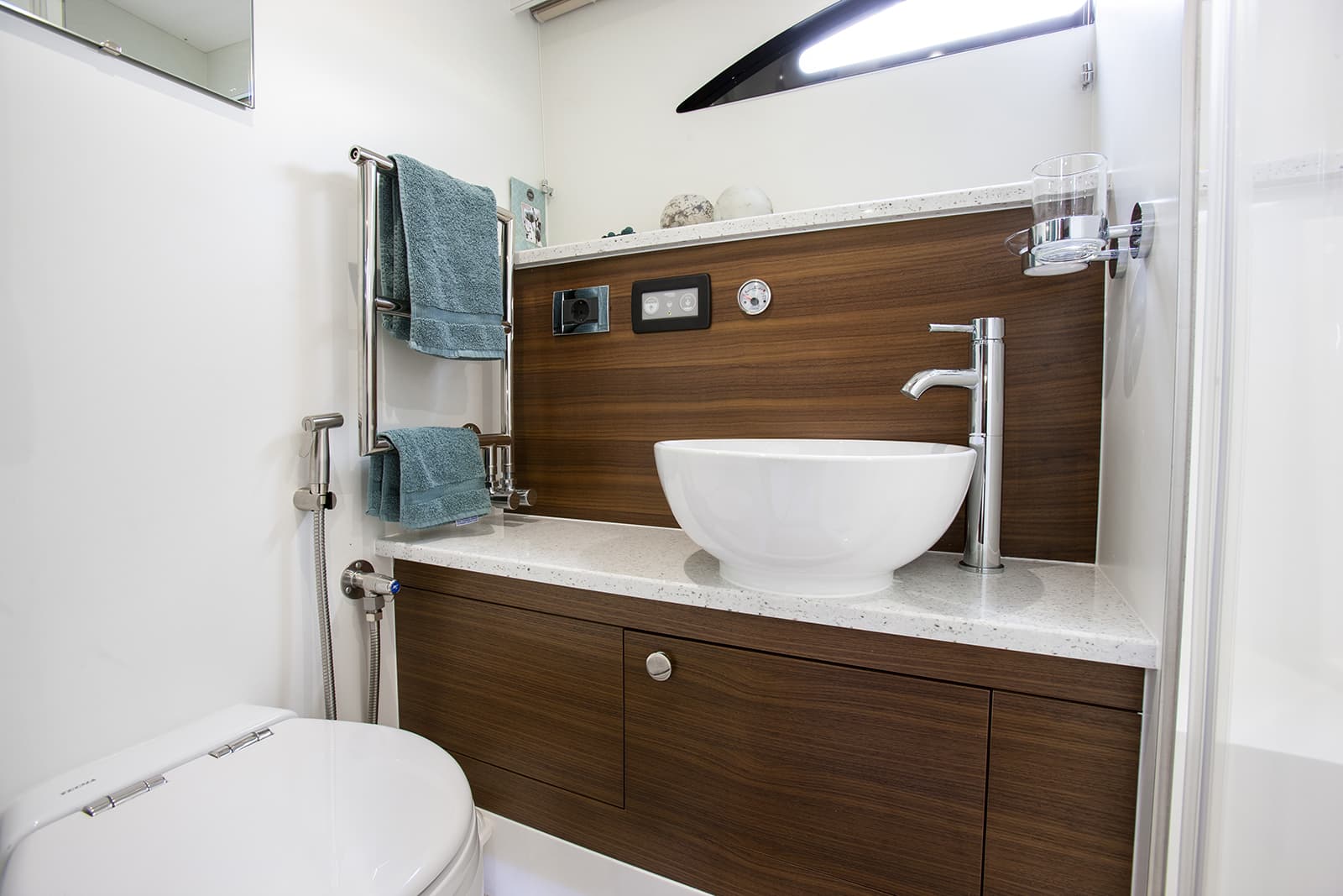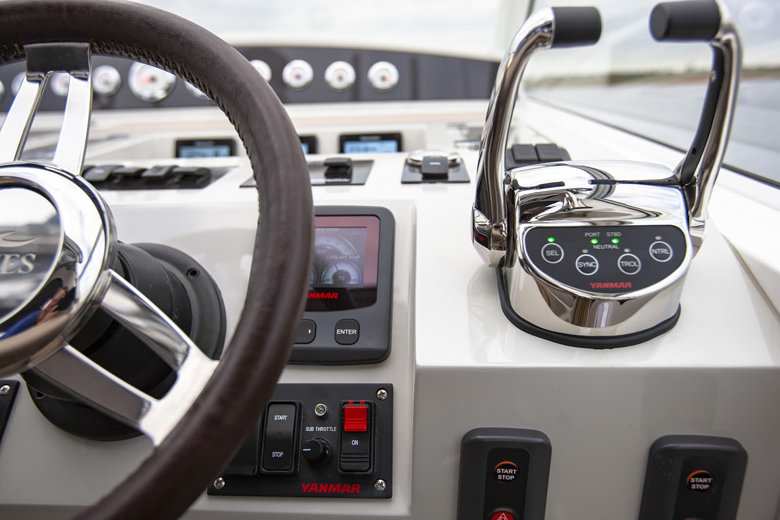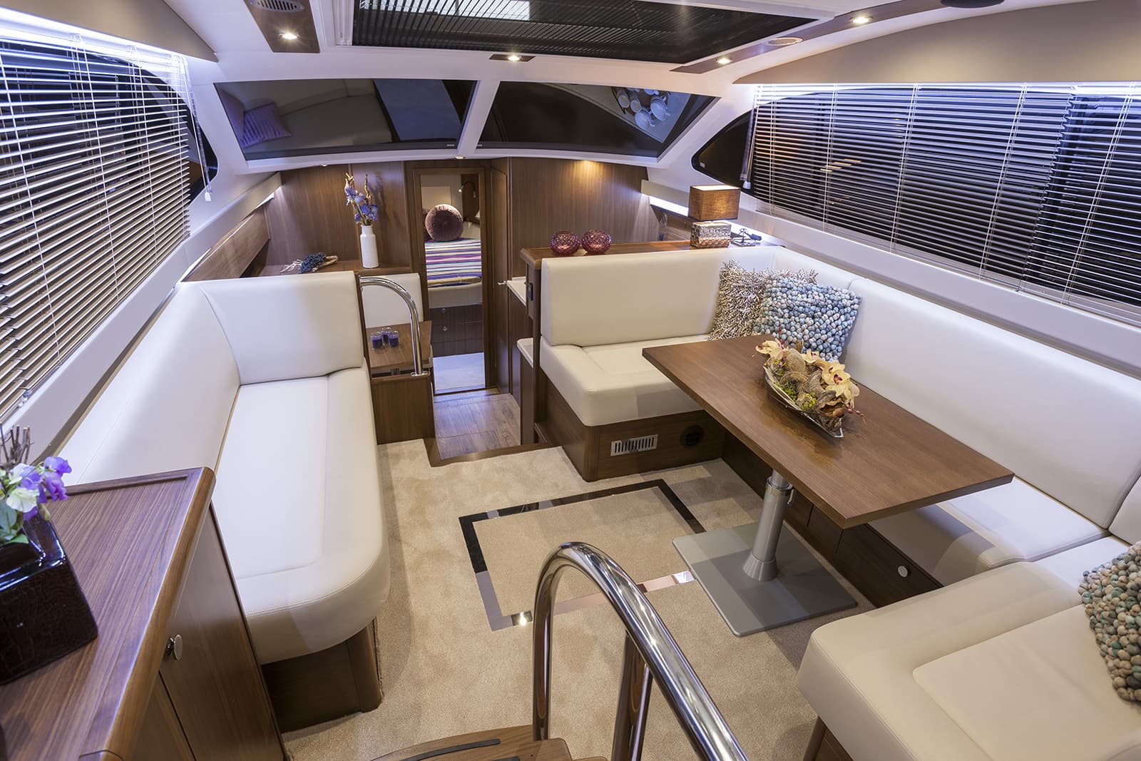On the aft deck, you’ll find a spacious U-shaped settee, the perfect place to relax and enjoy the panoramic views. The light and airy saloon offers an open and comfortable feel, while the generous, split-level galley provides a practical layout for maximum convenience. Both forward and aft are equipped with spacious cabins, each with its own bathroom, so you and your guests can stay in ultimate comfort. Looking for extra sleeping space? Then opt for a layout with a third cabin, equipped with a bunk bed. The Haines 400 AC is also available in an offshore version with a planing hull, making the yacht a smooth and comfortable cruiser at all speeds. Whether you choose a single or twin engine configuration, the possibilities are endless. With the freedom to fully customize the yacht to your own requirements, the Haines 400 AC offers customization at its best. What does your ideal Haines 400 AC look like?