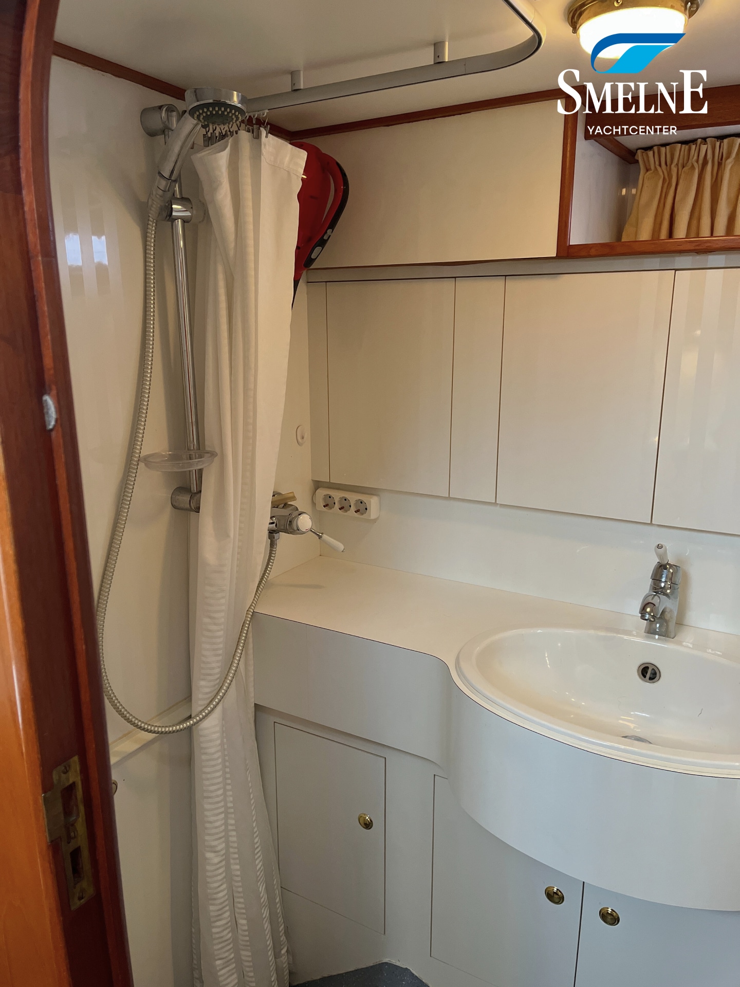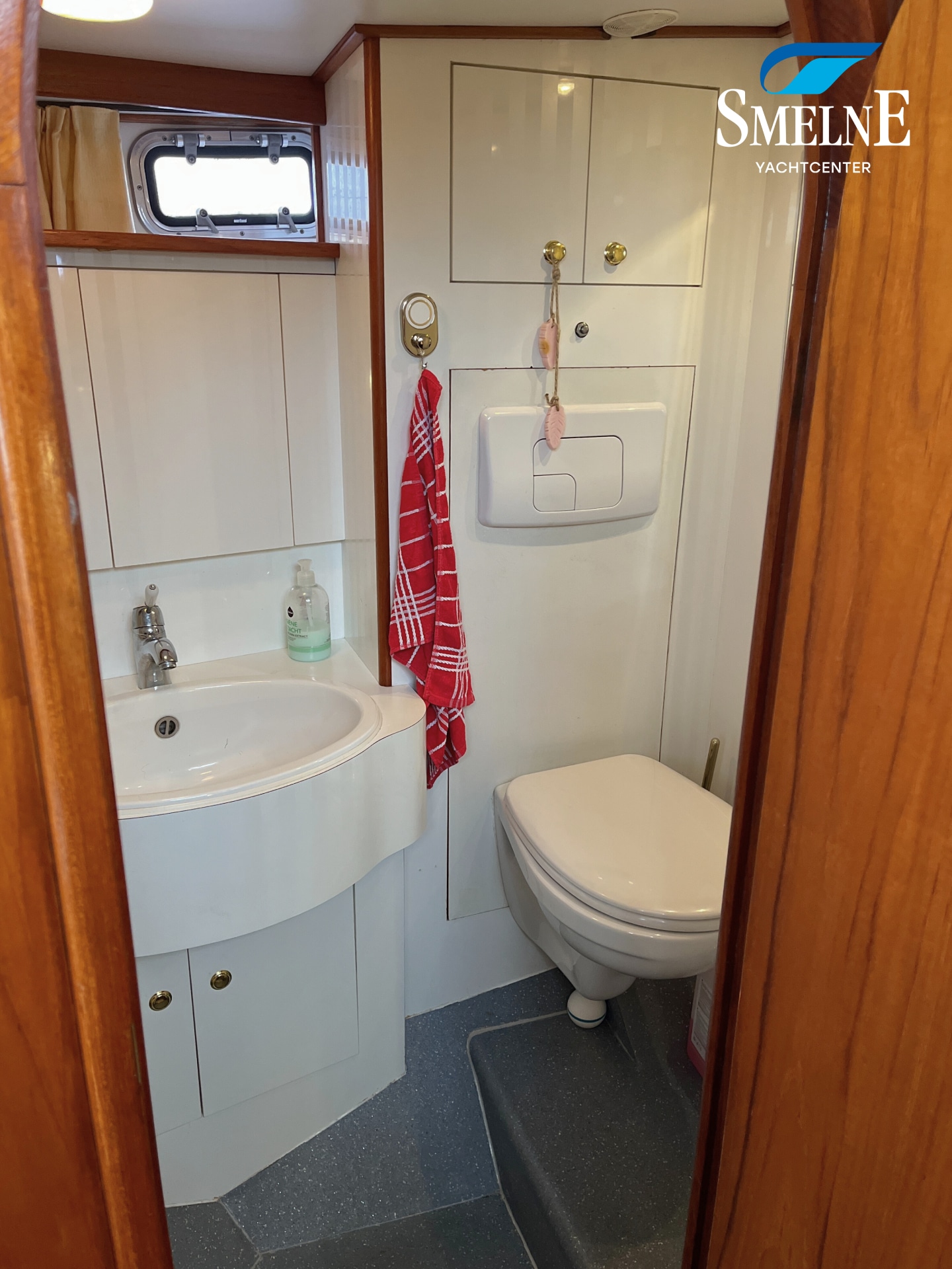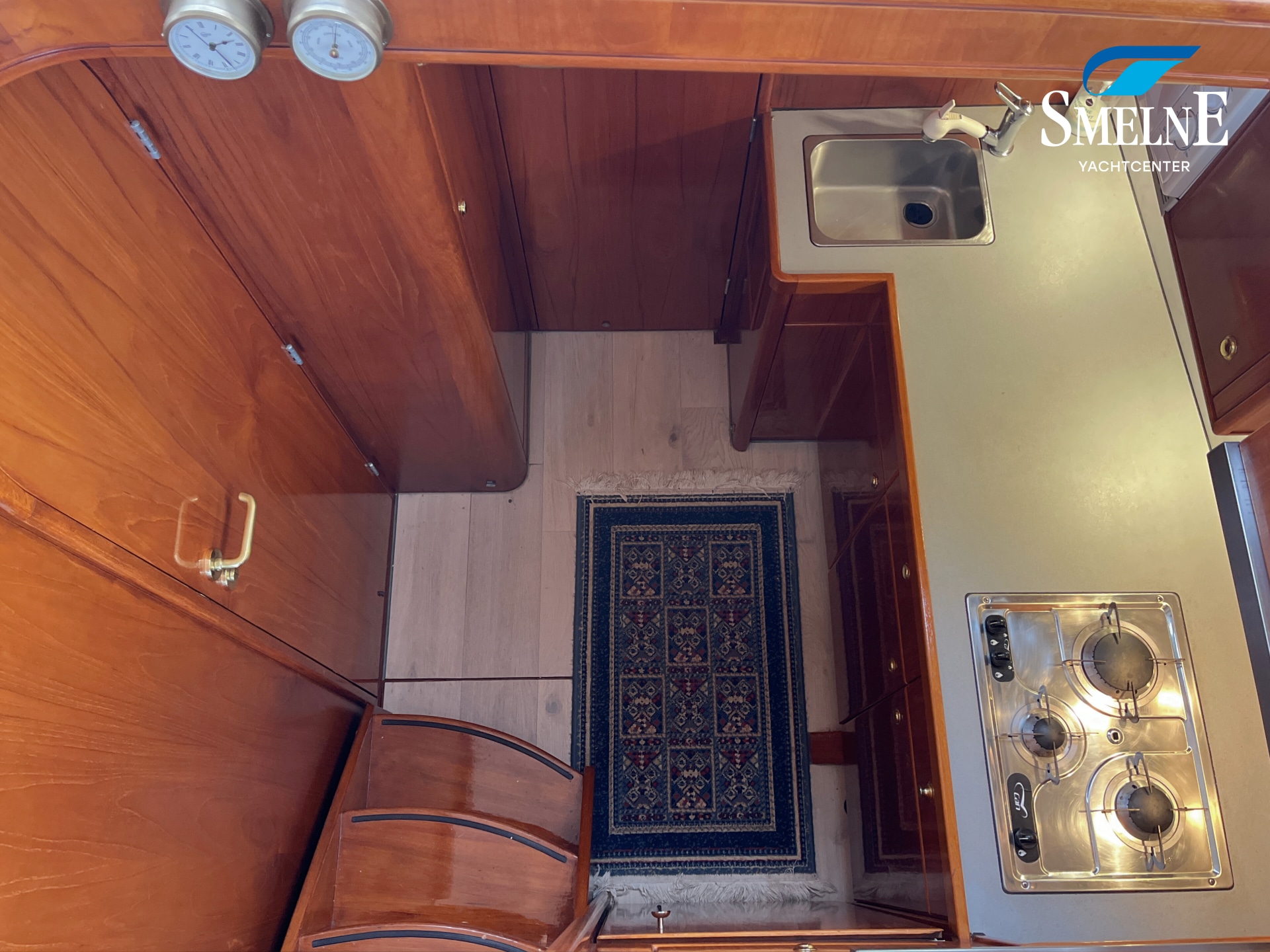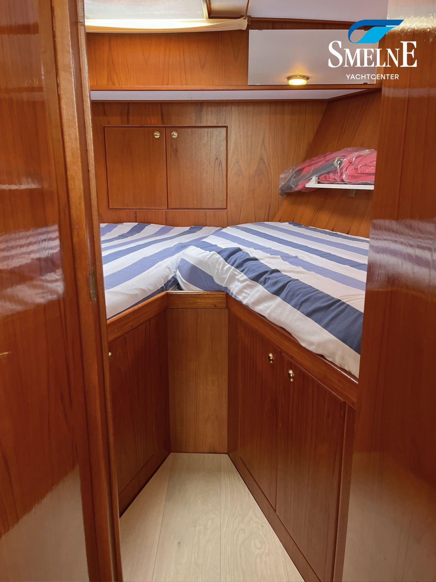 In the bow, one level lower, are the galley, sanitary room, and sleeping cabin. The fully equipped galley is ideal for preparing delicious meals on board. The sanitary room features an electric toilet, washbasin, and shower. The forward cabin accommodates a double bed and a single bed. All spaces are cleverly laid out and offer ample storage space, optimally combining comfort and functionality.