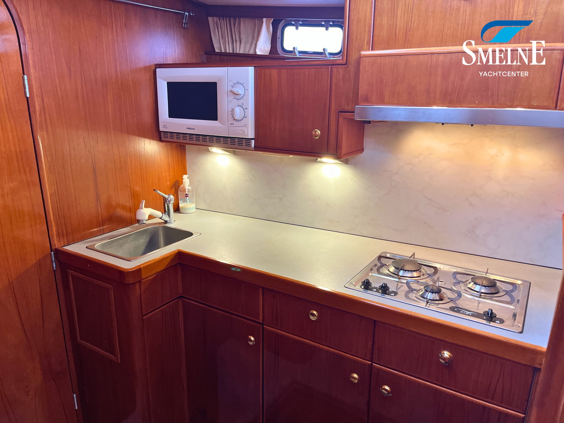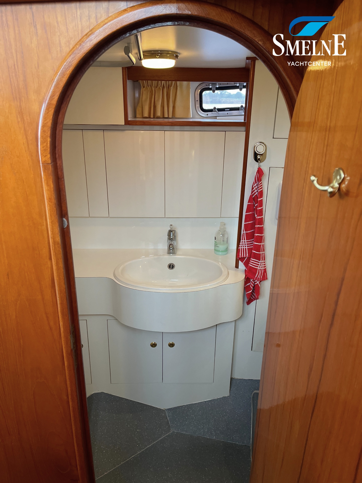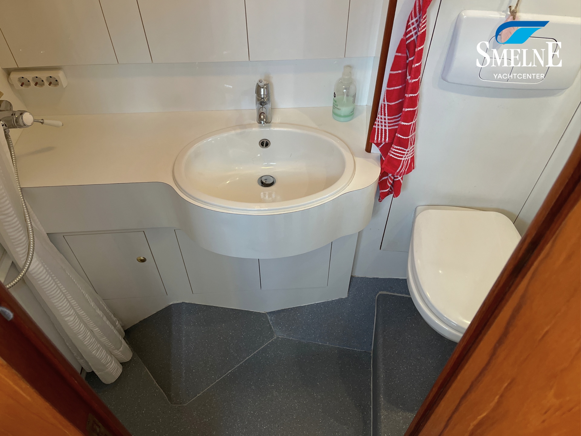 In the bow, one level lower, are the galley, sanitary room, and sleeping cabin. The fully equipped galley is ideal for preparing delicious meals on board. The sanitary room features an electric toilet, washbasin, and shower. The forward cabin accommodates a double bed and a single bed. All spaces are cleverly laid out and offer ample storage space, optimally combining comfort and functionality.