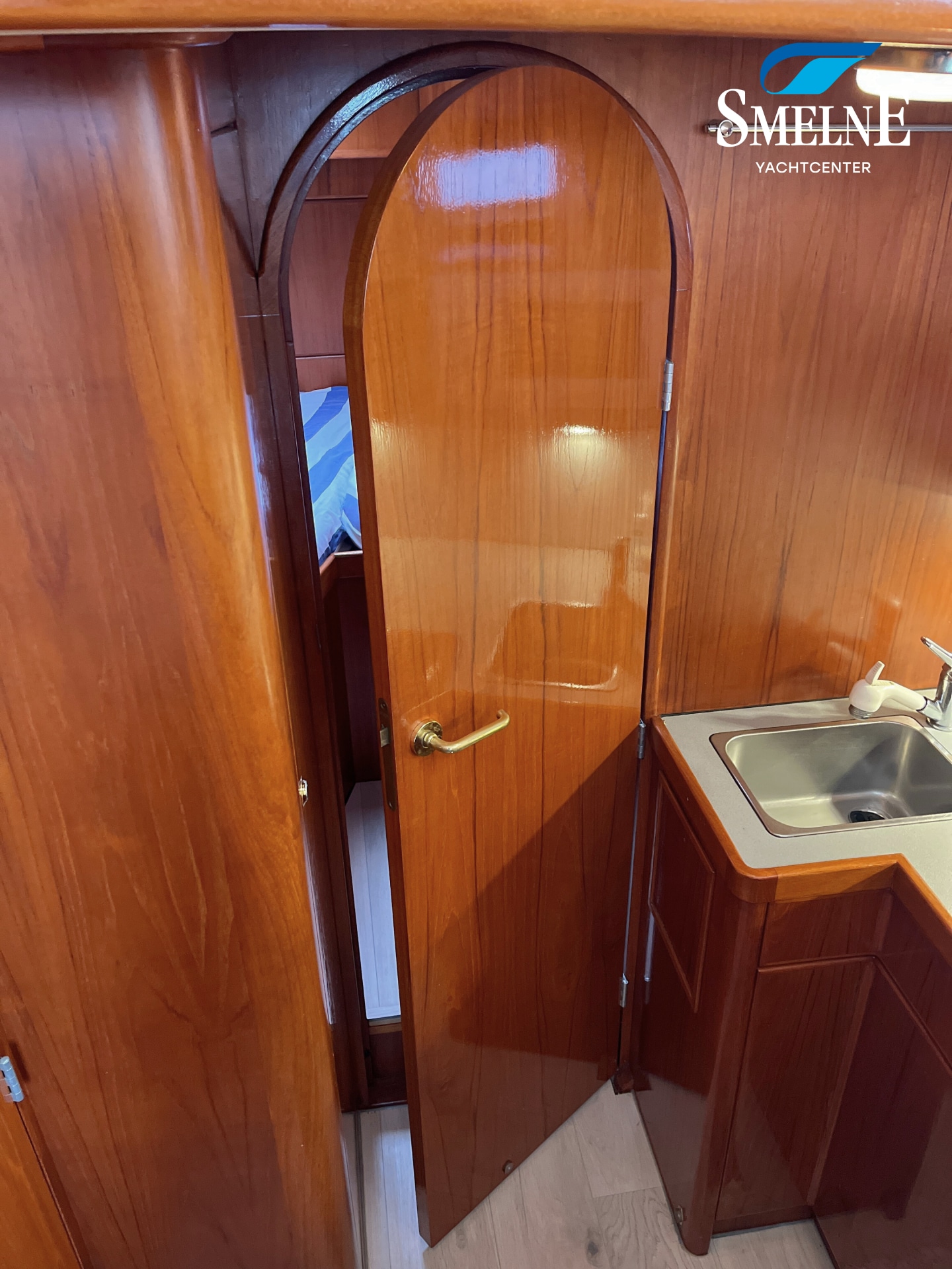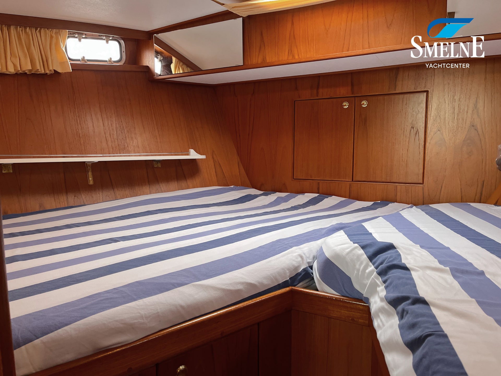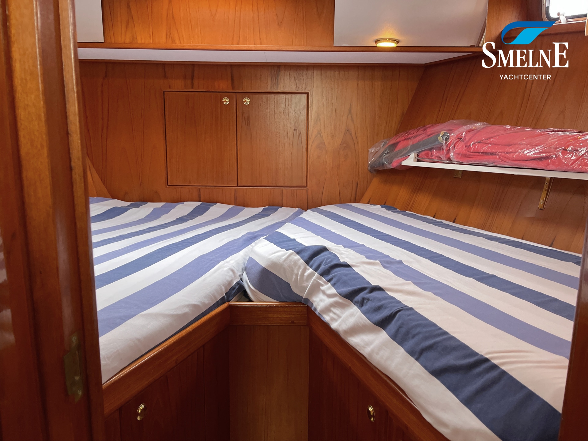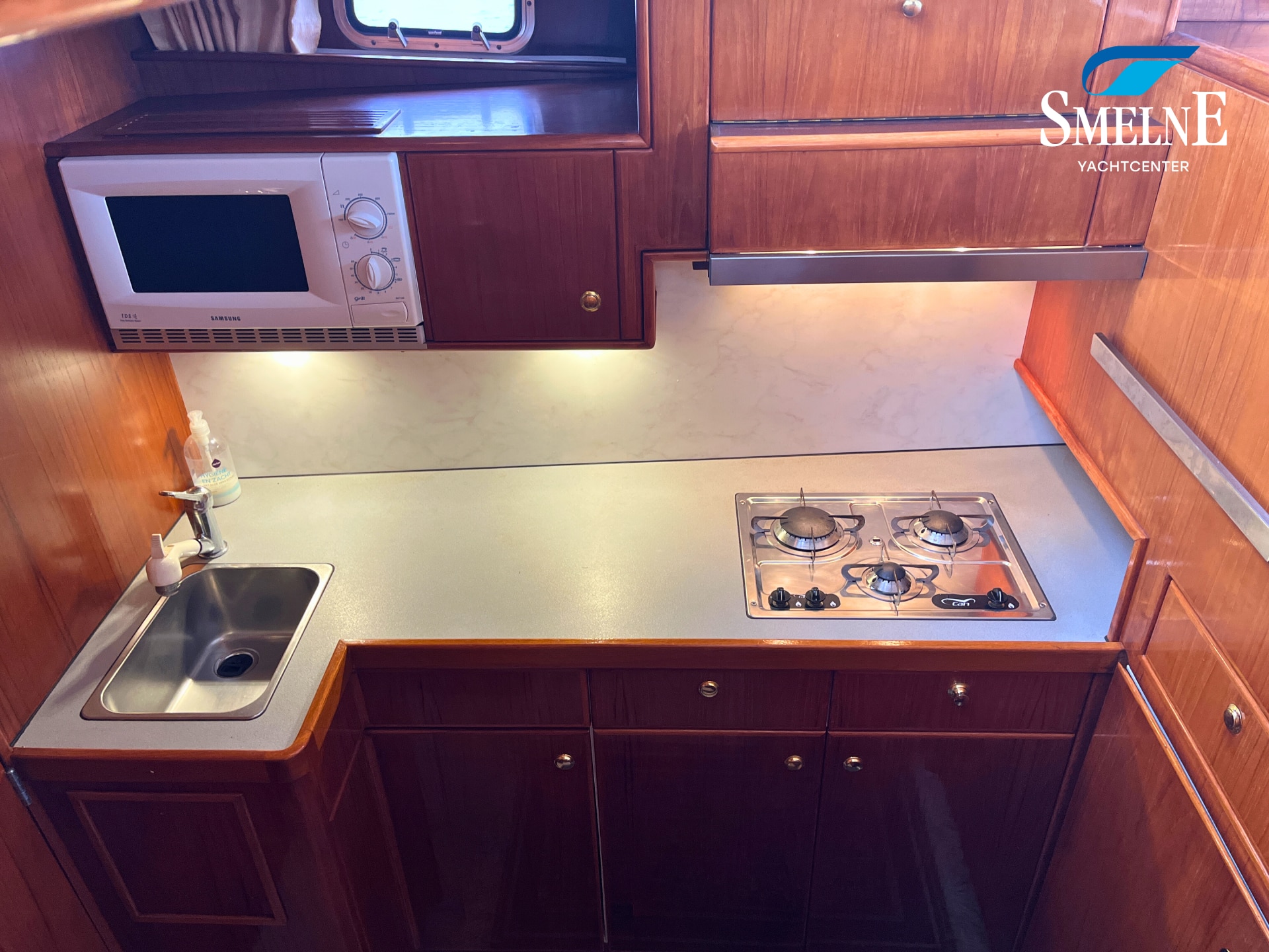 In the bow, one level lower, are the galley, sanitary room, and sleeping cabin. The fully equipped galley is ideal for preparing delicious meals on board. The sanitary room features an electric toilet, washbasin, and shower. The forward cabin accommodates a double bed and a single bed. All spaces are cleverly laid out and offer ample storage space, optimally combining comfort and functionality.