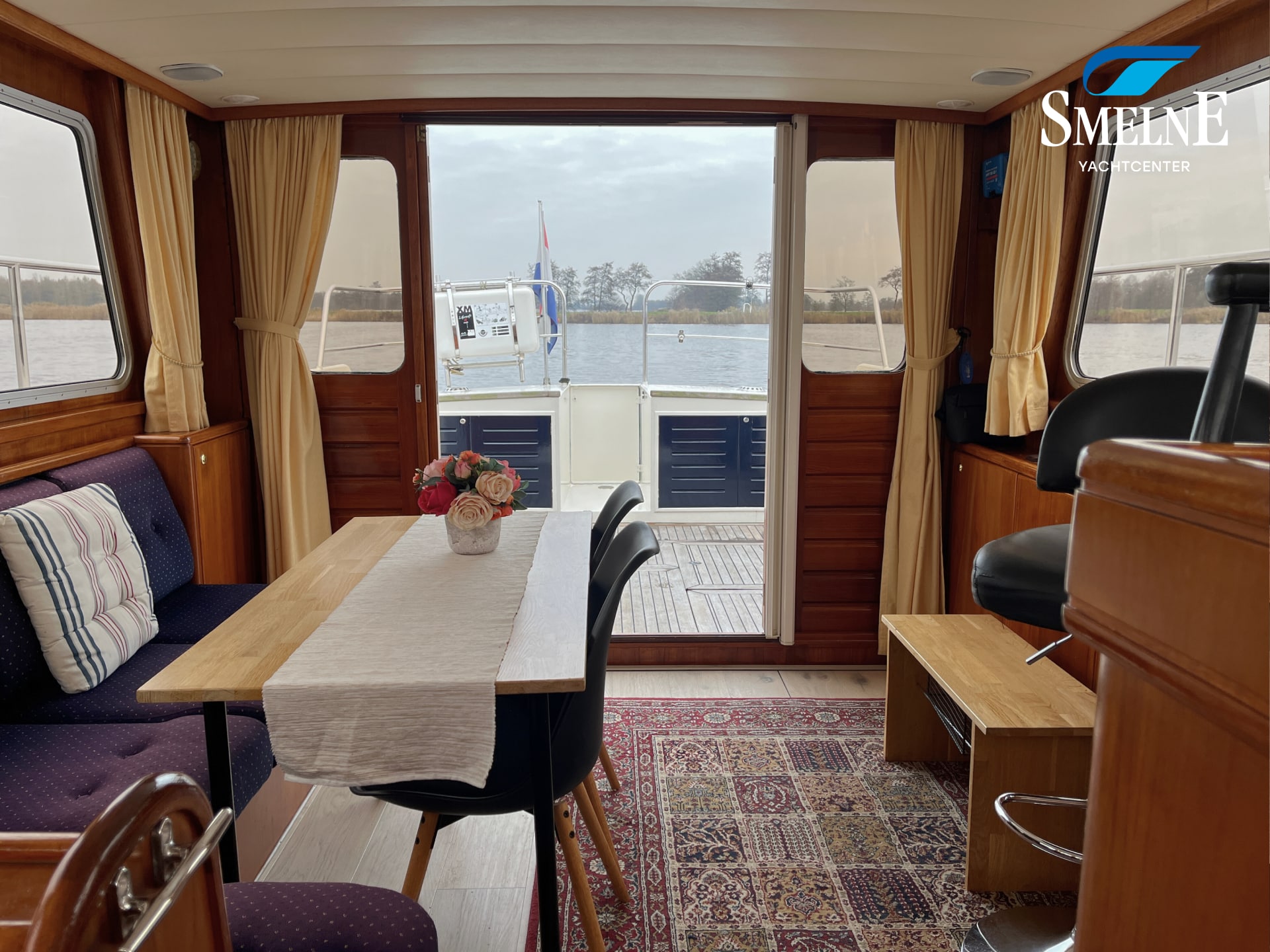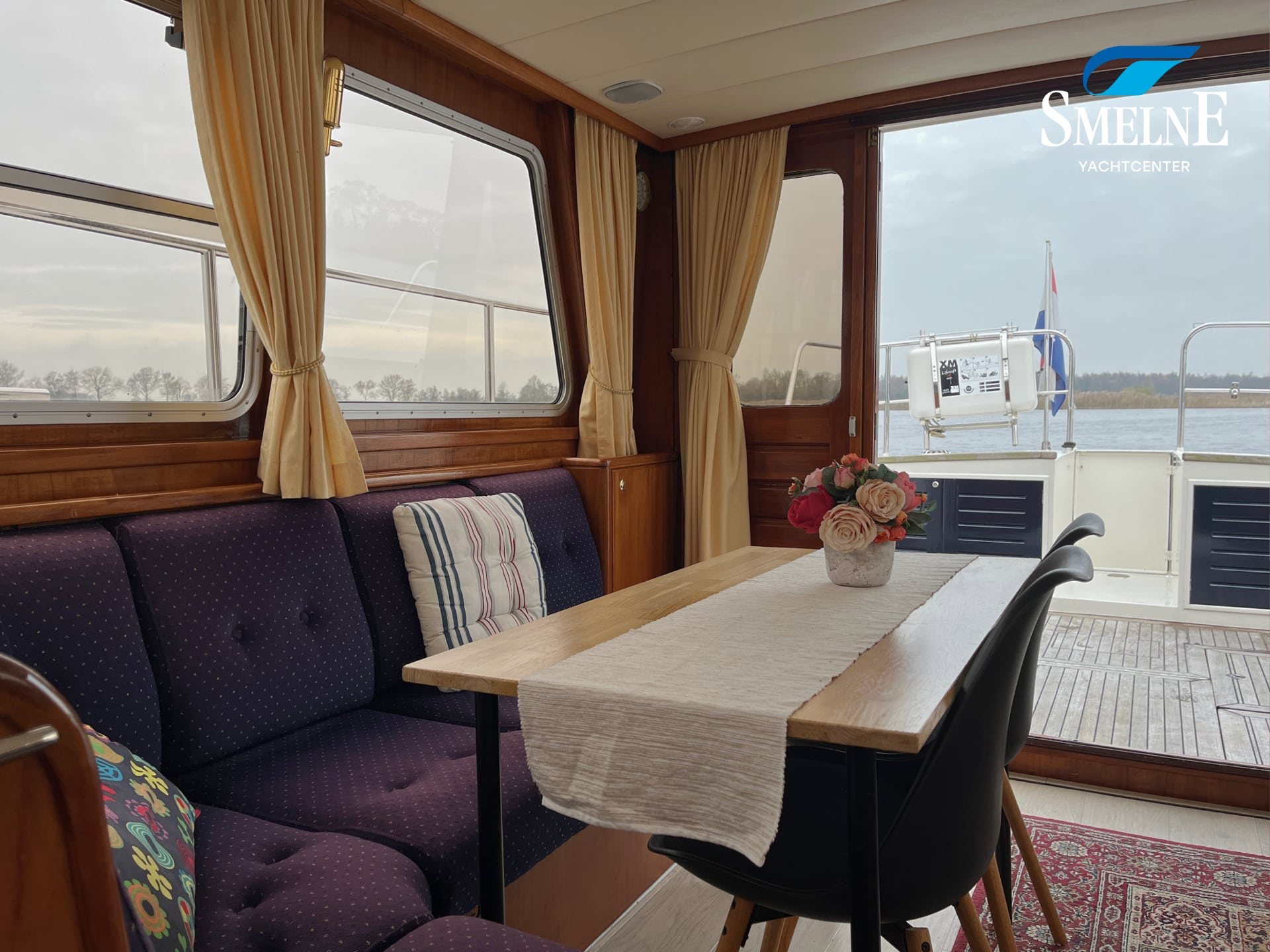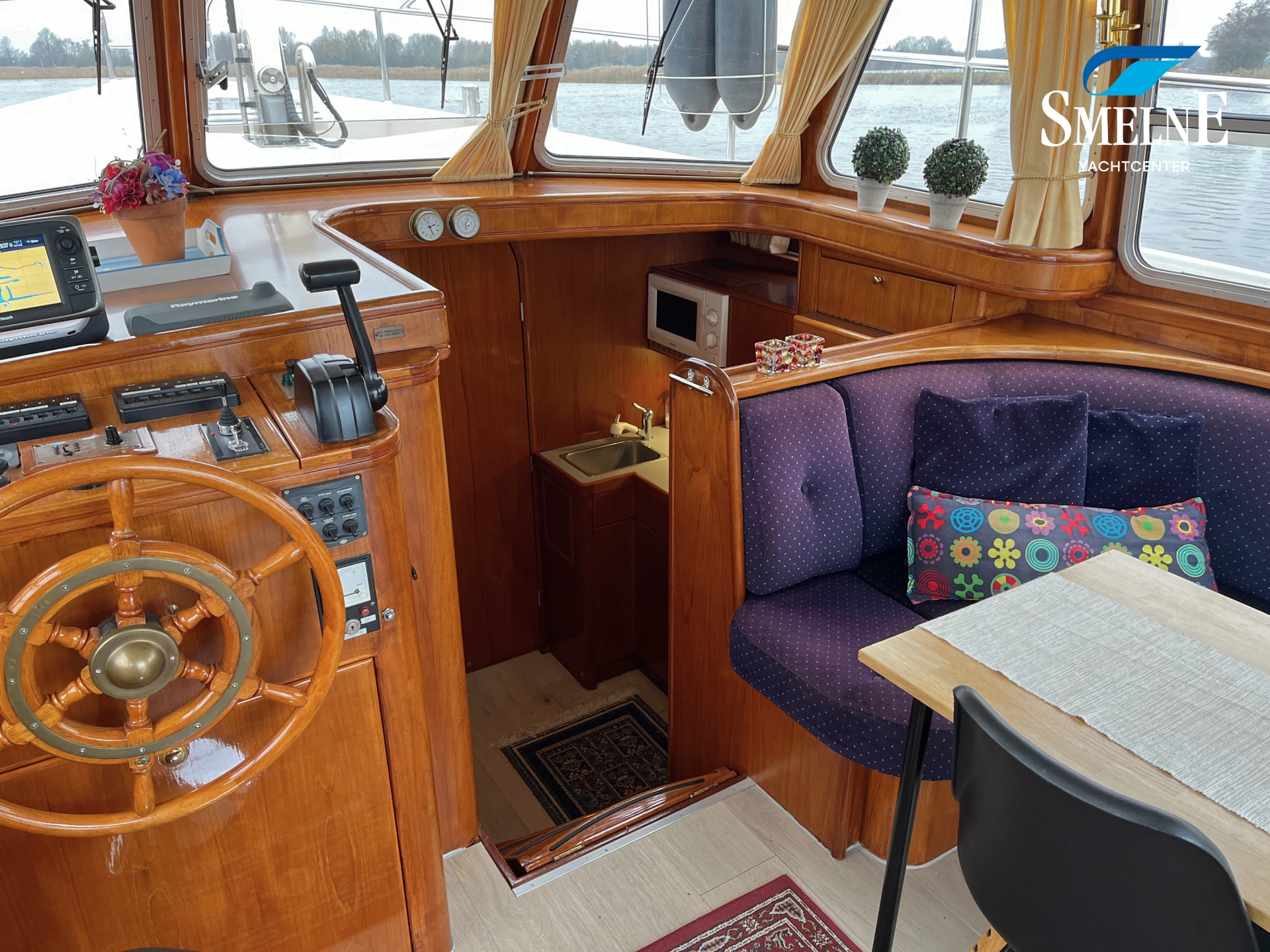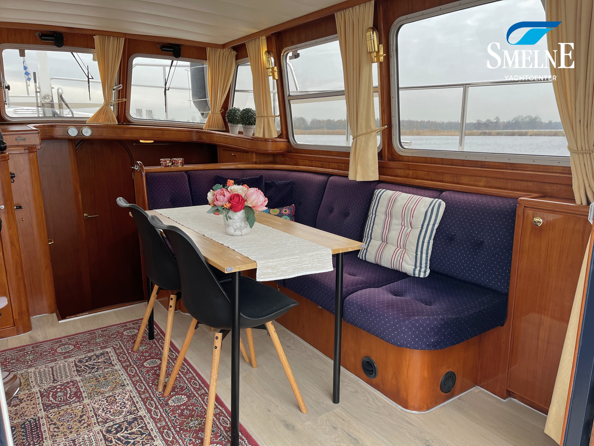 The spacious open cockpit spans the full width of the boat and offers ample living and storage space, while a transom door provides direct access to the bathing platform. The saloon is on the same level as the cockpit and is accessible via opening doors. Inside, you'll find a comfortable L-shaped settee, a cabinet wall, and an steering position. Thanks to the lowered windows, you can enjoy excellent all-round visibility. There's also ample storage space beneath the saloon floor.