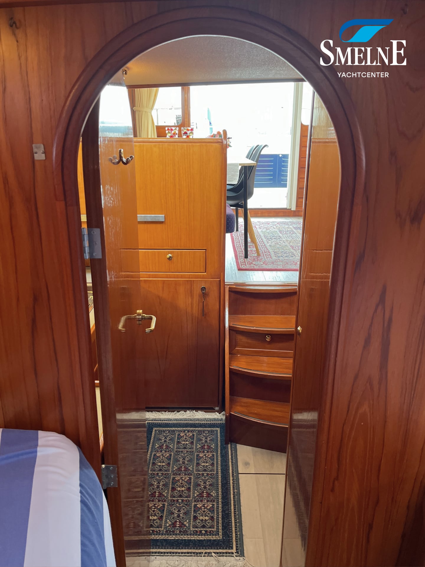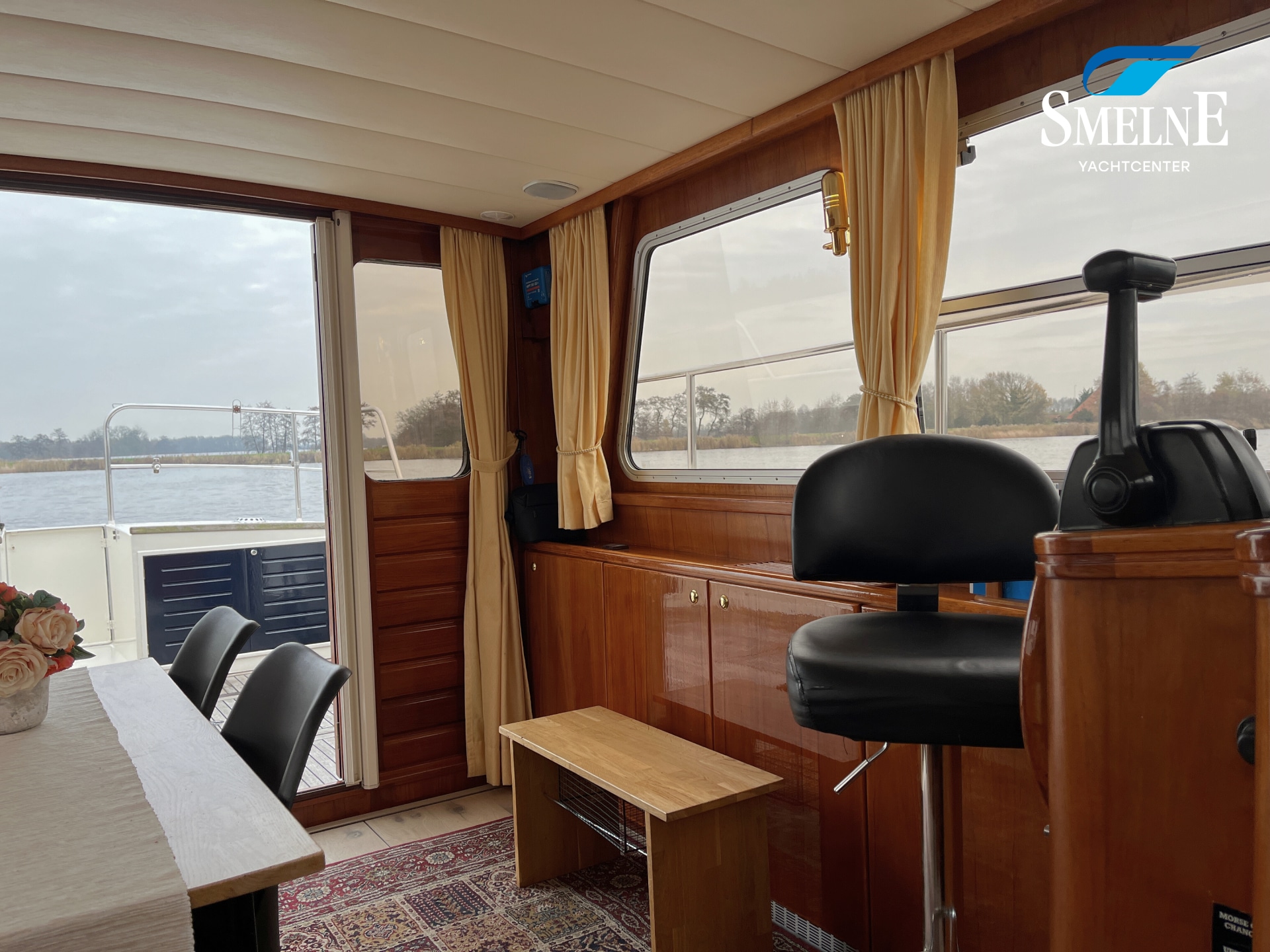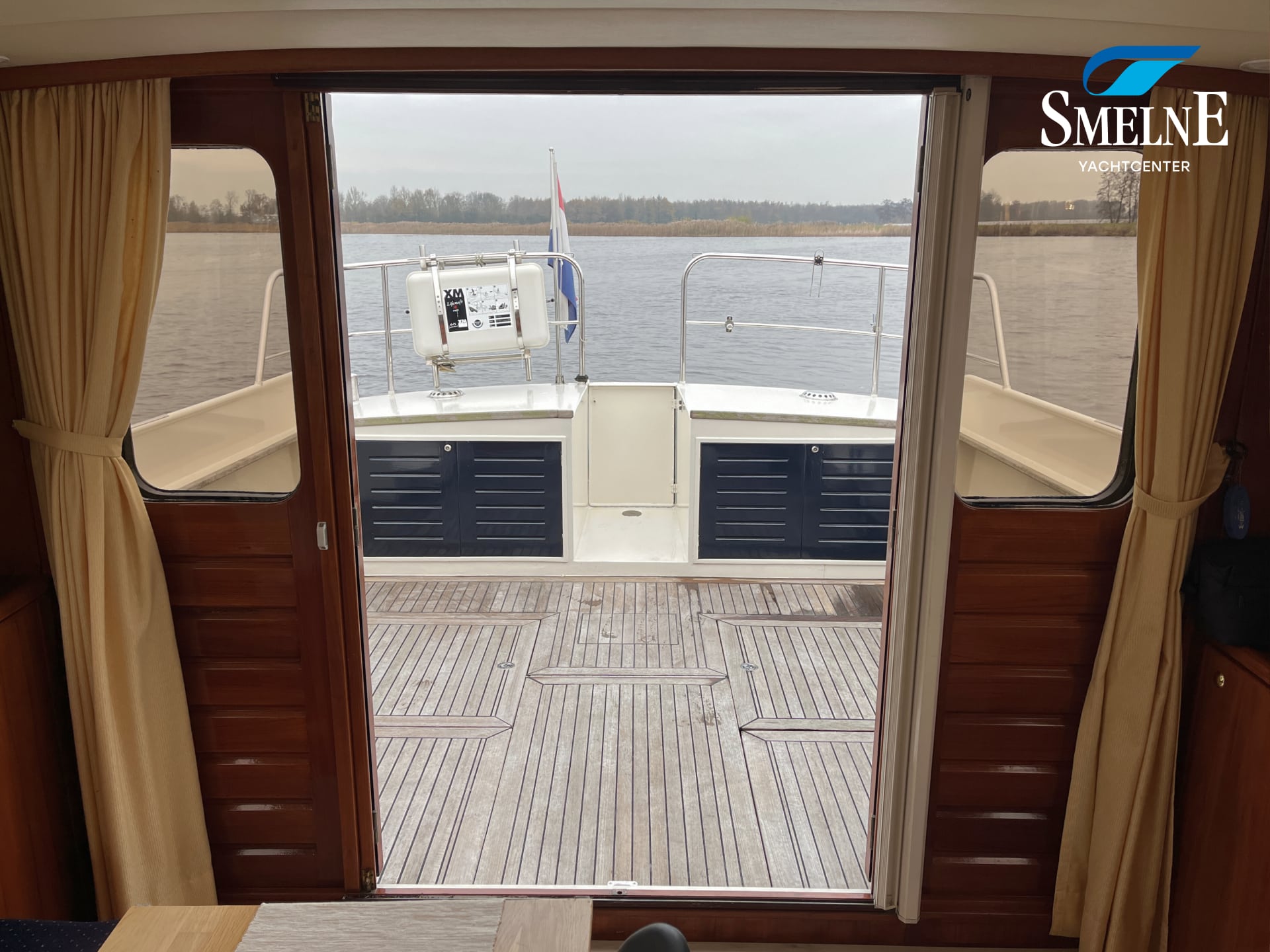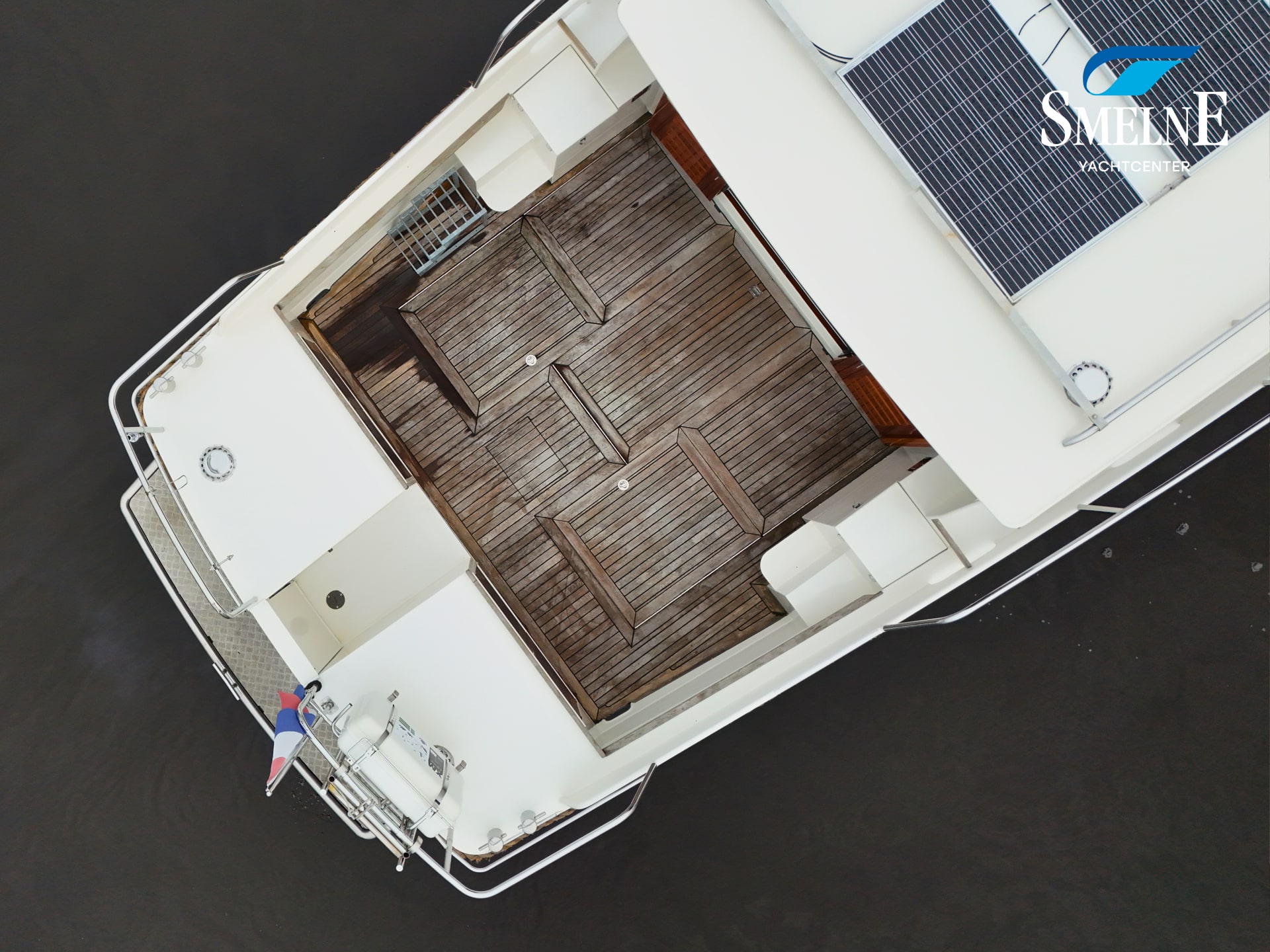The spacious open cockpit spans the full width of the boat and offers ample living and storage space, while a transom door provides direct access to the bathing platform. The saloon is on the same level as the cockpit and is accessible via opening doors. Inside, you'll find a comfortable L-shaped settee, a cabinet wall, and an steering position. Thanks to the lowered windows, you can enjoy excellent all-round visibility. There's also ample storage space beneath the saloon floor.