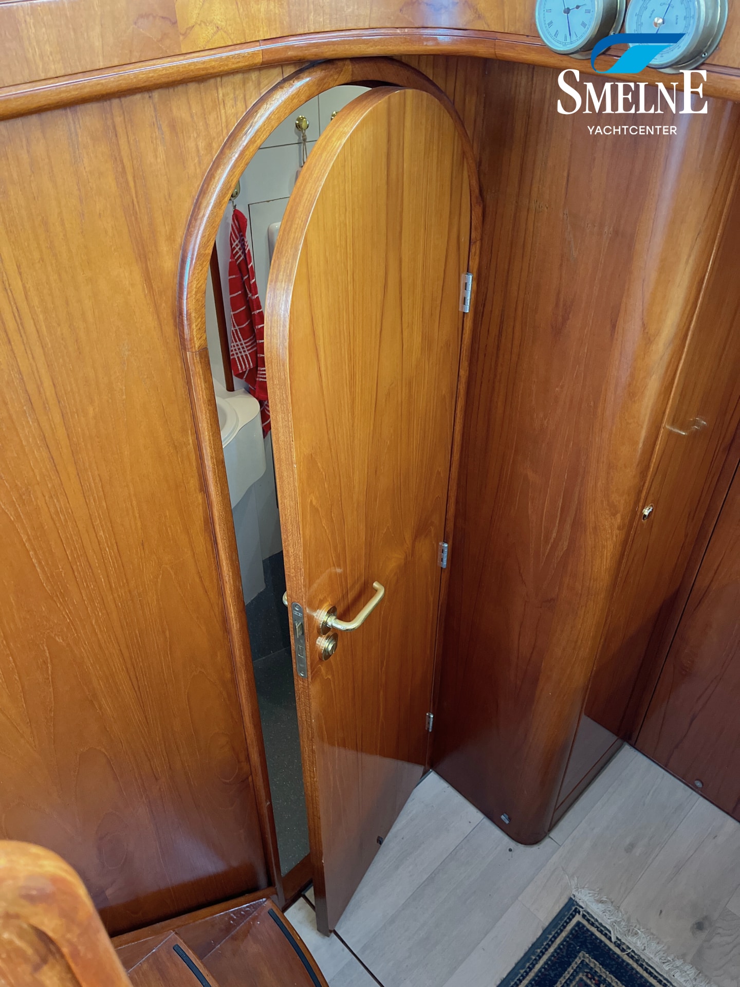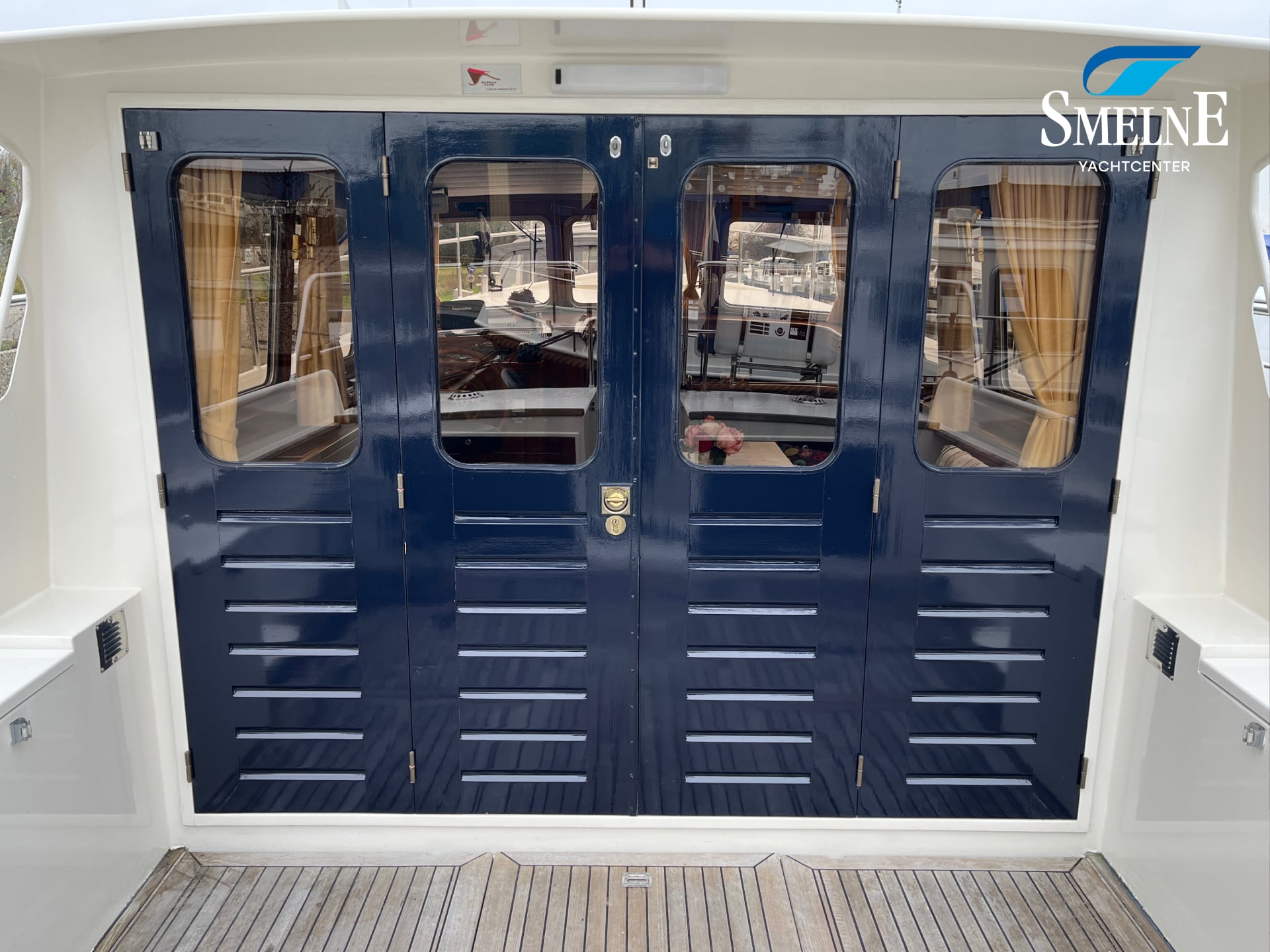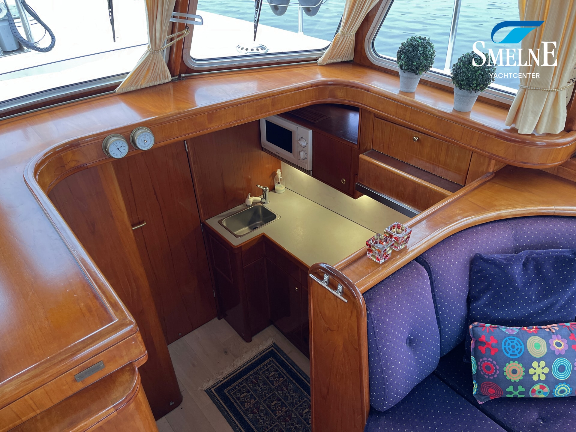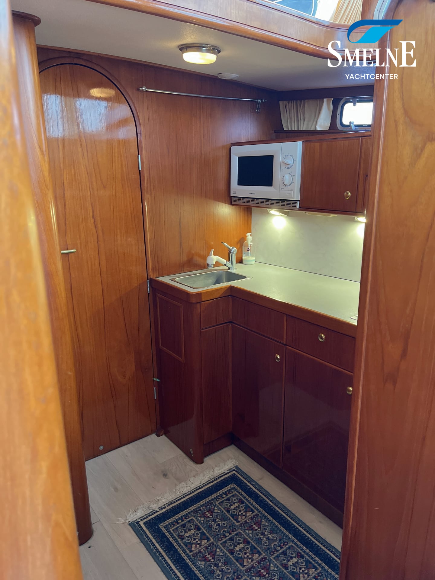 The spacious open cockpit spans the full width of the boat and offers ample living and storage space, while a transom door provides direct access to the bathing platform. The saloon is on the same level as the cockpit and is accessible via opening doors. Inside, you'll find a comfortable L-shaped settee, a cabinet wall, and an steering position. Thanks to the lowered windows, you can enjoy excellent all-round visibility. There's also ample storage space beneath the saloon floor.