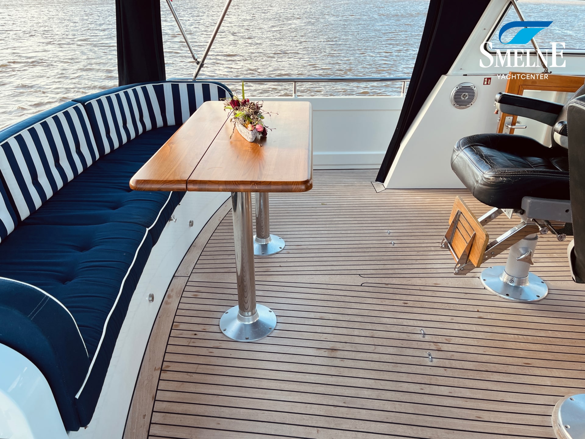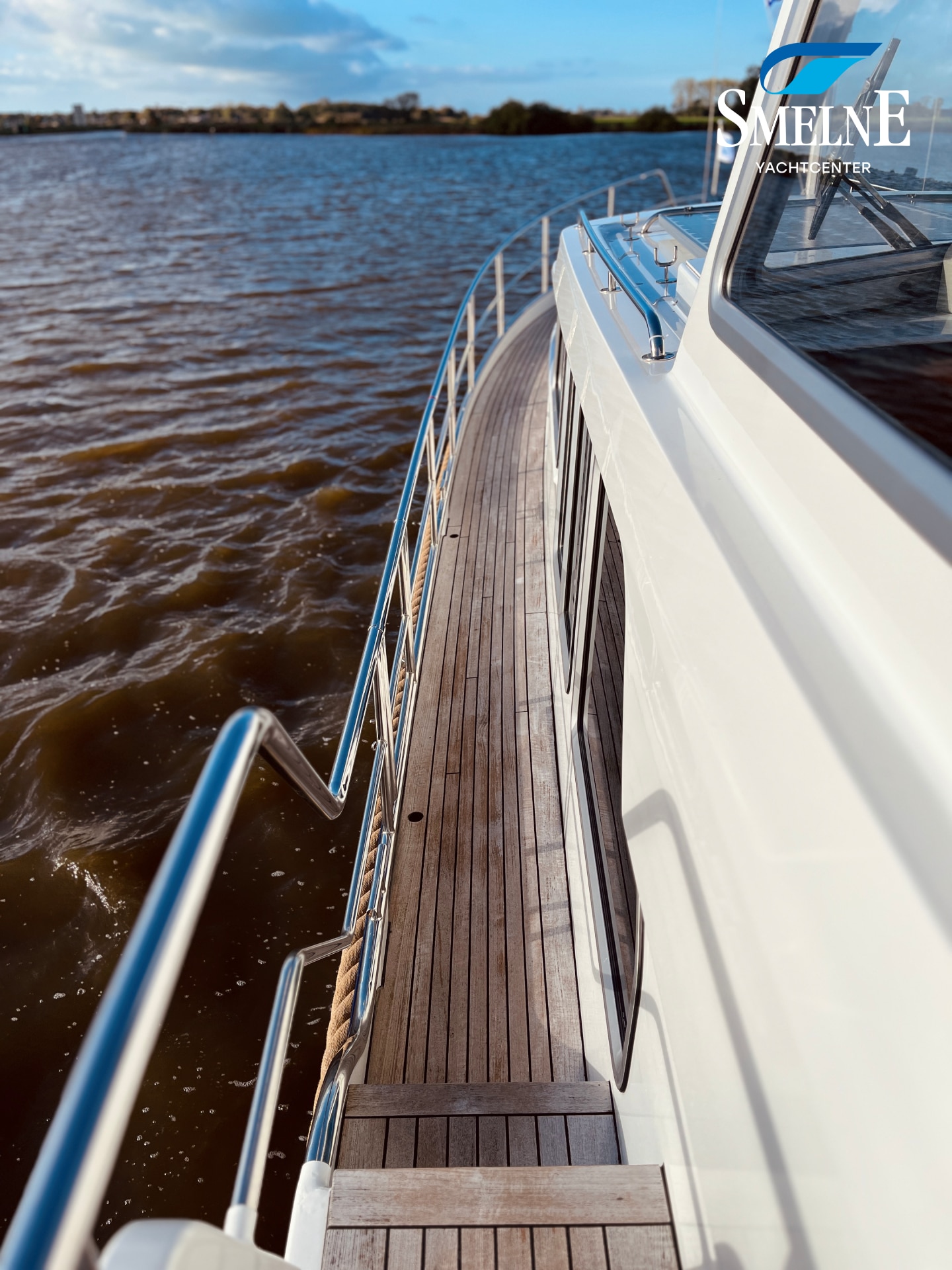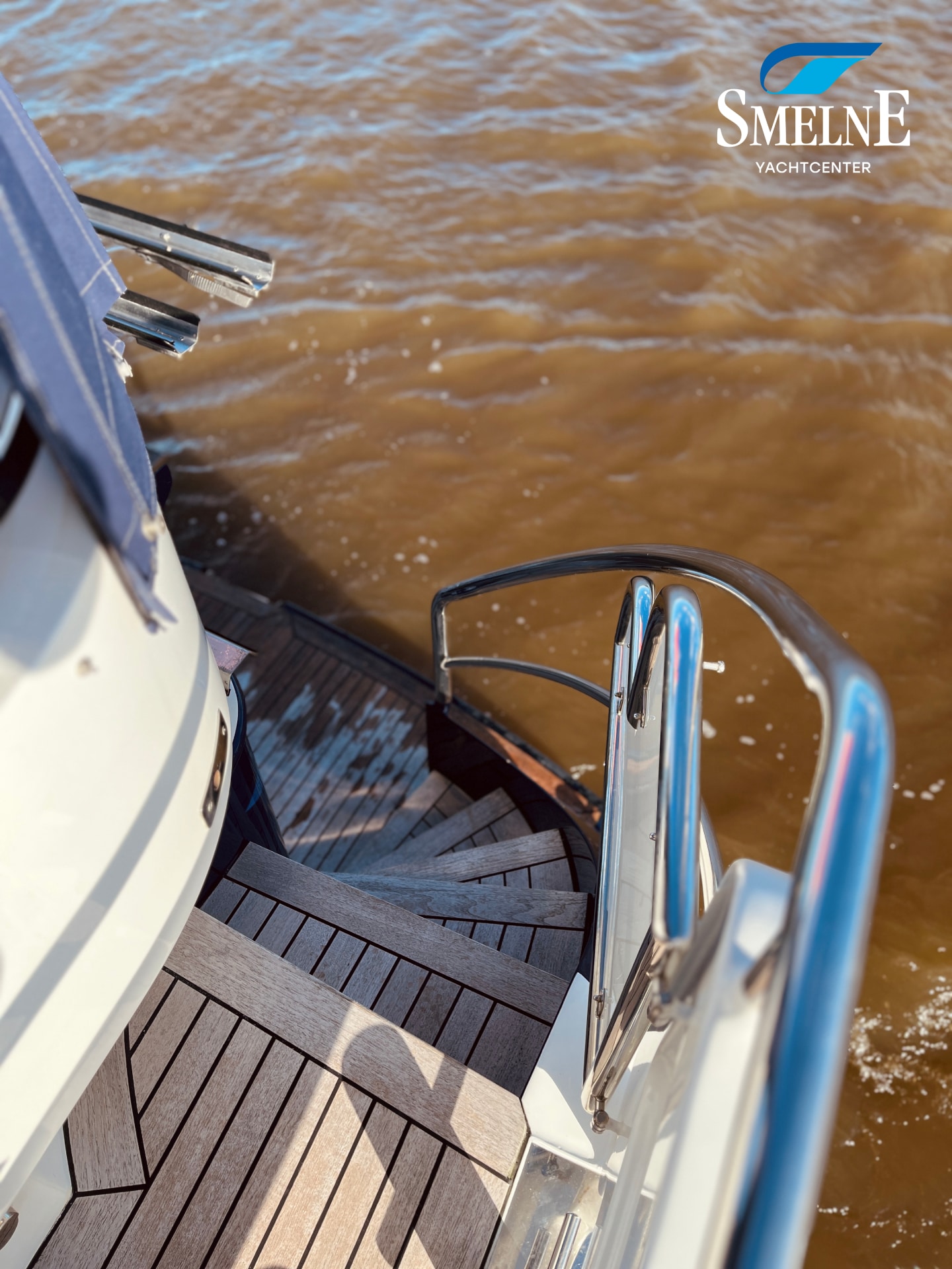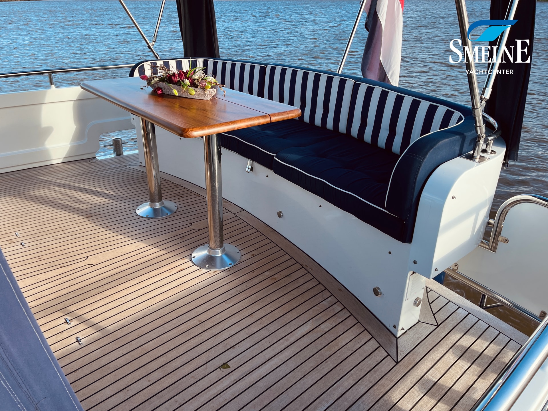 Wide gangways with sturdy stainless steel railings and handrails ensure safe passage all around. From the gangways or the bathing platform, you can reach the aft deck via integrated staircases. The spacious aft deck is furnished with a fixed deck bench, a midship steering position with a double steering chair, and a comprehensive navigation instrument cluster. All under an XL-canopy for optimal comfort, whatever the weather.