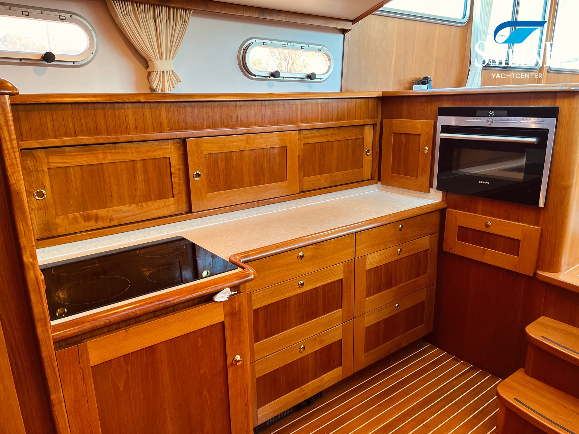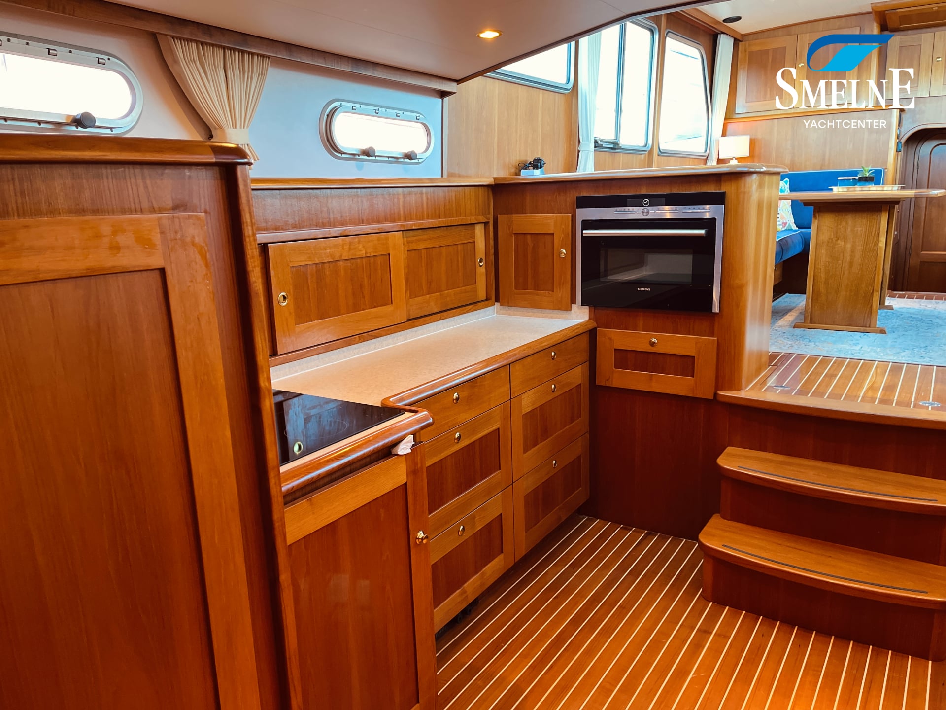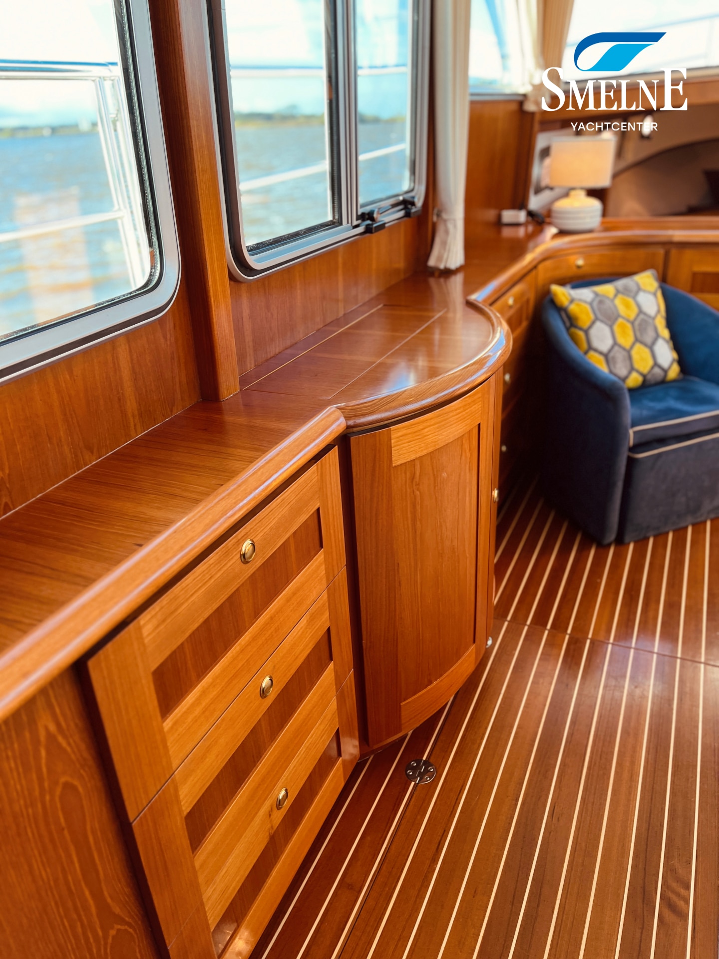 The interior is spacious, warm, and finished entirely in teak with ample solid moldings. The saloon features a generous L-shaped sofa and a stylish wall of cabinetry with an integrated TV on a lift. The galley is located forward and open to the saloon, creating a pleasant sense of space. The fully equipped galley, with all conceivable appliances, combines with the L-shaped dinette and office area to create an inviting living space on board.
