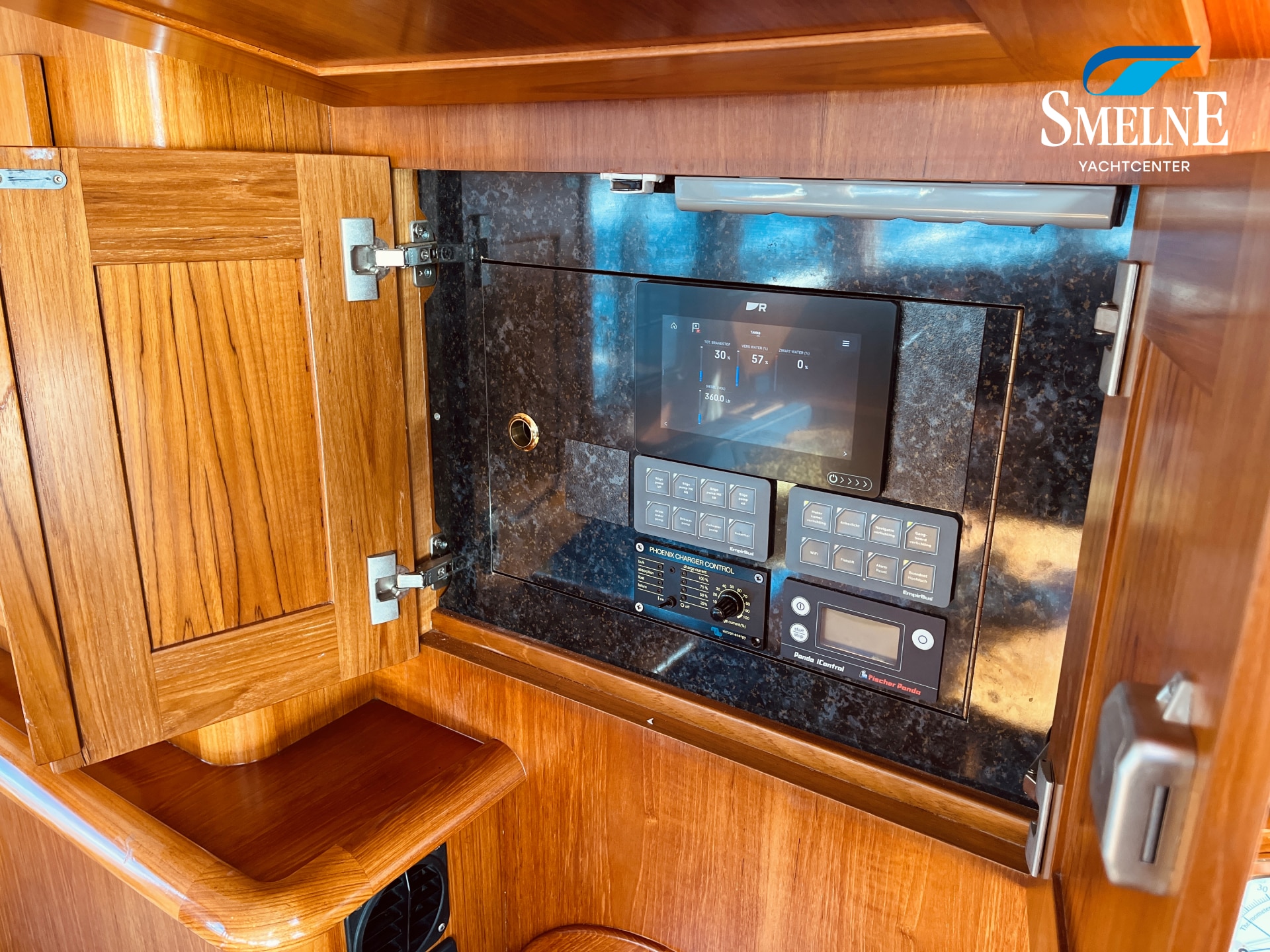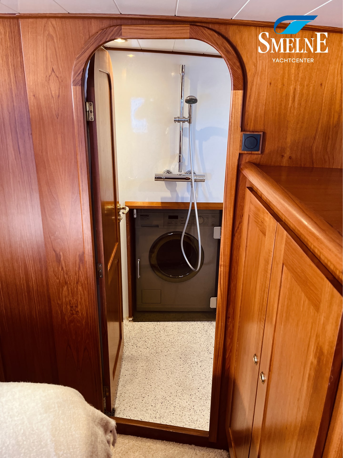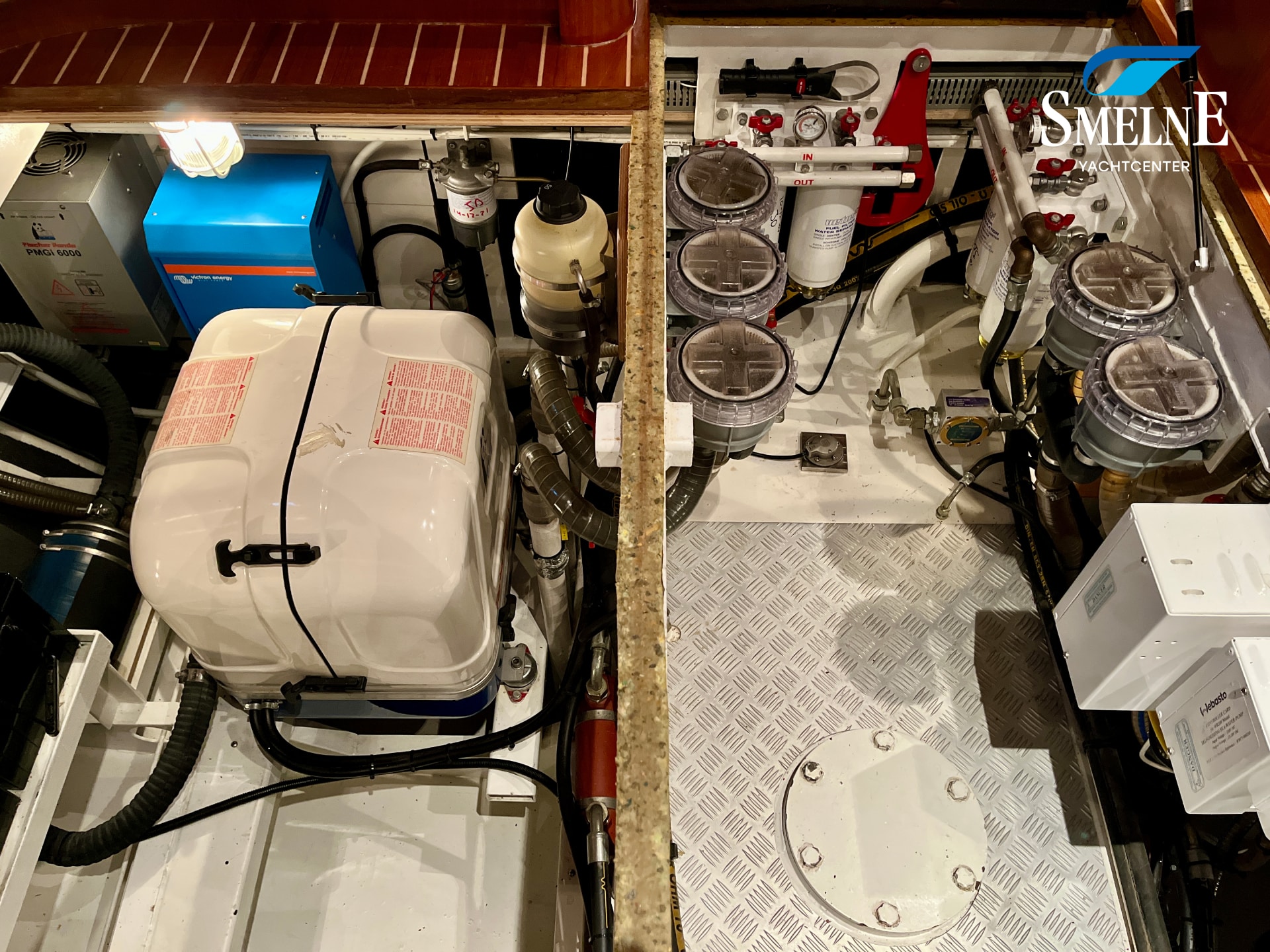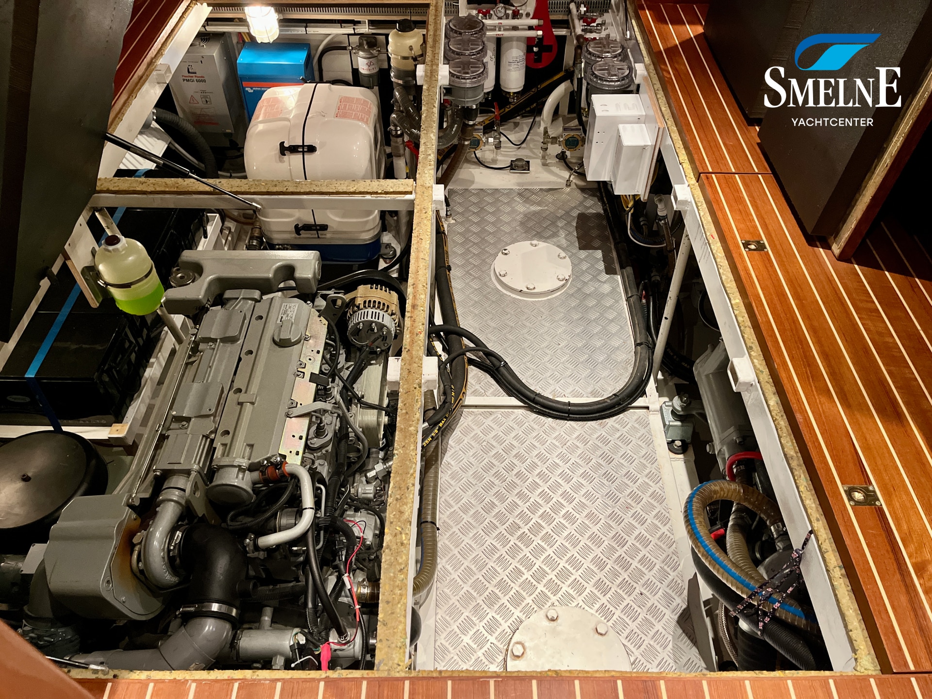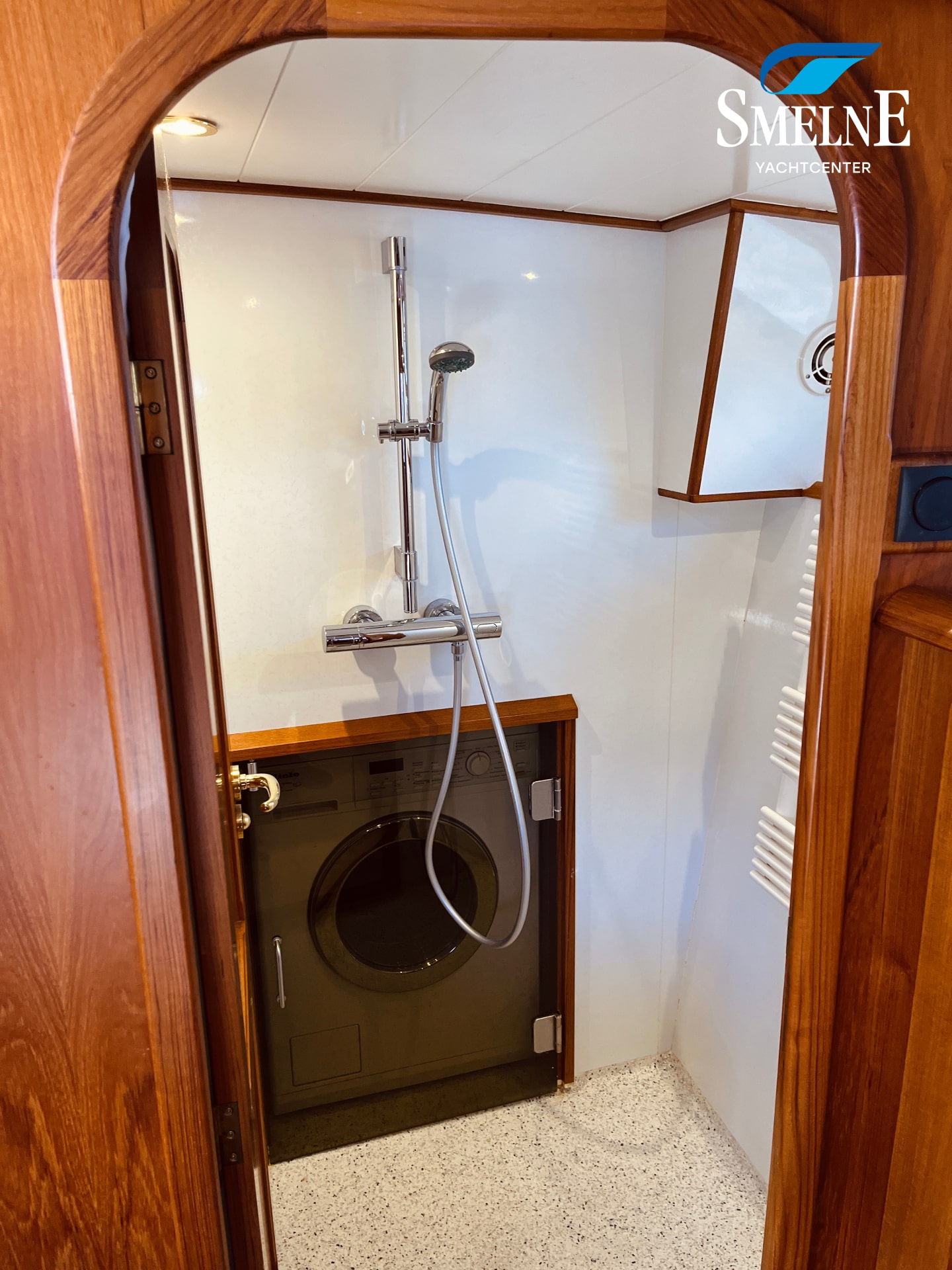 In addition to the already very well-equipped standard equipment, this Smelne Vlet 1350 is equipped with numerous luxurious and practical extras. These include a bow spotlight controlled from the steering position, stainless steel bow and gangway stairs, electric mast lowering system, exterior orientation lighting on the aft deck, and electronic engine controls. The comprehensive and recent Raymarine navigation package offers, in addition to the standard information, extensive data, including engine data, fuel tank capacity, temperature (ambient and water), wind gauges, and more, clearly displayed on the various displays. The yacht also features a camera system, windshield wipers with washer, Wi-Fi, a hydraulic bicycle lift, and luxury appliances such as a Miele washer/dryer (5 kg) and a Miele dishwasher. Additional comfort is provided with multiple USB charging points, a 230V socket at the steering position, a swingback bed base, custom-made "Schramm" mattresses (2022), and integrated combination roller blinds (insect screen + blackout) for the roof and transom hatches, including insect screens and rain caps for the portholes. For both engines, the boat is equipped with dual cooling water filters, dual-switchable fuel pre-filters, and WMMT fuel filters. And much more!