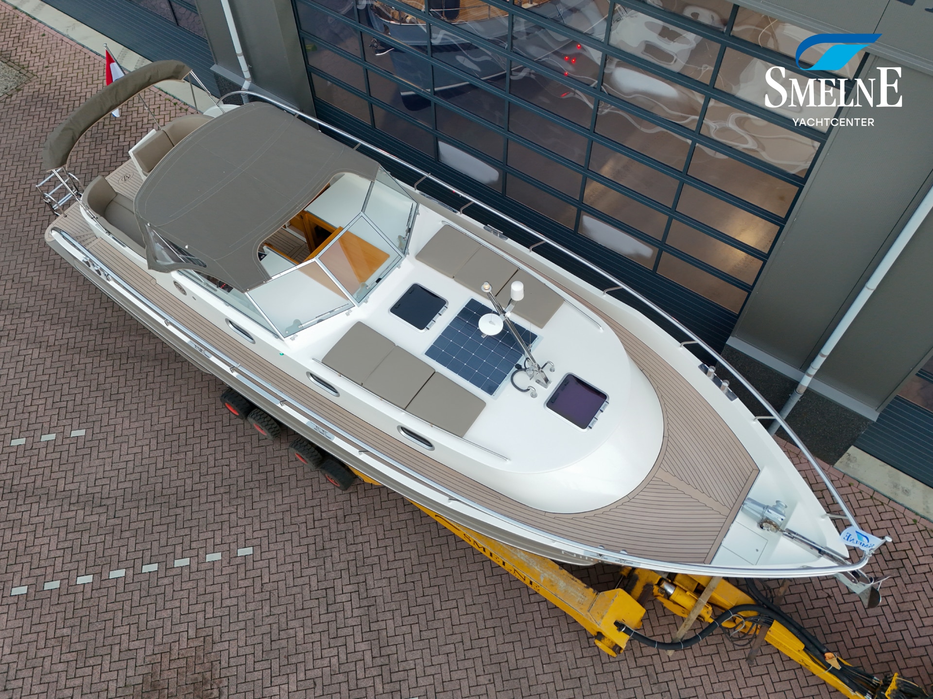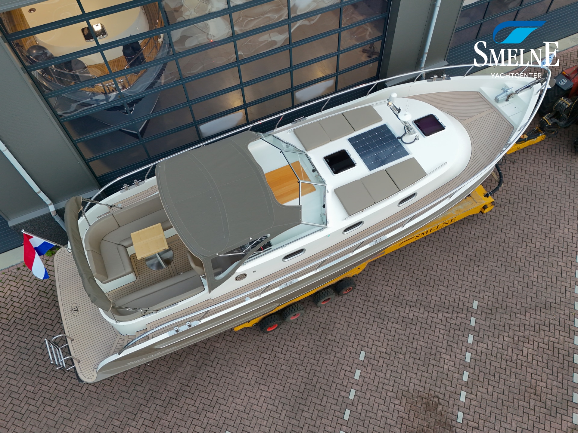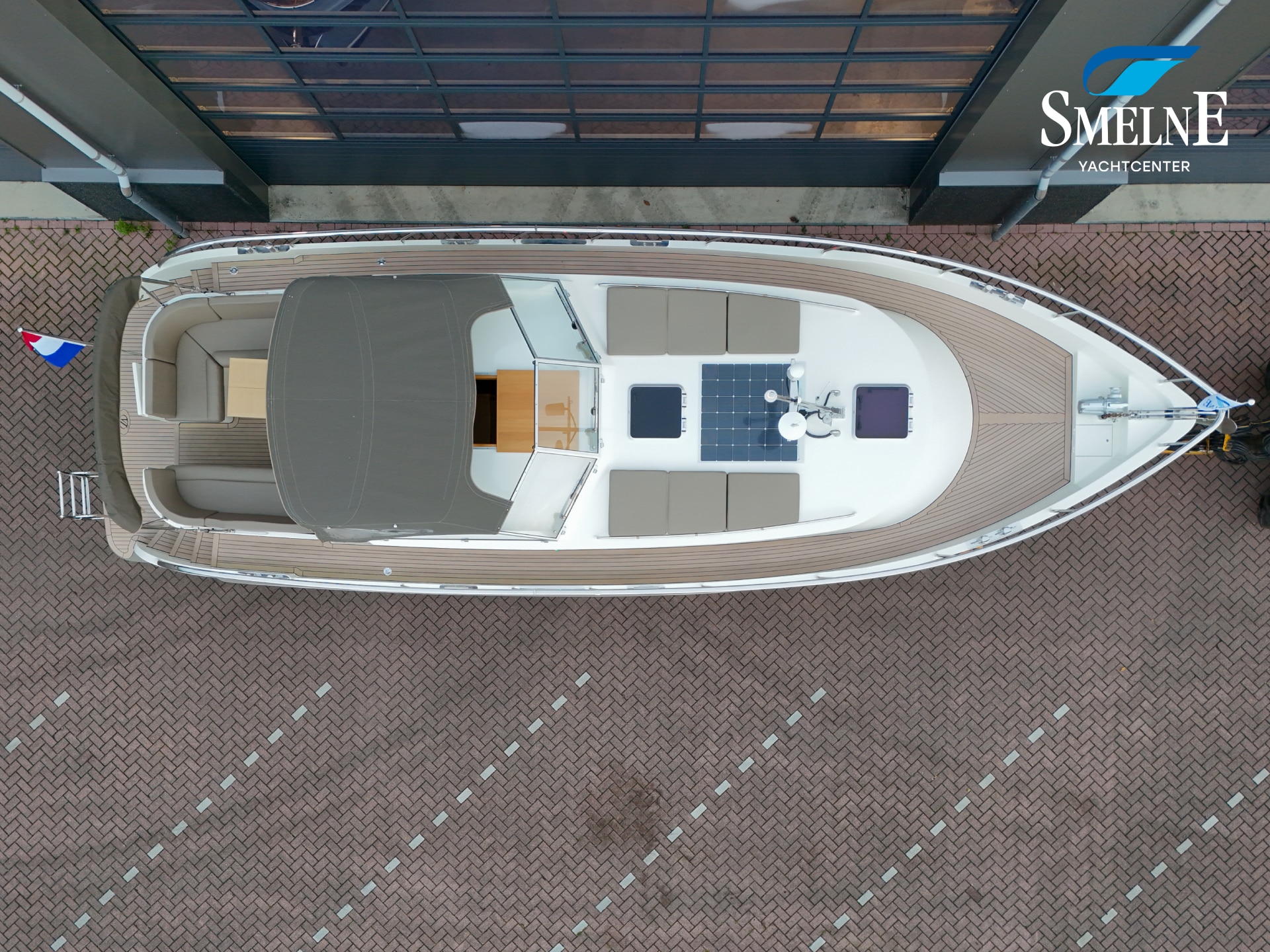 This Vedette is also very well equipped, with extras that make all the difference: more powerful motorization compared to standard, electronic engine control, proportionally controlled bow and stern thruster with Vetus double proportional control, engine data can be read and radio multimedia system can be operated via Axiom screen, wipers with interval function, heating outlet under windscreen, 176 Watt solar panel + 15 Amp Victron charge controller, Victron BMV-712 Smart battery monitor, Glomex Webboat 4G Lite EVO WiFi antenna, luxury canopy with zip-out section in front for ventilation and Easy-convertible system on rear section with zip-in insect screen, sunken cockpit bench for storing folding bicycles with double 230V connection, extra gas connection on bathing platform, double roof hatch in cabin roof with integrated insect screen and blackout, extra porthole in hull at dinette with insect screens and rain covers, integrated blinds in the cabin access door, USB & USB-C charging points at the steering position and throughout the interior, central vacuum system, and more!