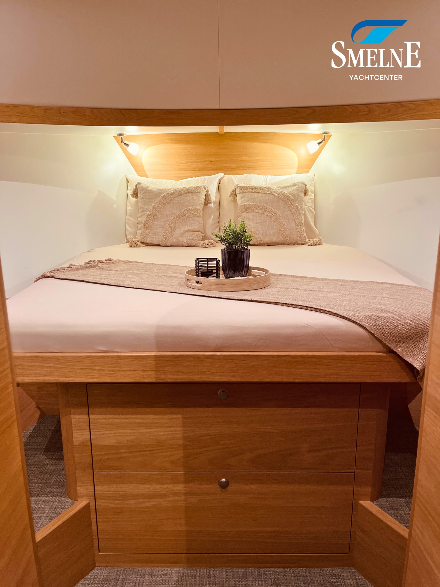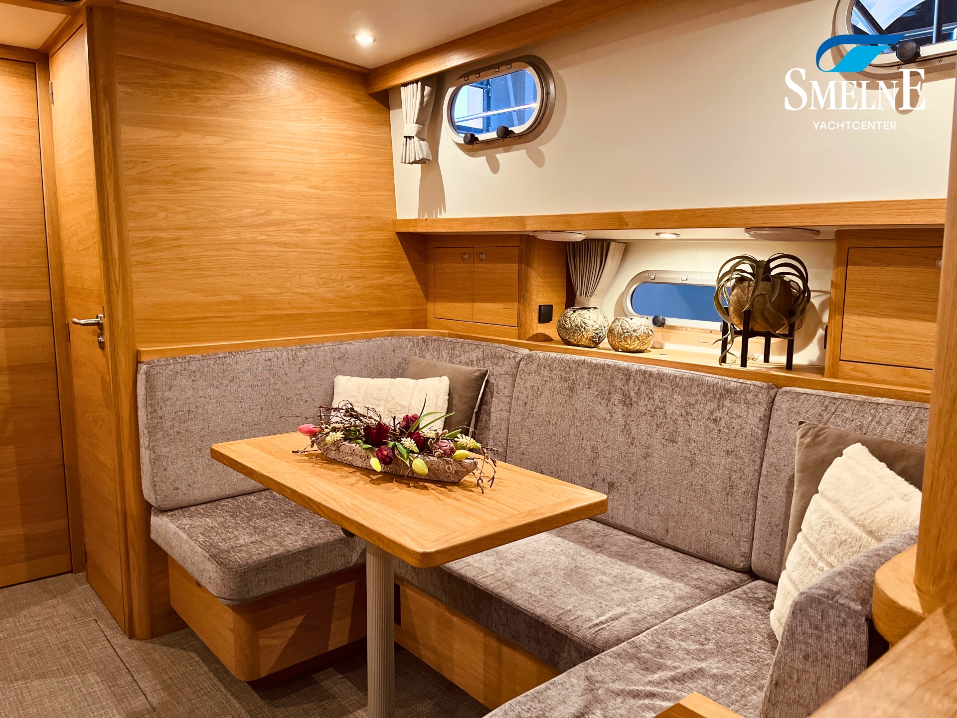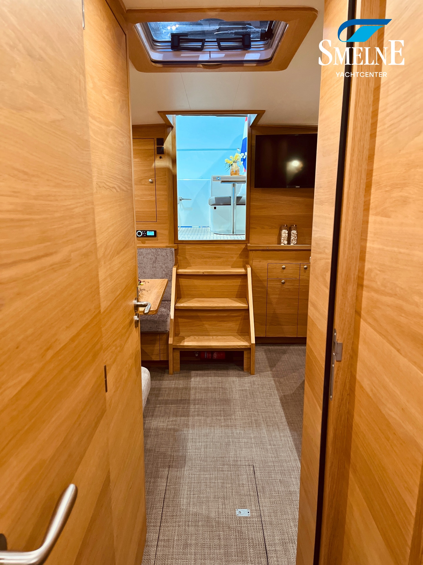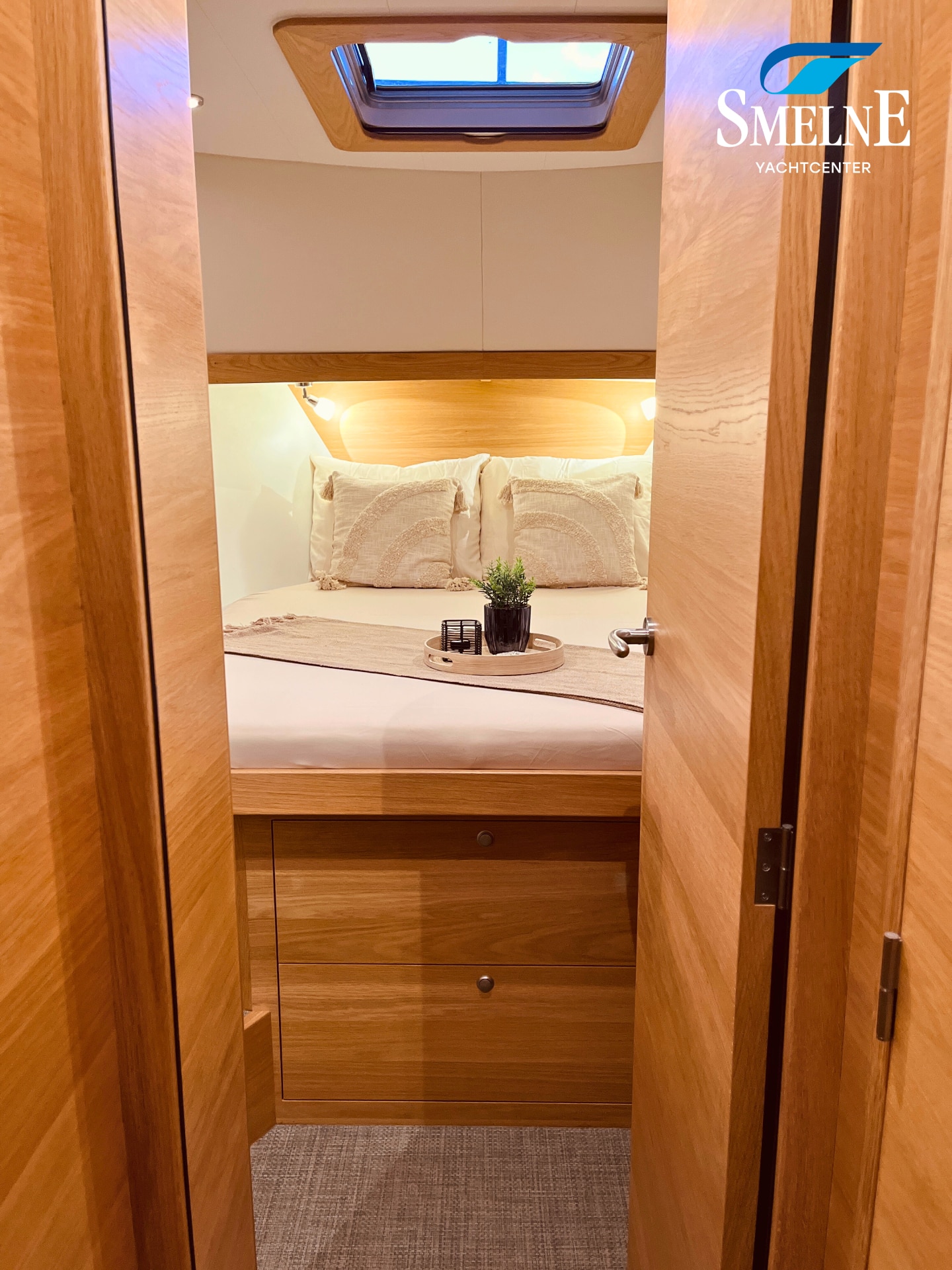 The cabin exudes tranquility and space, with a logical and inviting layout. Here you'll find a fully equipped galley, a spacious U-shaped dinette, and a sanitary room with an electric toilet and washbasin. The owner's cabin is located forward, with a freestanding double bed and an ensuite shower room. A wealth of storage space is provided throughout the interior, keeping everything neat and organized. In the evenings, it's wonderful to relax with a book or a drink in the soft, dimmable lighting of the cabin. The modern interior and open-plan layout provide a comfort that almost feels like home, while the characteristic feel of a motor yacht remains palpable.