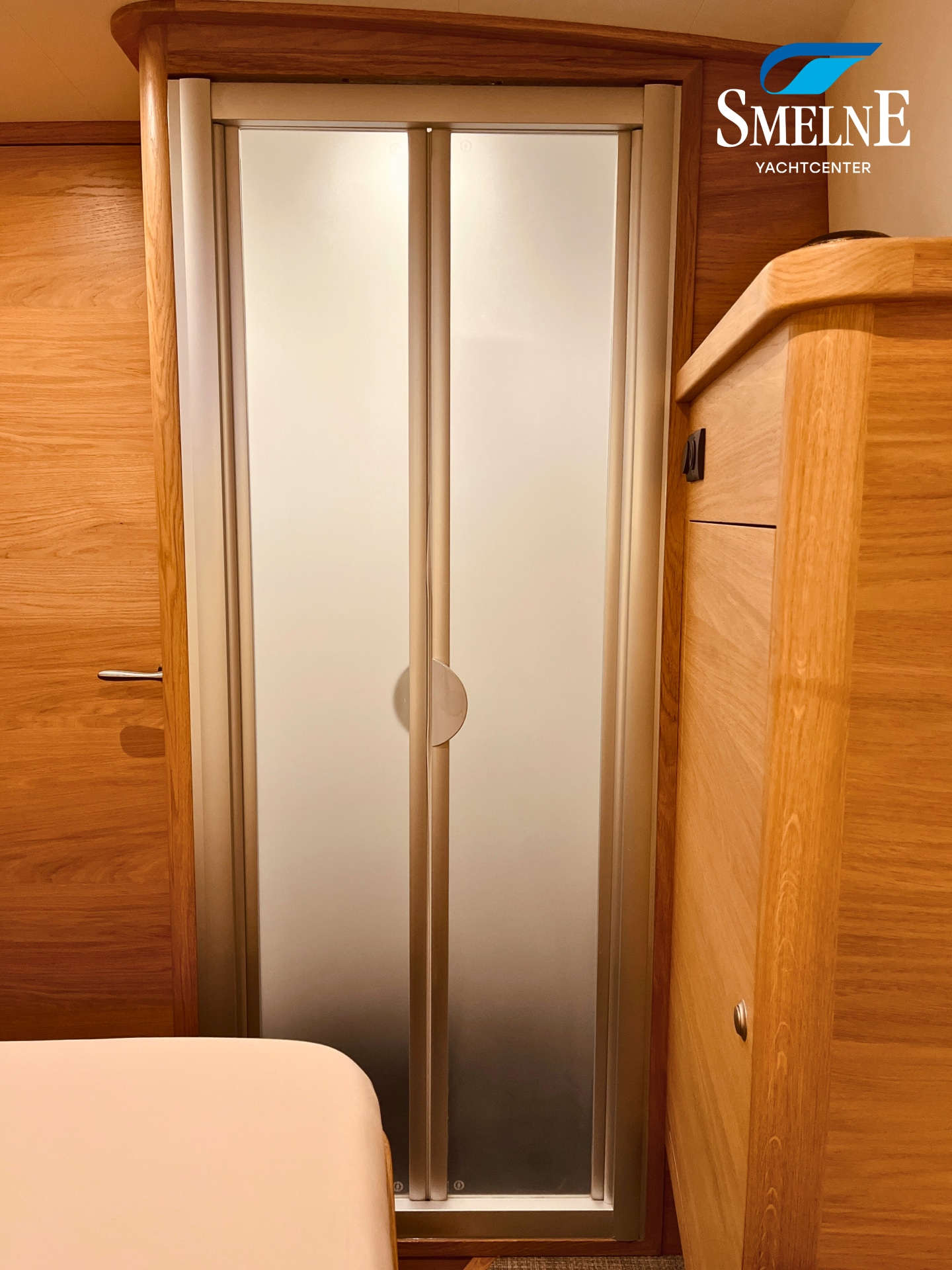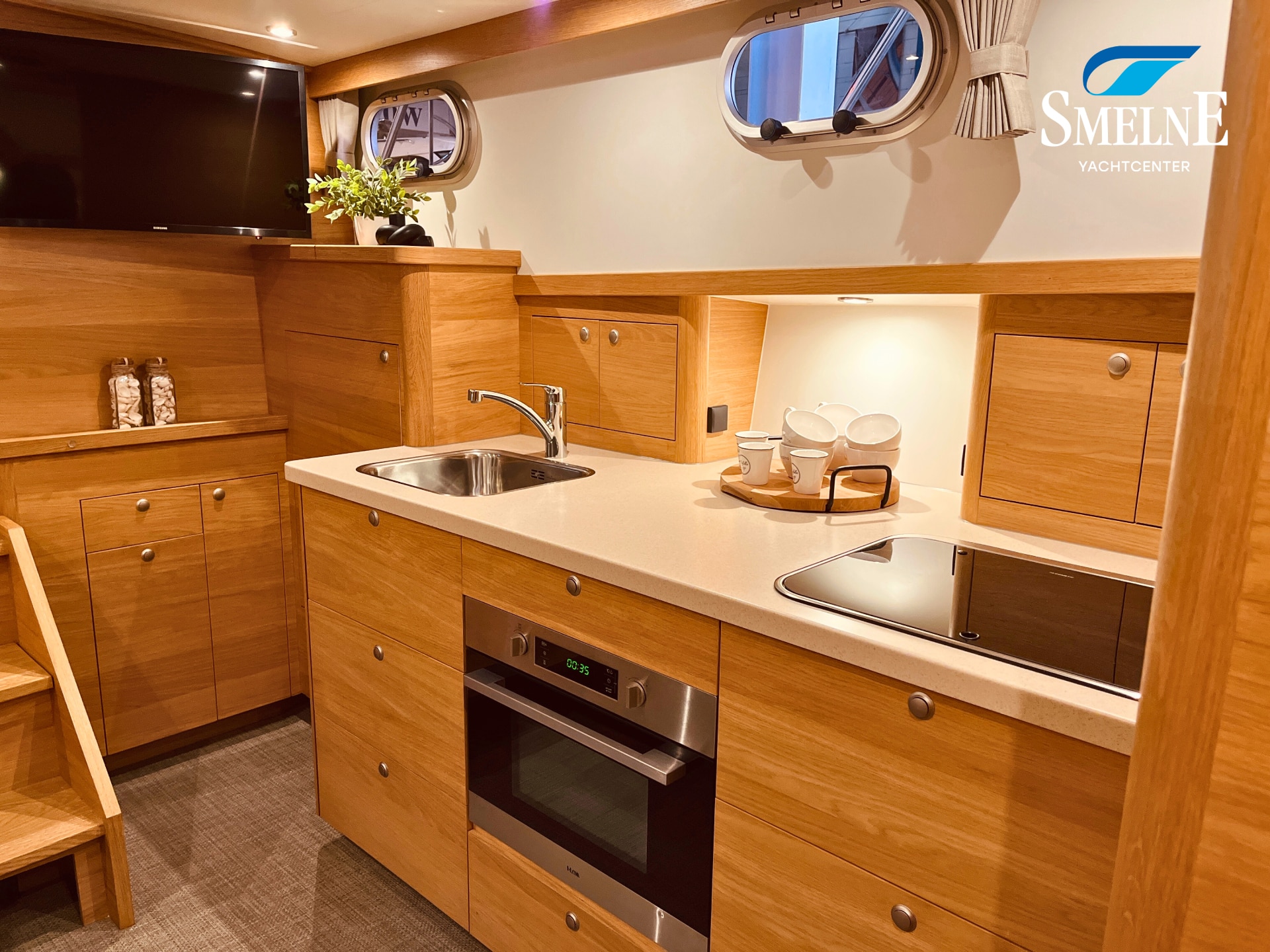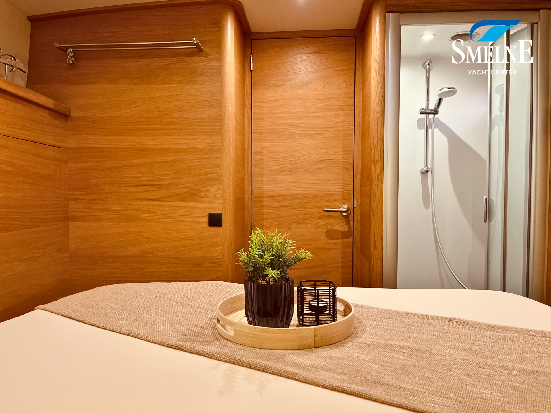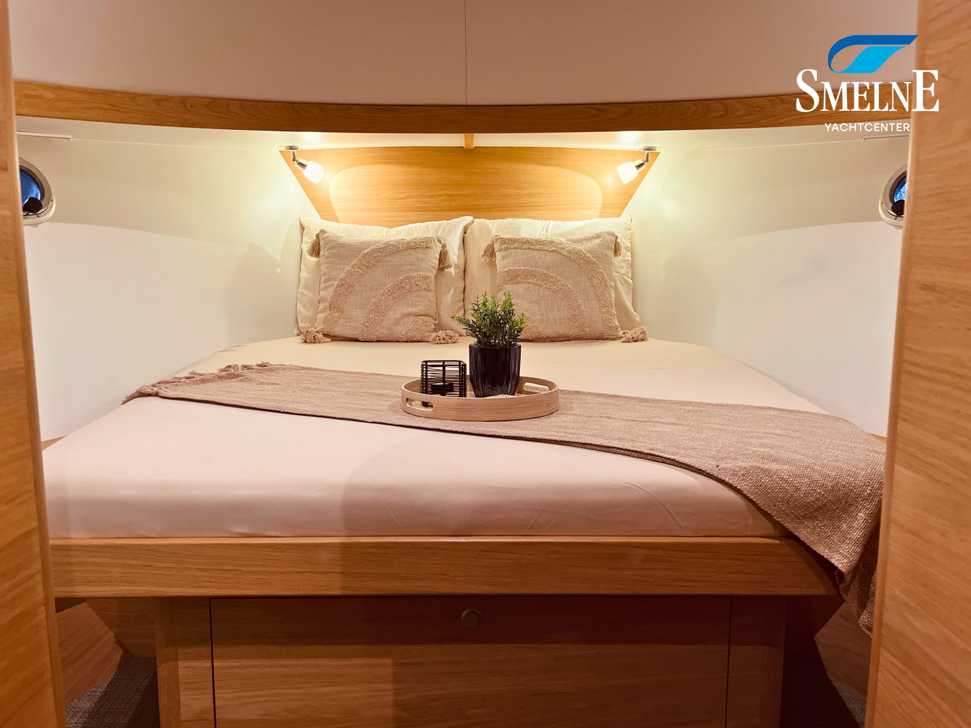 The cabin exudes tranquility and space, with a logical and inviting layout. Here you'll find a fully equipped galley, a spacious U-shaped dinette, and a sanitary room with an electric toilet and washbasin. The owner's cabin is located forward, with a freestanding double bed and an ensuite shower room. A wealth of storage space is provided throughout the interior, keeping everything neat and organized. In the evenings, it's wonderful to relax with a book or a drink in the soft, dimmable lighting of the cabin. The modern interior and open-plan layout provide a comfort that almost feels like home, while the characteristic feel of a motor yacht remains palpable.