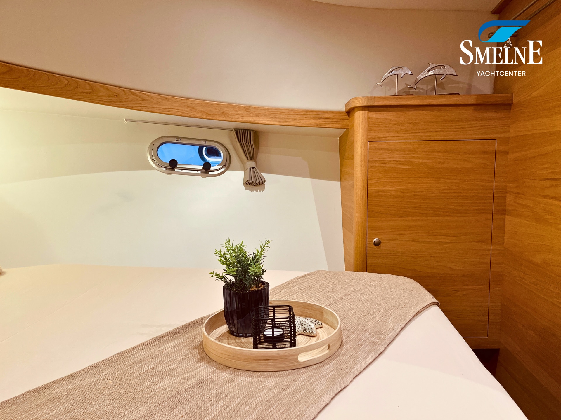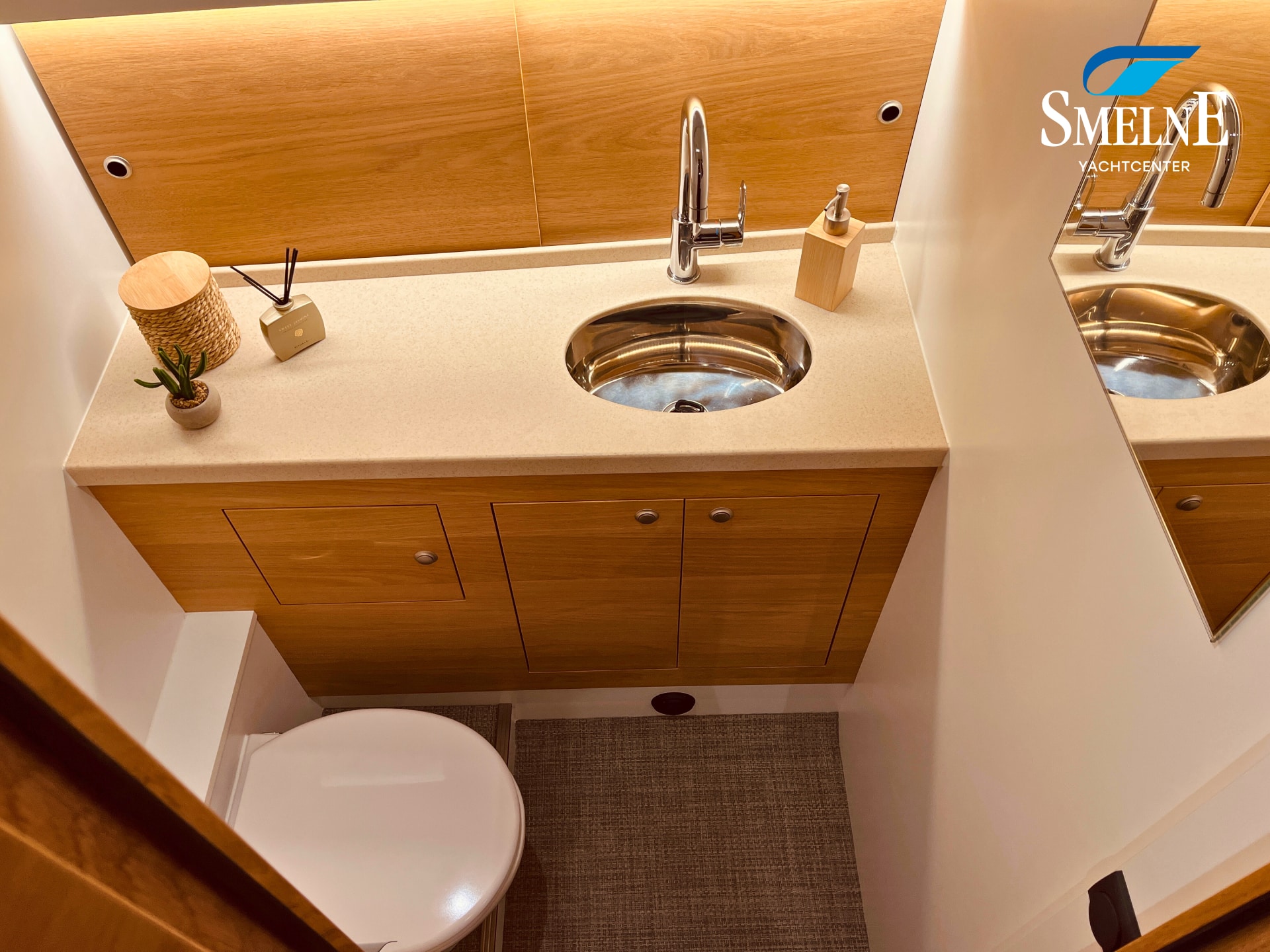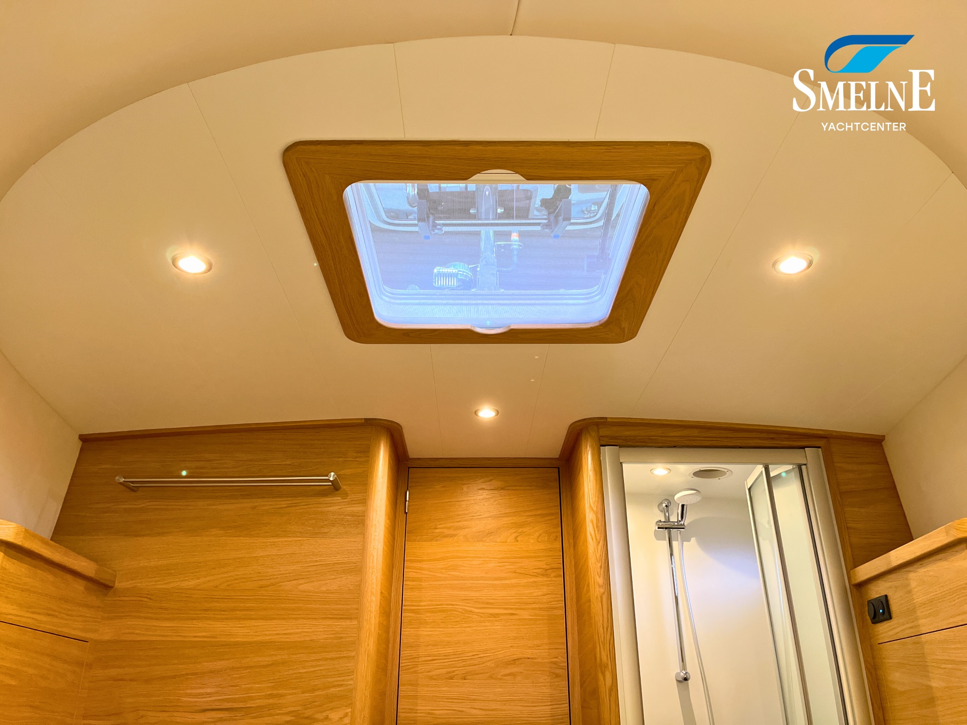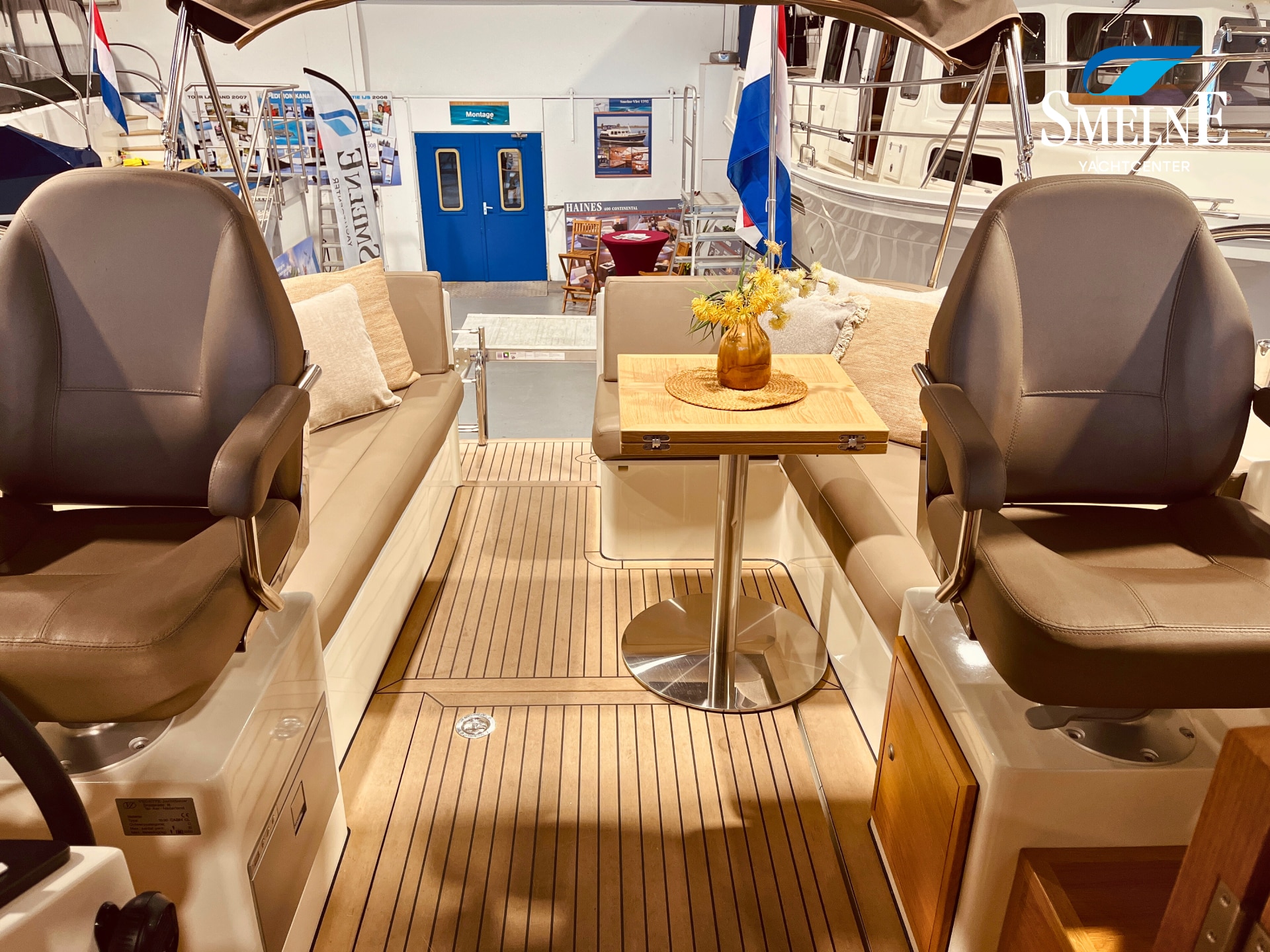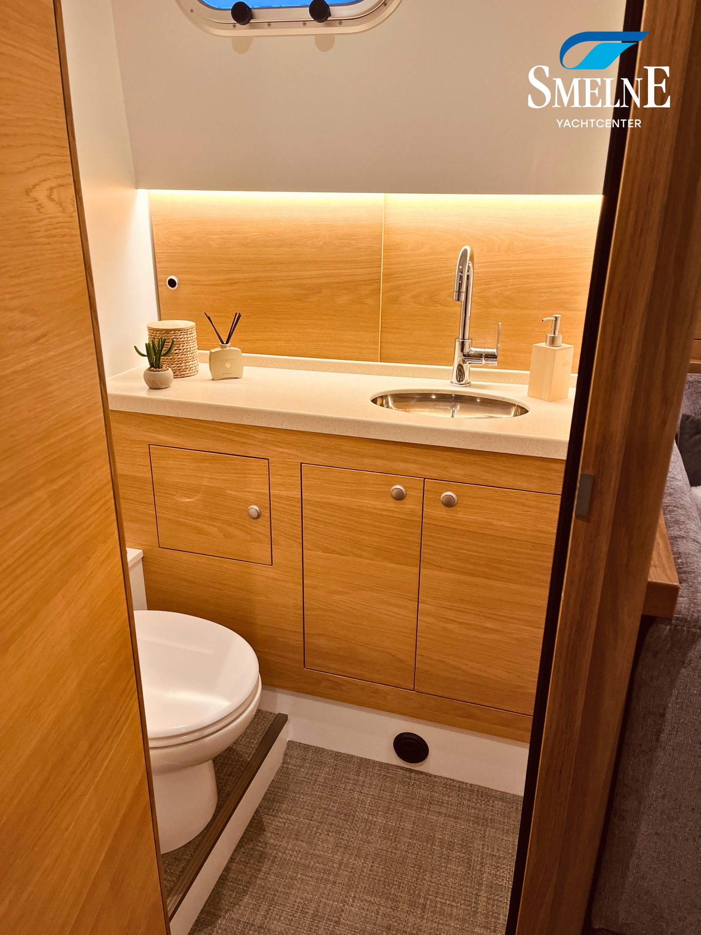 The cabin exudes tranquility and space, with a logical and inviting layout. Here you'll find a fully equipped galley, a spacious U-shaped dinette, and a sanitary room with an electric toilet and washbasin. The owner's cabin is located forward, with a freestanding double bed and an ensuite shower room. A wealth of storage space is provided throughout the interior, keeping everything neat and organized. In the evenings, it's wonderful to relax with a book or a drink in the soft, dimmable lighting of the cabin. The modern interior and open-plan layout provide a comfort that almost feels like home, while the characteristic feel of a motor yacht remains palpable.