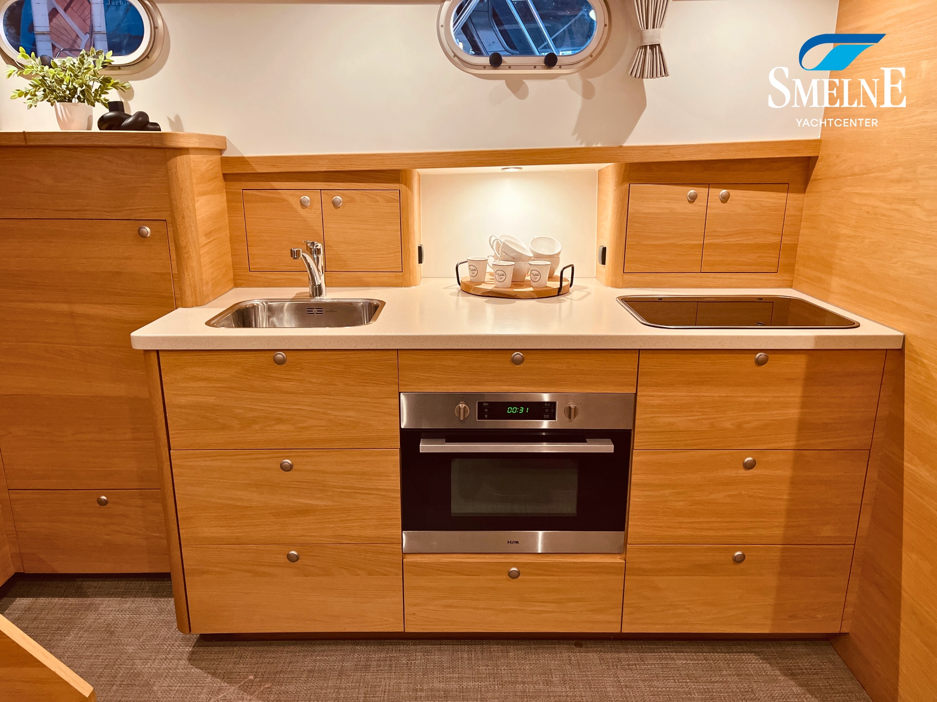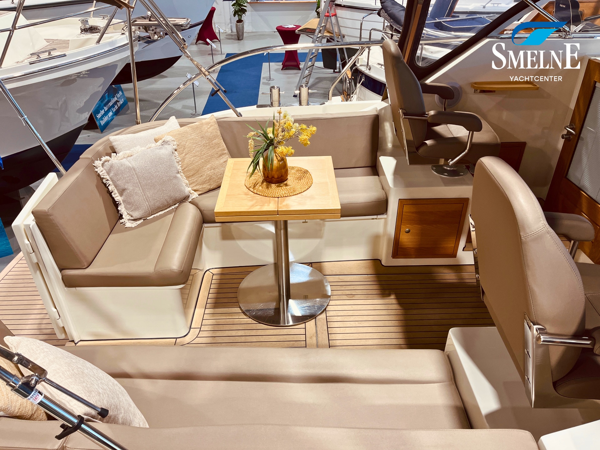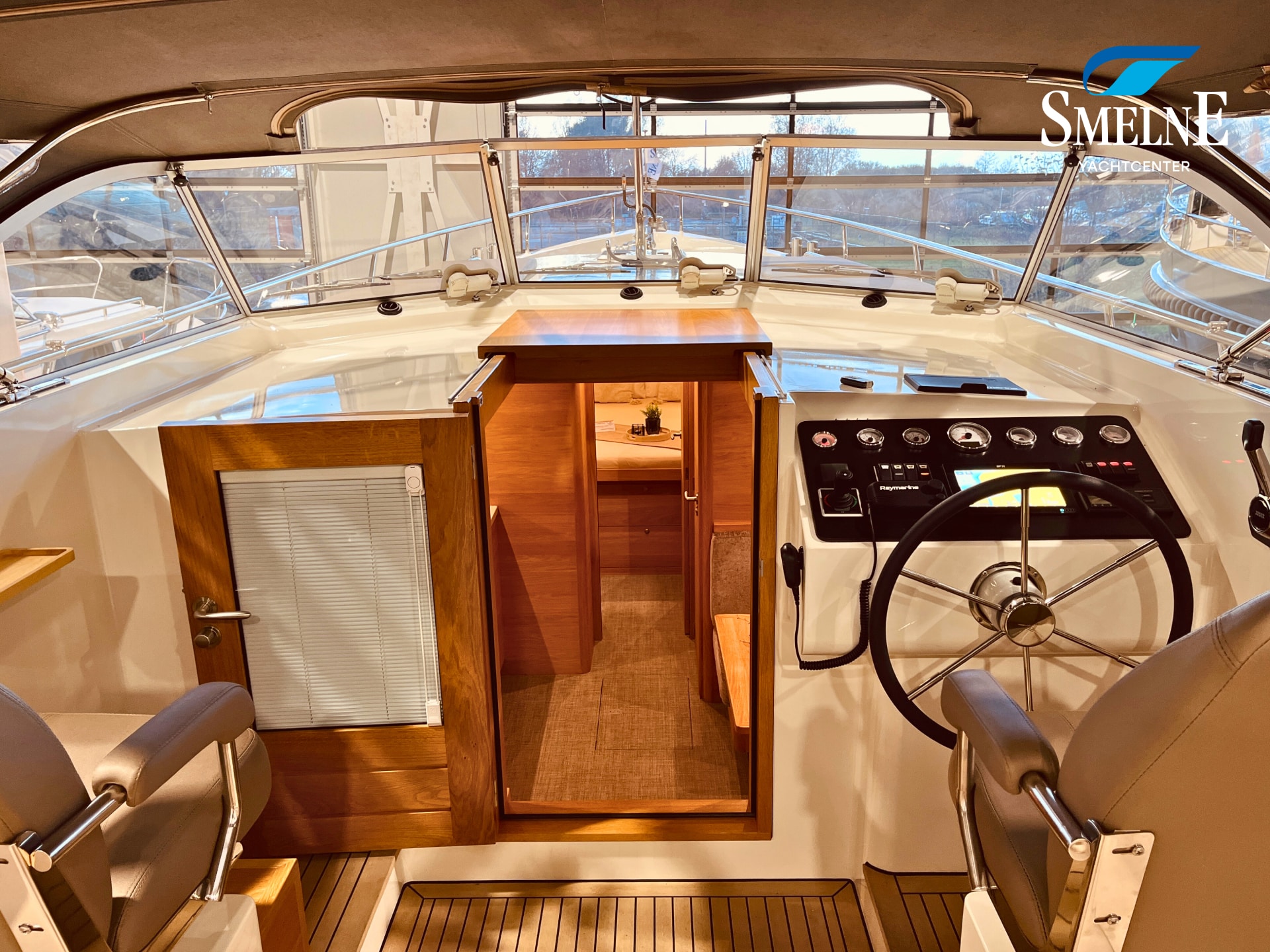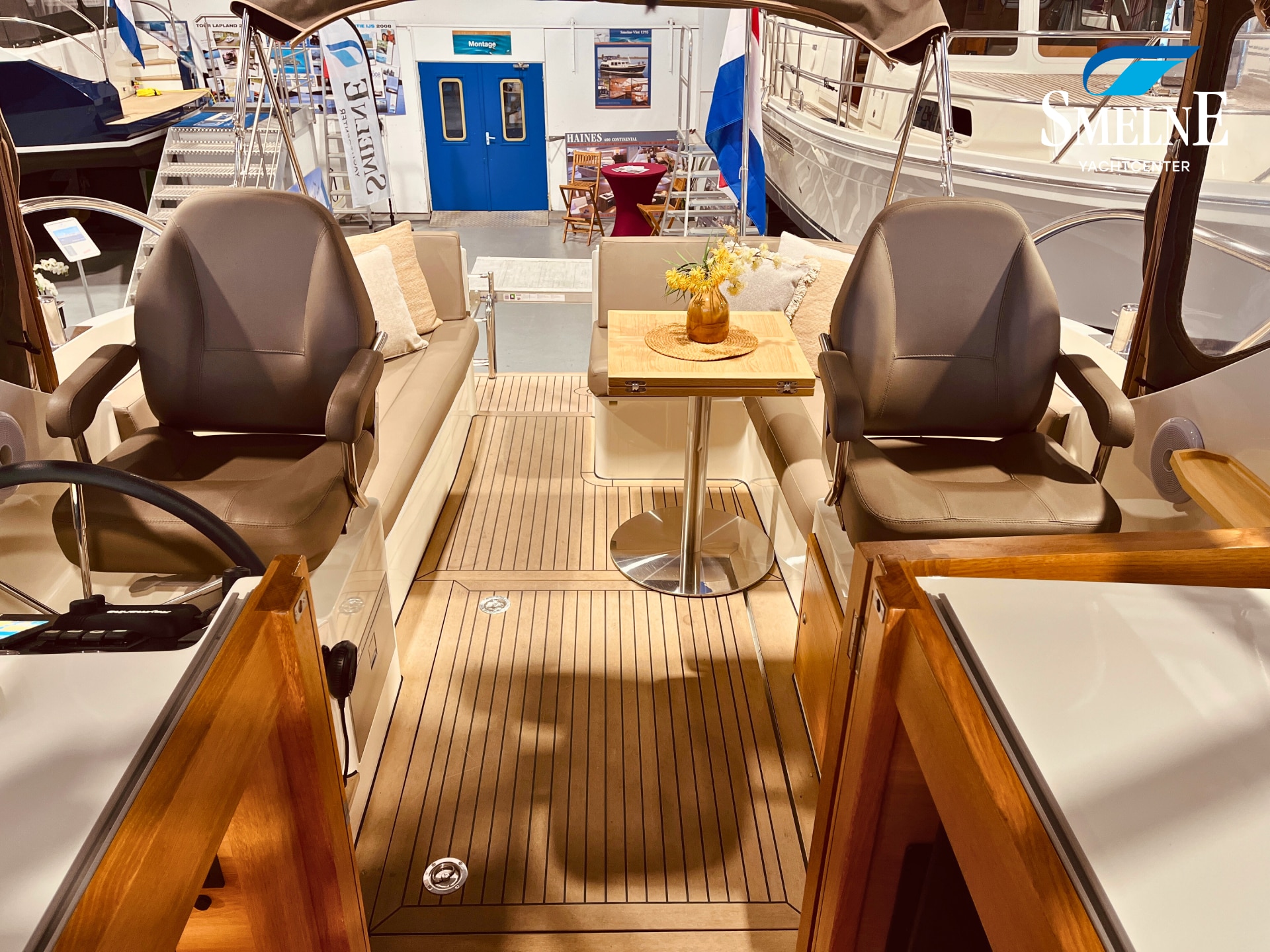 The cabin exudes tranquility and space, with a logical and inviting layout. Here you'll find a fully equipped galley, a spacious U-shaped dinette, and a sanitary room with an electric toilet and washbasin. The owner's cabin is located forward, with a freestanding double bed and an ensuite shower room. A wealth of storage space is provided throughout the interior, keeping everything neat and organized. In the evenings, it's wonderful to relax with a book or a drink in the soft, dimmable lighting of the cabin. The modern interior and open-plan layout provide a comfort that almost feels like home, while the characteristic feel of a motor yacht remains palpable.