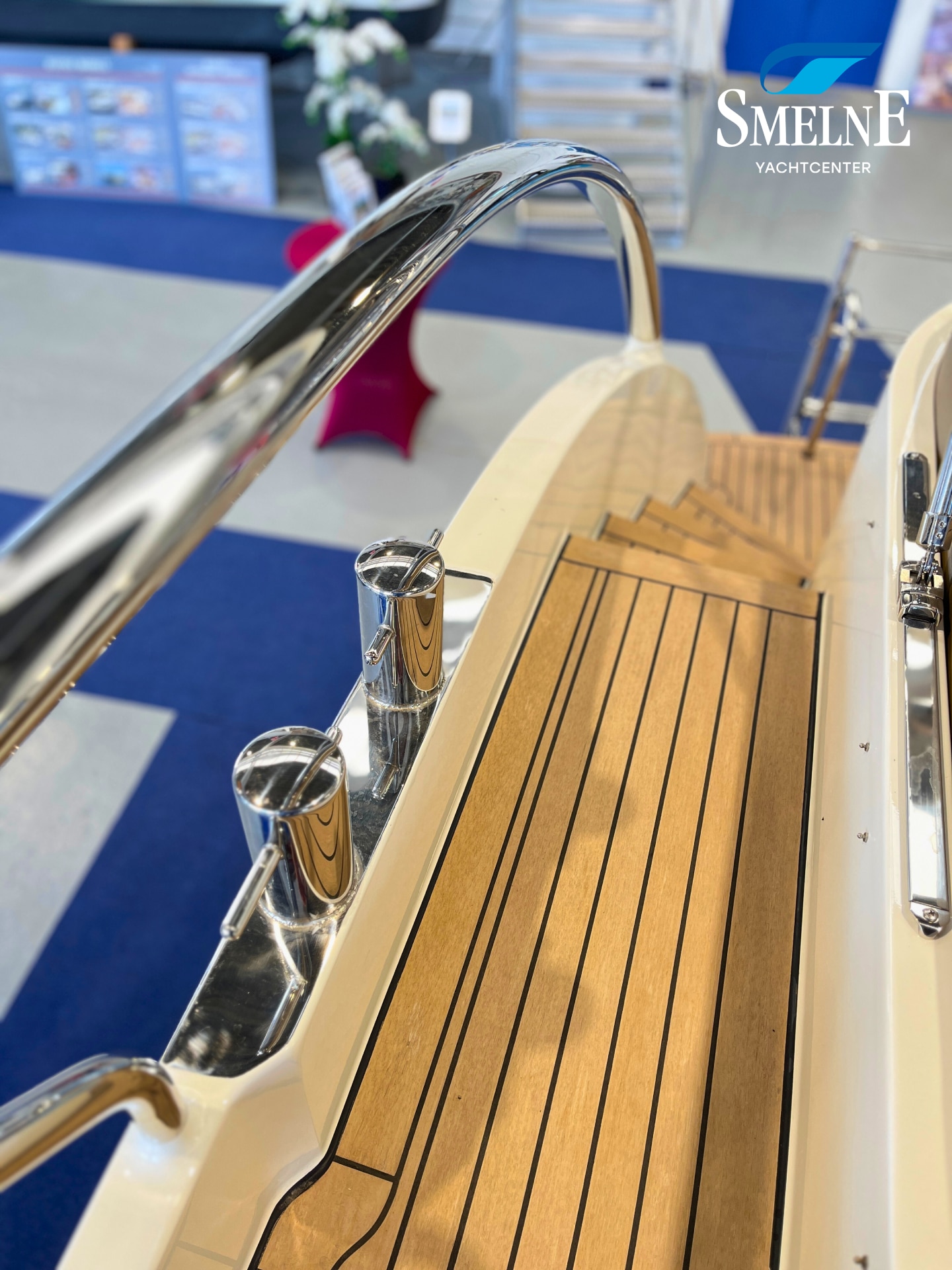 On deck, the practical and comfortable layout of this motor yacht is immediately apparent. The open cockpit offers seating and storage, and the cabin roof features sun cushions for relaxing moments. The steering position with a double steering chair makes for a wonderful sailing experience. Spacious gangways with elegant stainless steel railing, integrated staircases, and a transom door to the cockpit provide safe and easy access, both while cruising and when mooring.