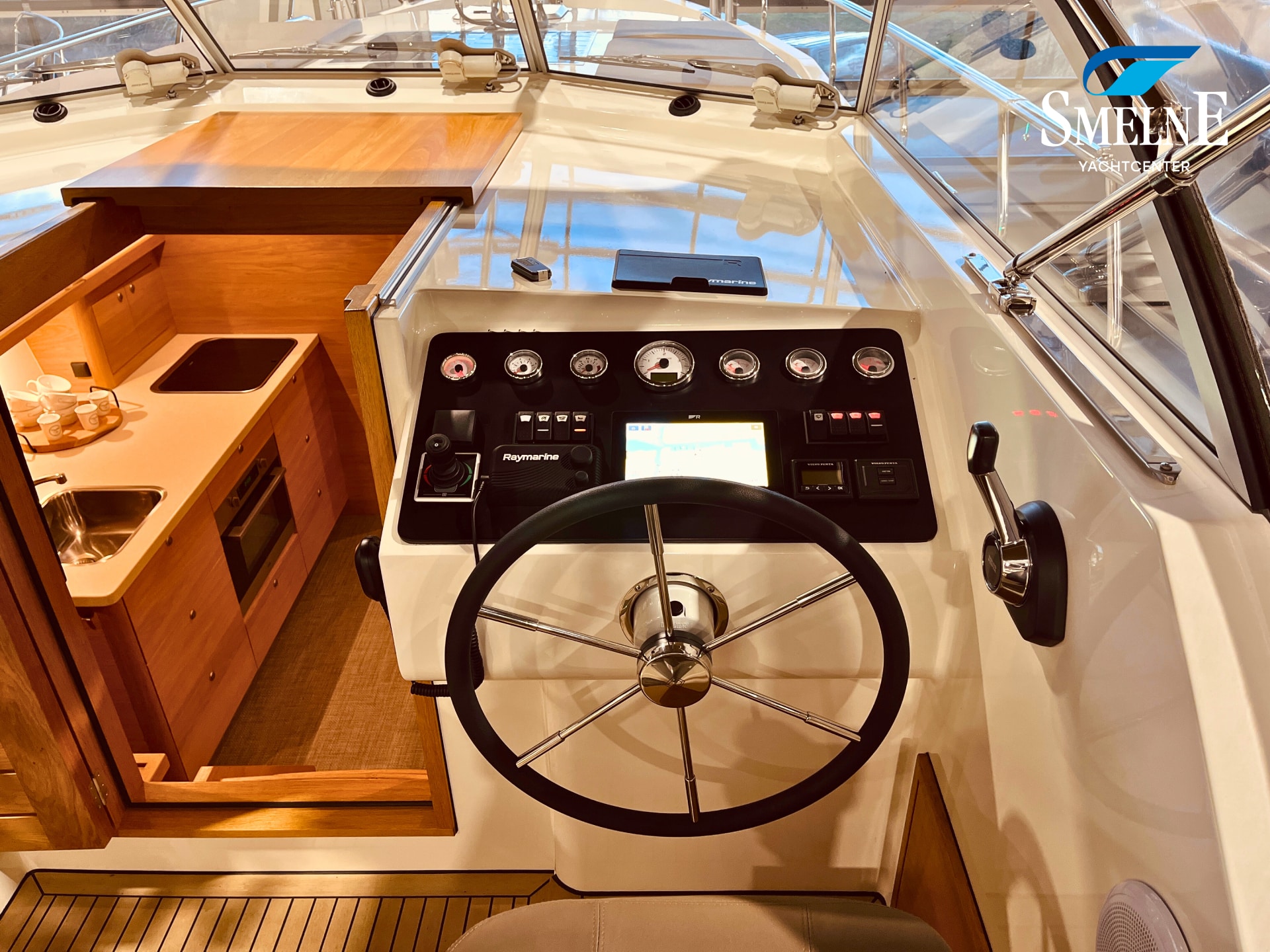 On the water, the Vedette is stable and smooth, with smooth rudder response and reliable handling. The proportionally controlled bow and stern thrusters make maneuvering easy, and the solid hull handles waves comfortably, making even longer trips relaxing.