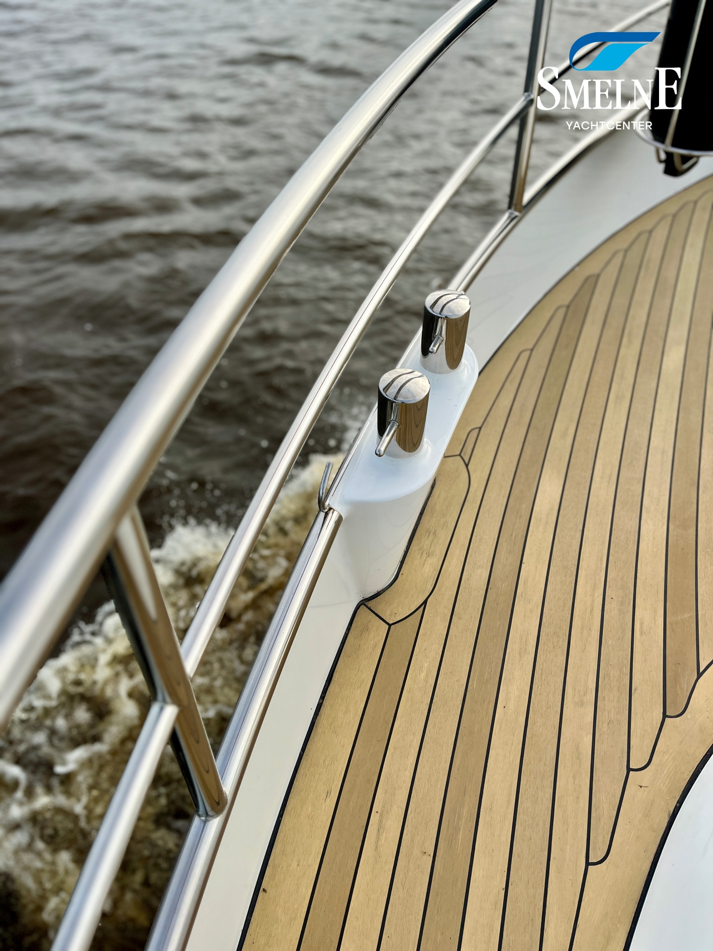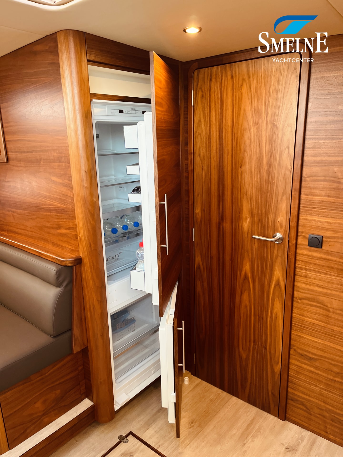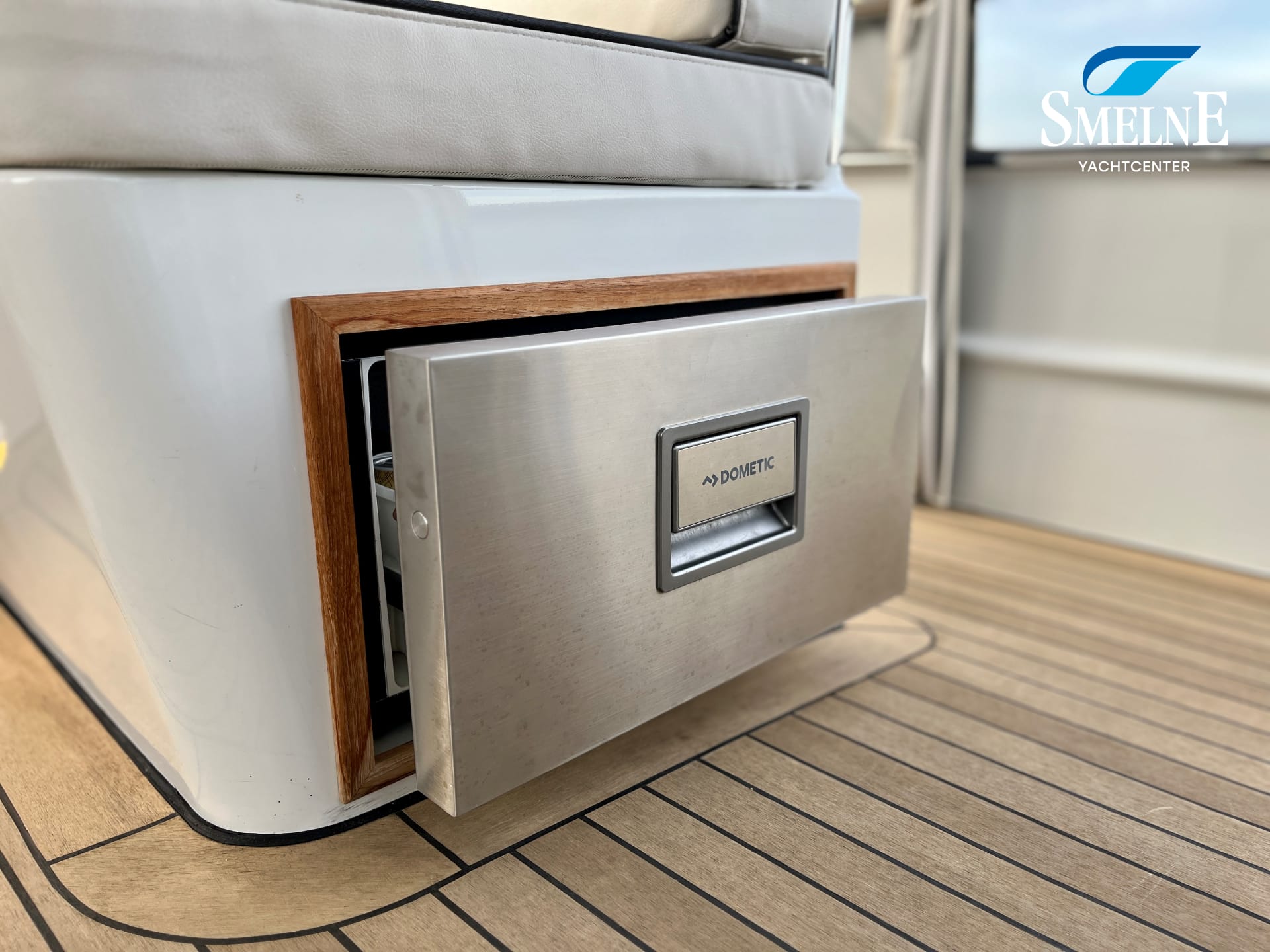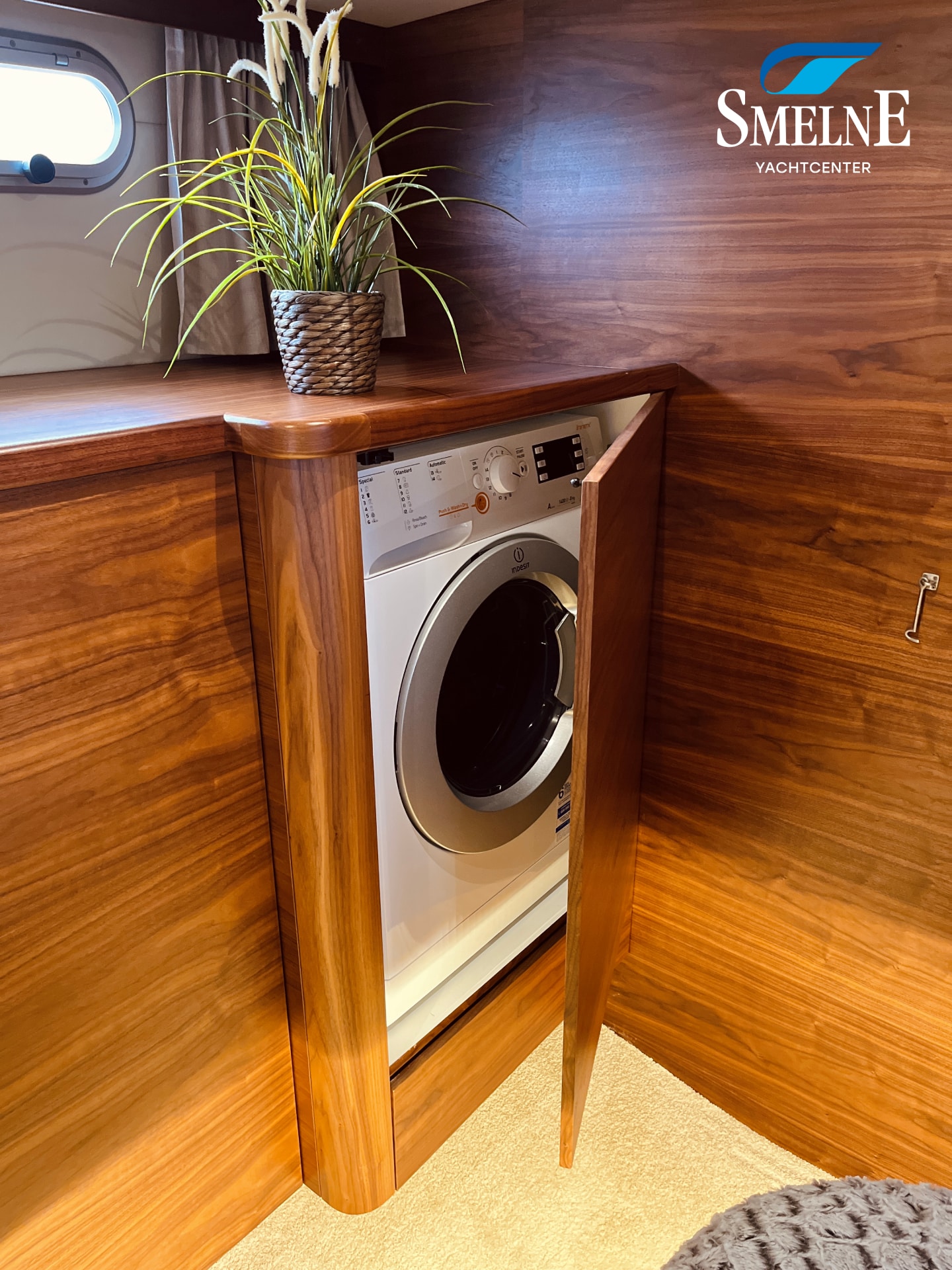 For added comfort on deck and inside, the boat is equipped with a USB port at the steering position, additional radio speakers on the aft deck, an instrument arch with gas struts, an electrically folding stainless steel antenna arch, a Marinco spotlight with remote control, a stainless steel gangway ladder, and stainless steel fender baskets for eight fenders. The sunken deck bench has two 8V outlets, ideal for charging electric folding bikes, for example, and is protected by a cover. Various luxurious exterior lighting, a Wi-Fi system, a central vacuum system, and an Indesit washer-dryer (230/8 kg) make long stays on board exceptionally comfortable.