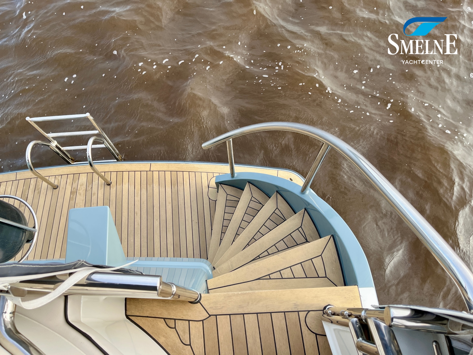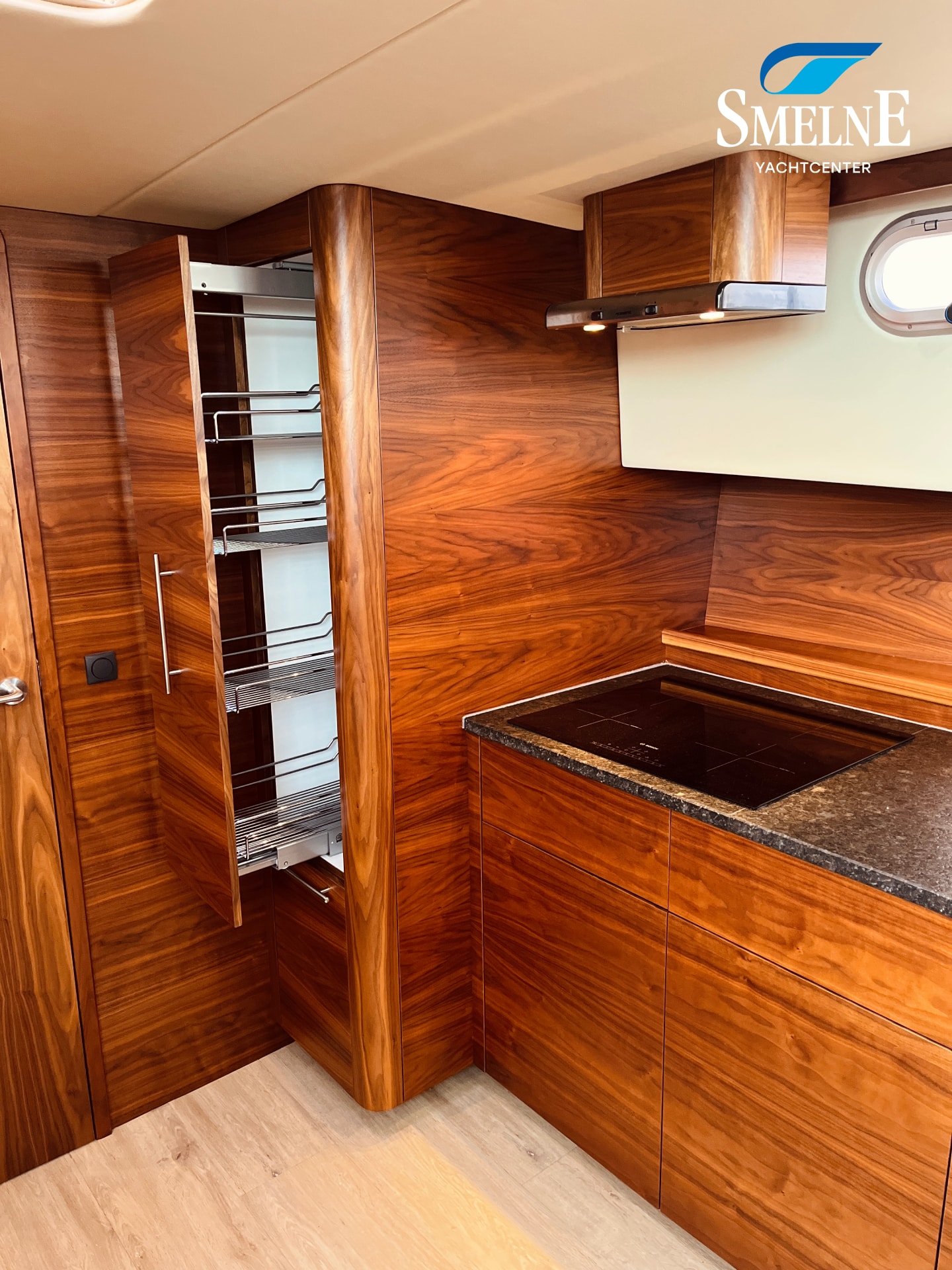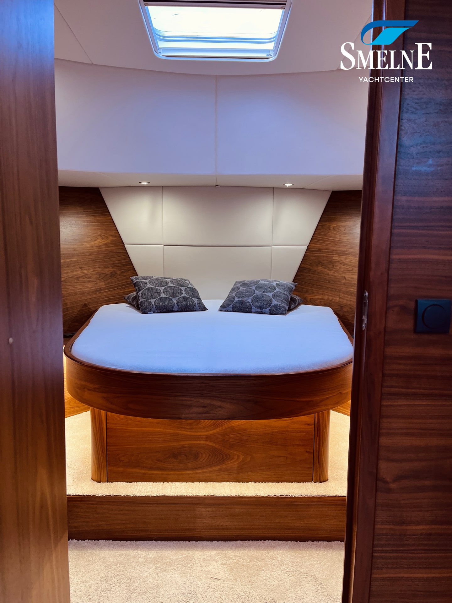 For added comfort on deck and inside, the boat is equipped with a USB port at the steering position, additional radio speakers on the aft deck, an instrument arch with gas struts, an electrically folding stainless steel antenna arch, a Marinco spotlight with remote control, a stainless steel gangway ladder, and stainless steel fender baskets for eight fenders. The sunken deck bench has two 8V outlets, ideal for charging electric folding bikes, for example, and is protected by a cover. Various luxurious exterior lighting, a Wi-Fi system, a central vacuum system, and an Indesit washer-dryer (230/8 kg) make long stays on board exceptionally comfortable.