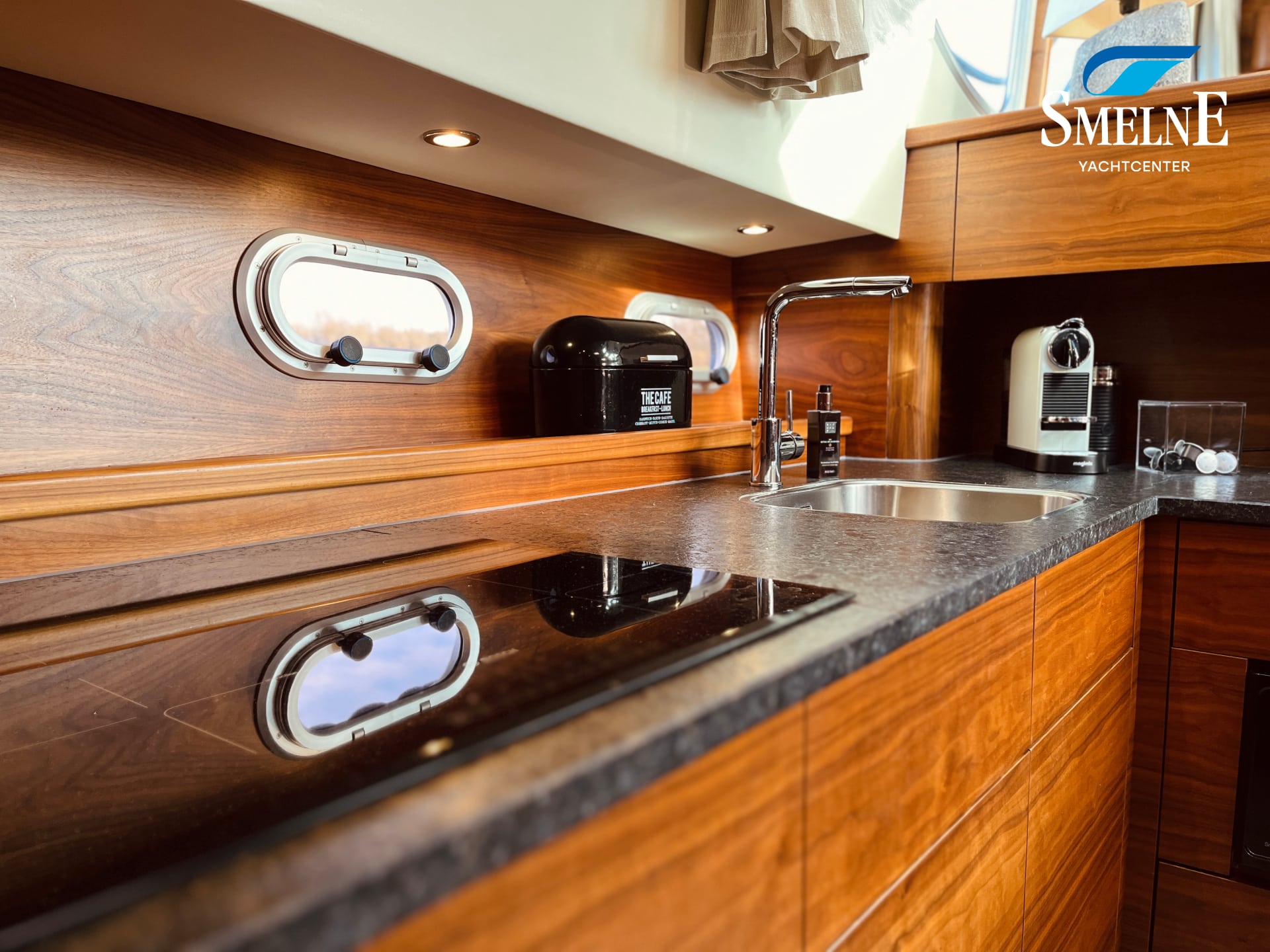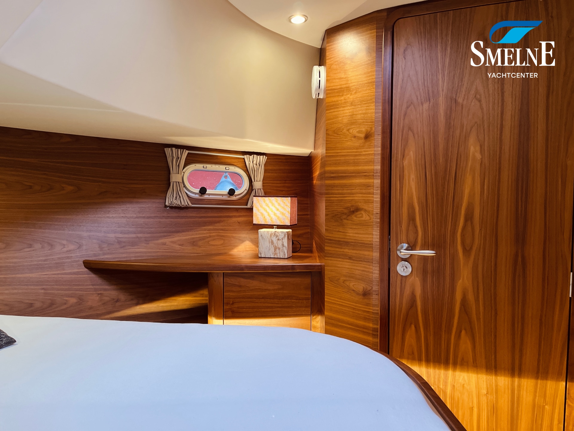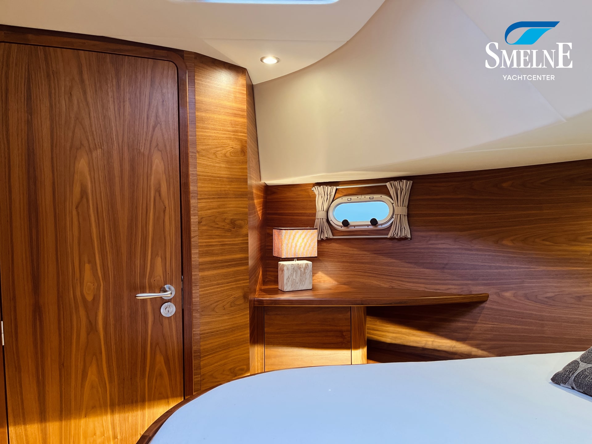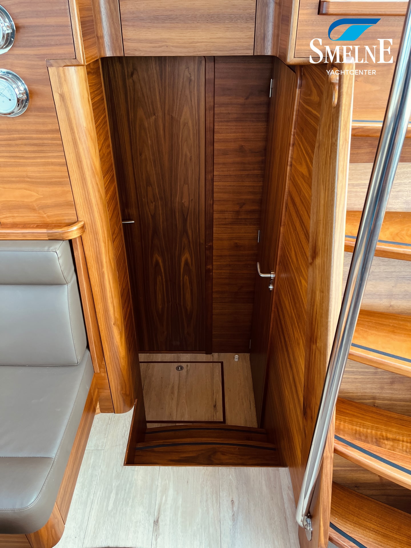 For added comfort on deck and inside, the boat is equipped with a USB port at the steering position, additional radio speakers on the aft deck, an instrument arch with gas struts, an electrically folding stainless steel antenna arch, a Marinco spotlight with remote control, a stainless steel gangway ladder, and stainless steel fender baskets for eight fenders. The sunken deck bench has two 8V outlets, ideal for charging electric folding bikes, for example, and is protected by a cover. Various luxurious exterior lighting, a Wi-Fi system, a central vacuum system, and an Indesit washer-dryer (230/8 kg) make long stays on board exceptionally comfortable.