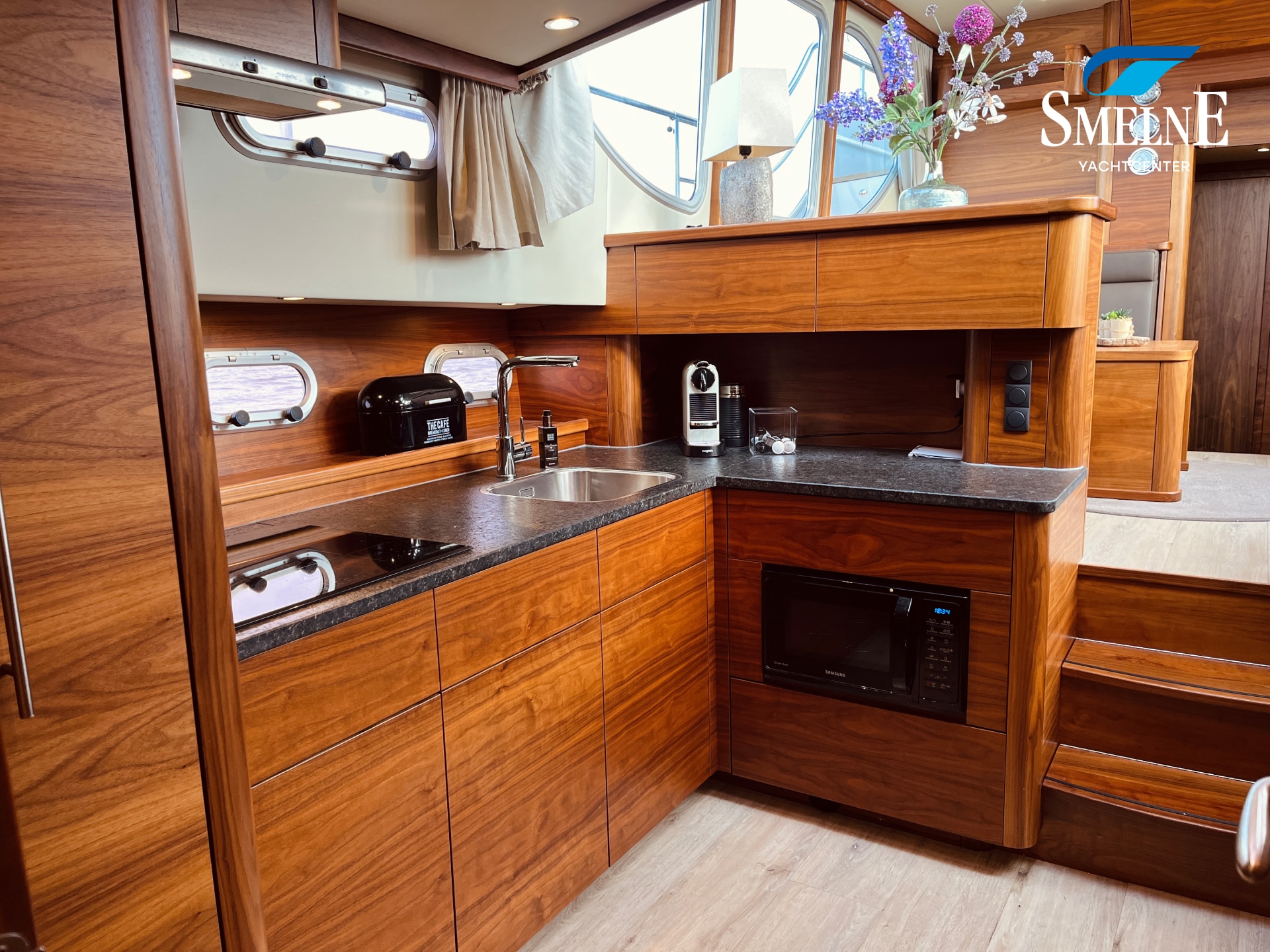 The interior exudes comfort and luxury. The saloon features a spacious U-shaped sofa, ideal for relaxing or entertaining, opposite a stylish wall of cabinets with a TV integrated into a drawer, seamlessly integrating entertainment. The saloon is open to the galley, which is equipped with a fully equipped kitchen and a cozy dinette, perfect for cooking, dining, and enjoying time together on board.