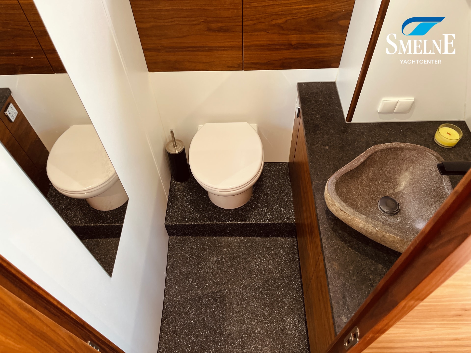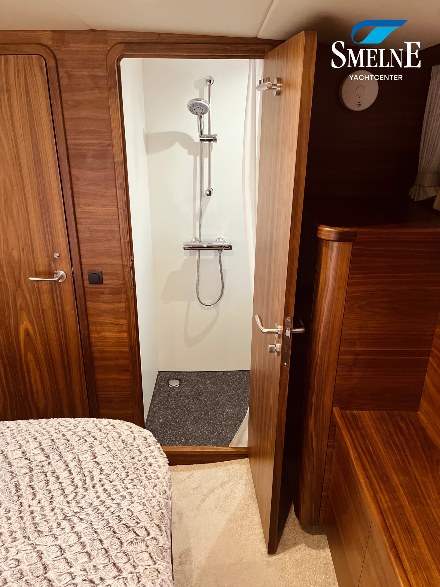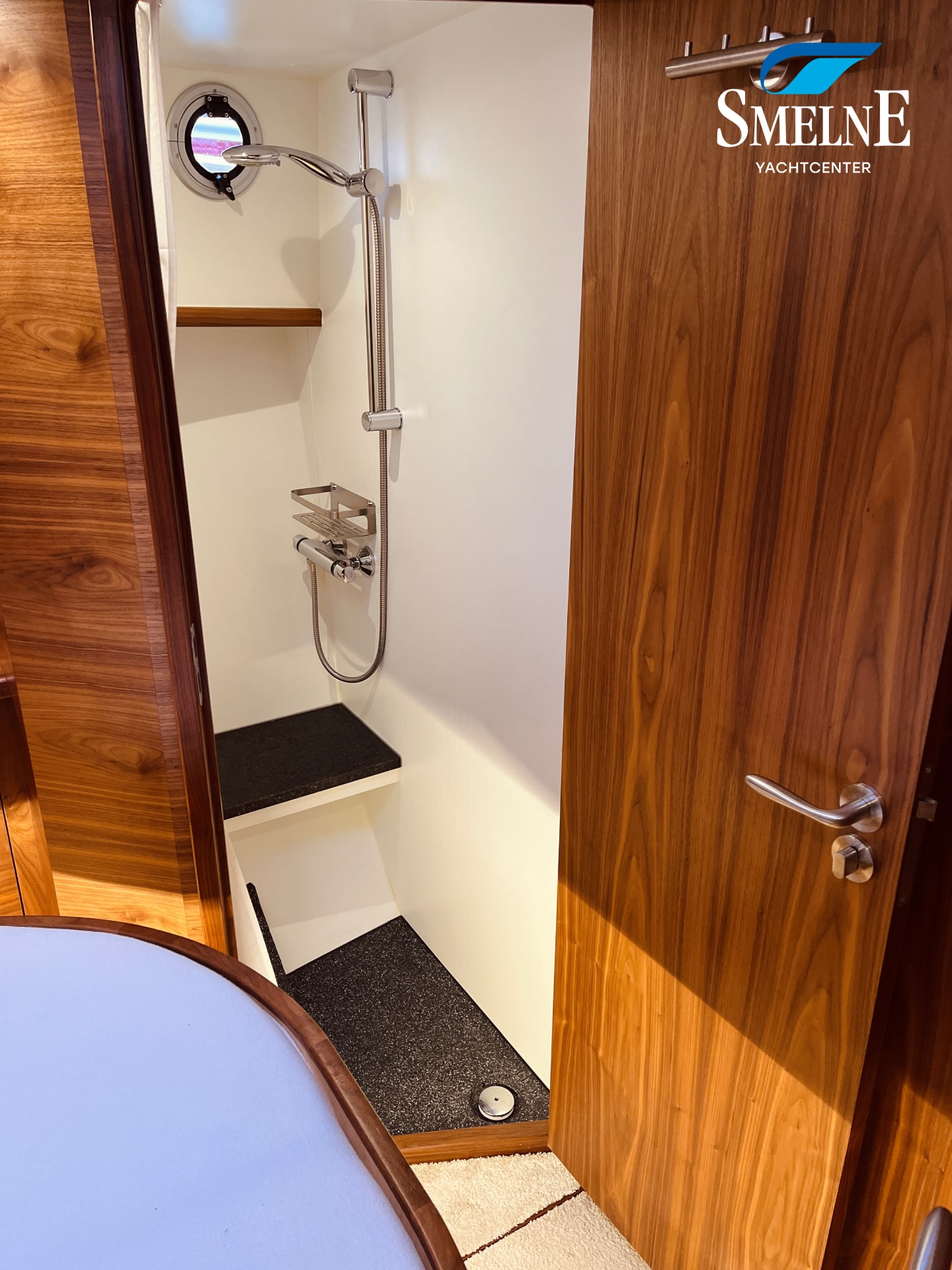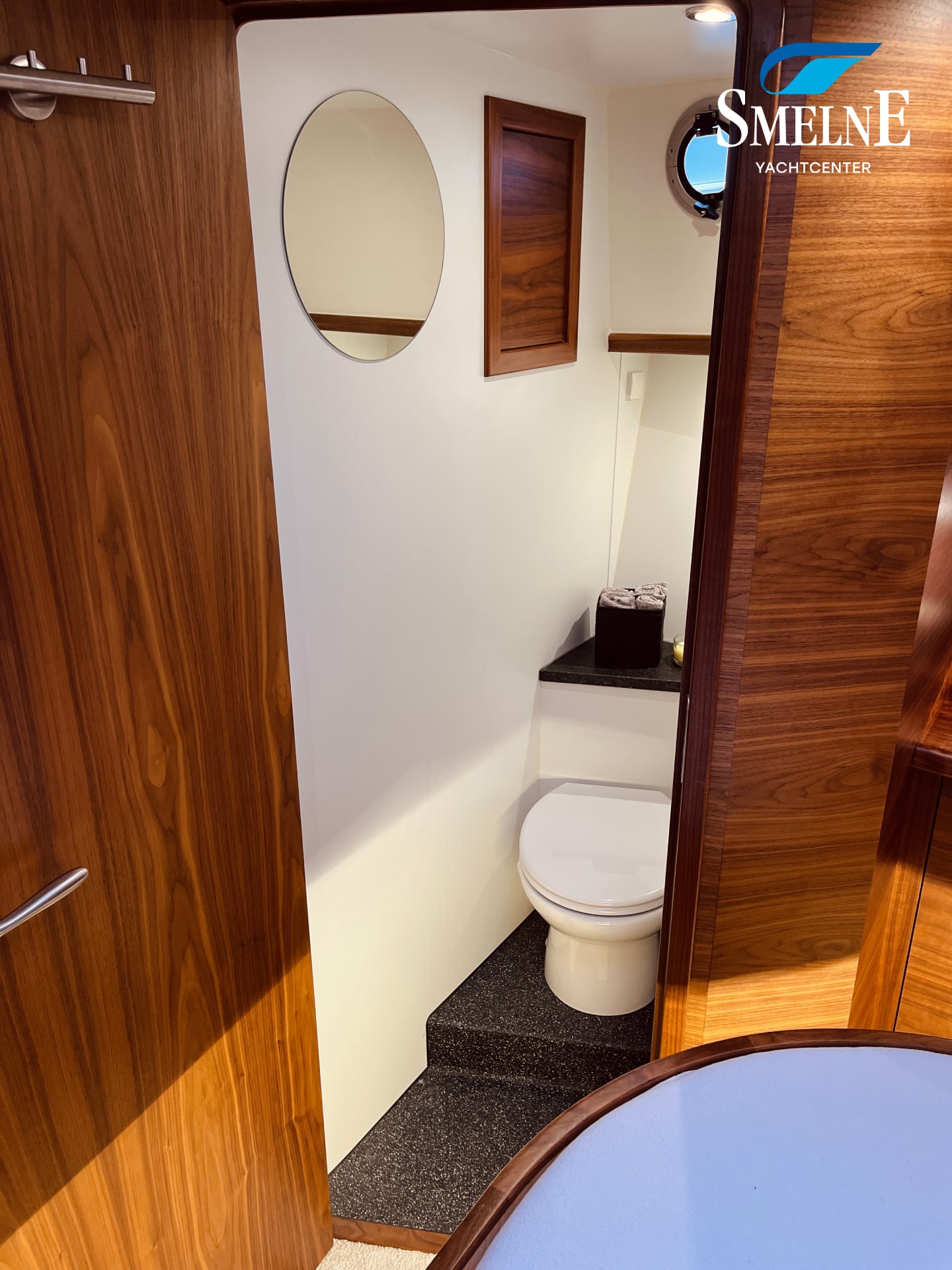 The forward cabin features a freestanding double bed and an ensuite shower and toilet, giving guests the same luxury and privacy as the owner. The aft cabin offers the spacious owner's cabin with a comfortable double bed, ample storage, and its own ensuite shower. There is also a second, centrally located toilet, easily accessible from both the saloon and the owner's cabin, ideal for extended stays on board.