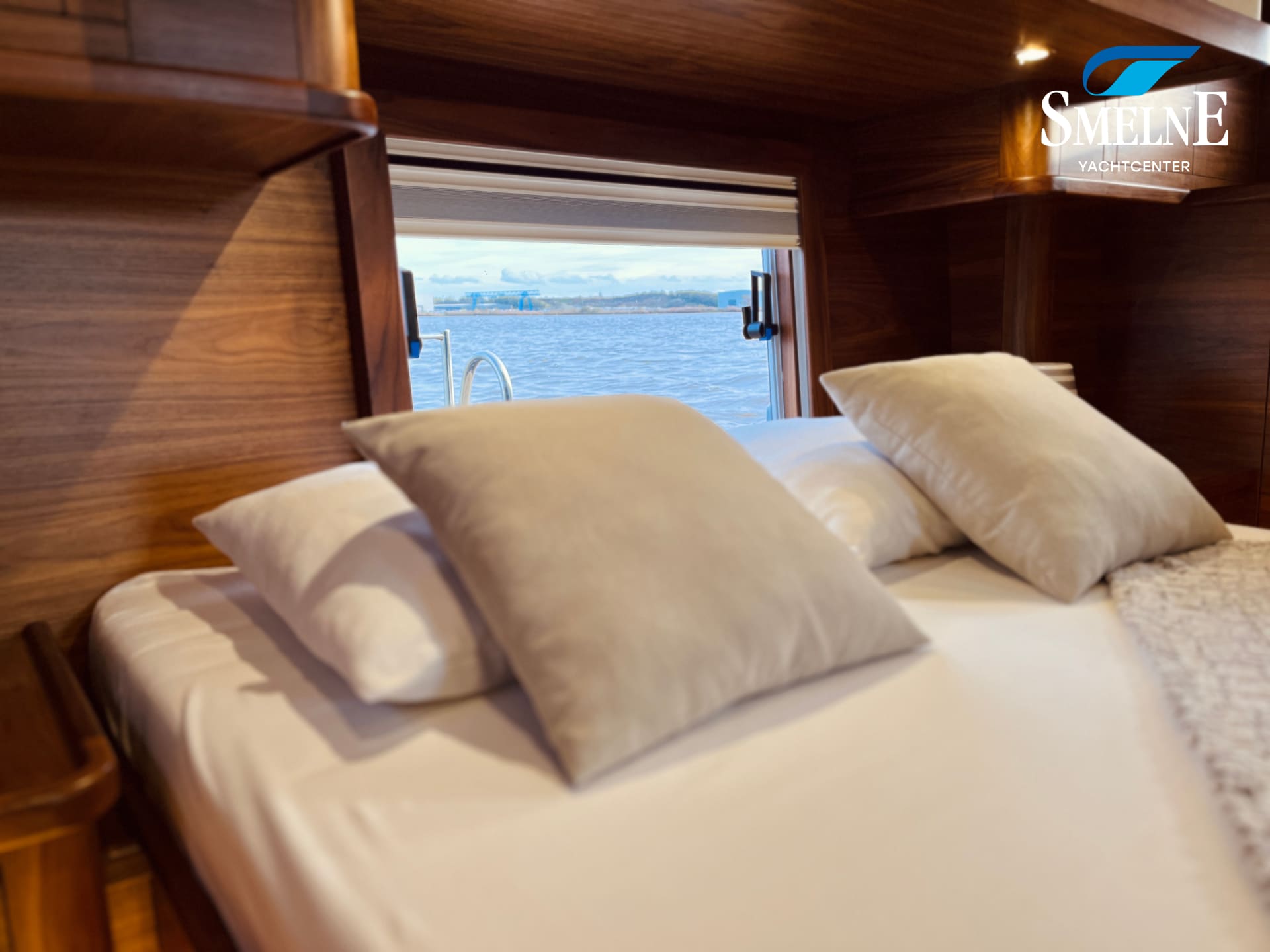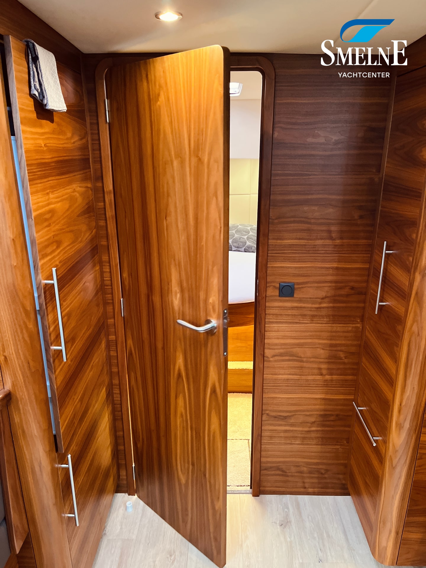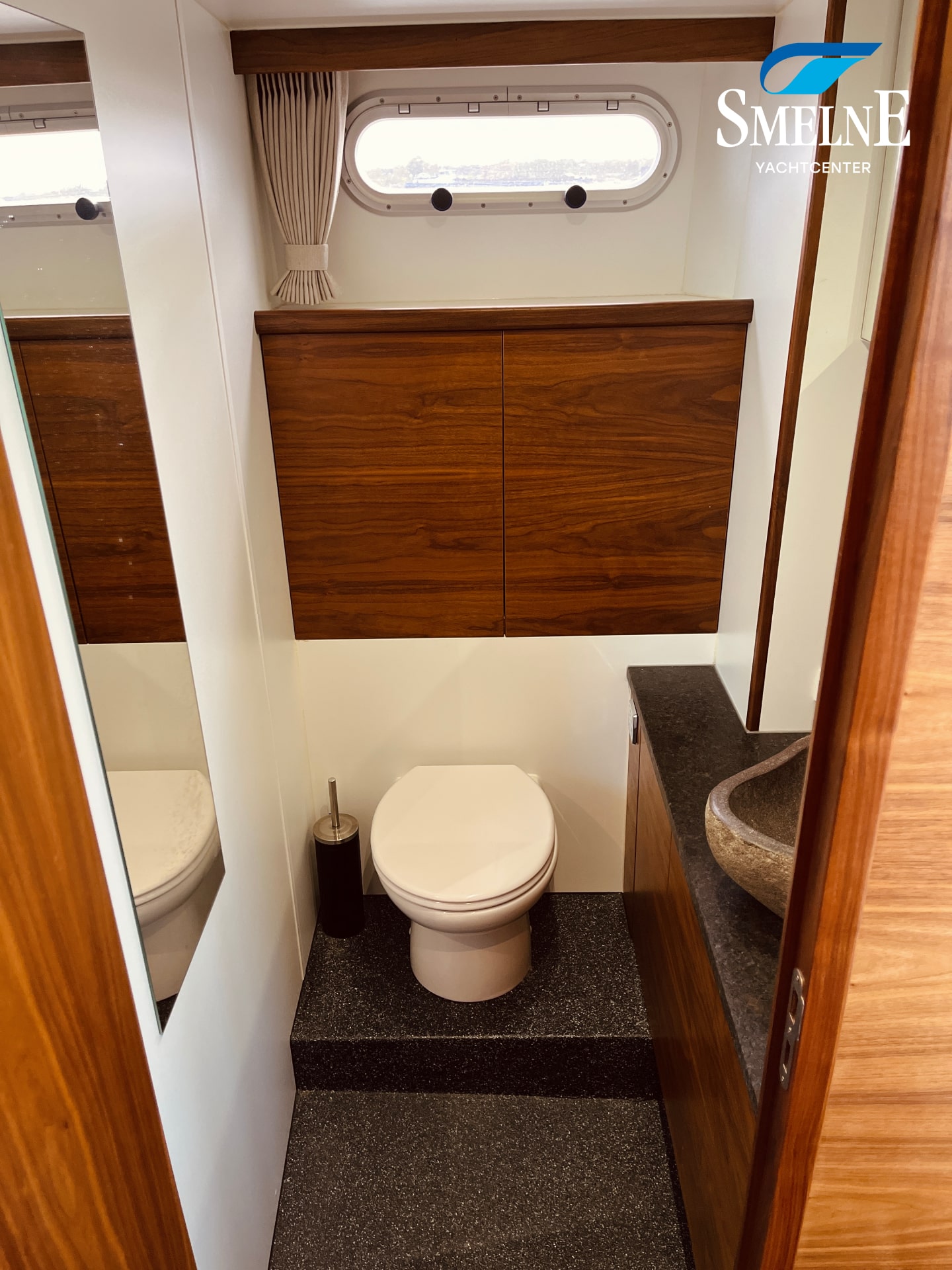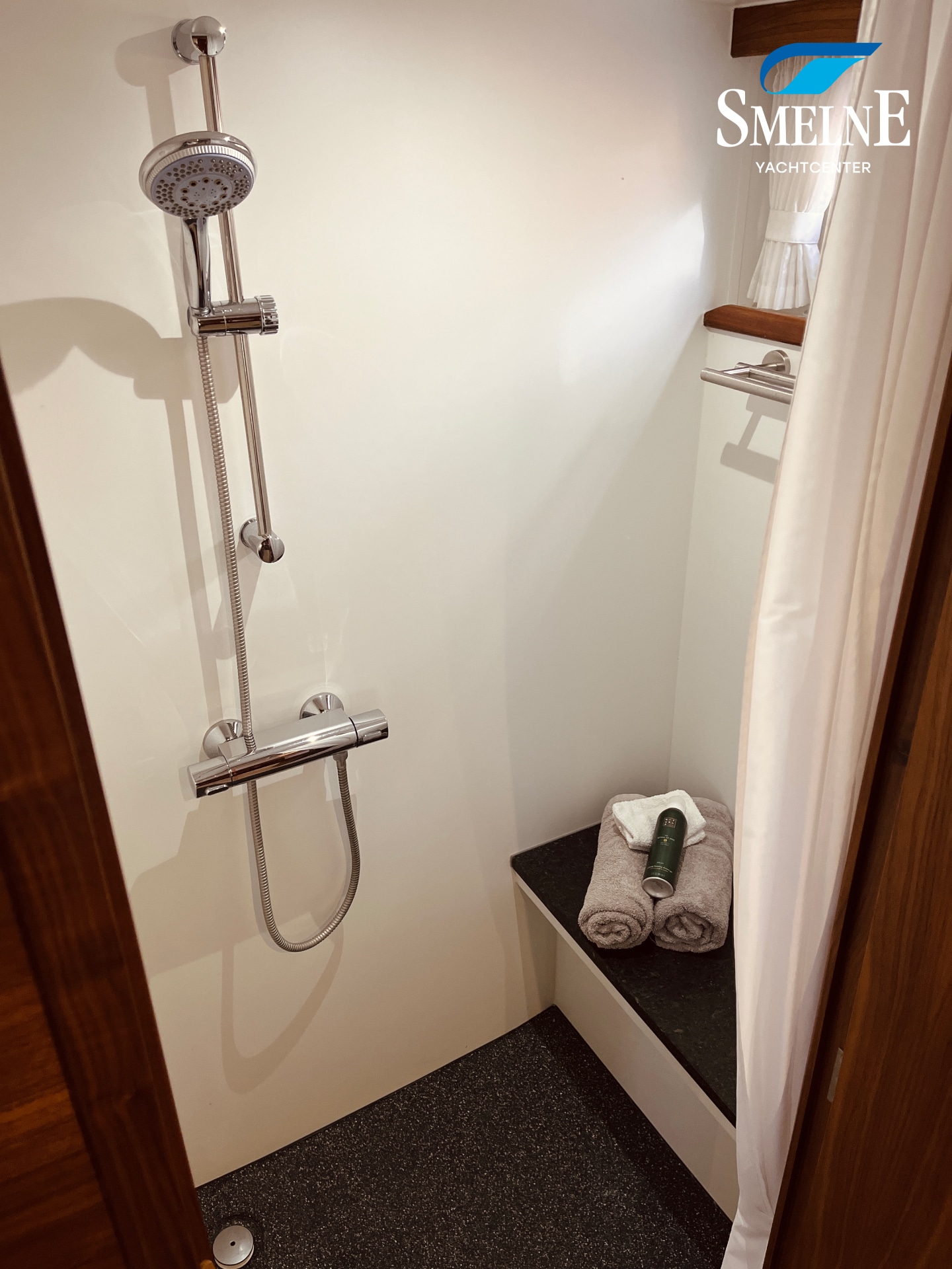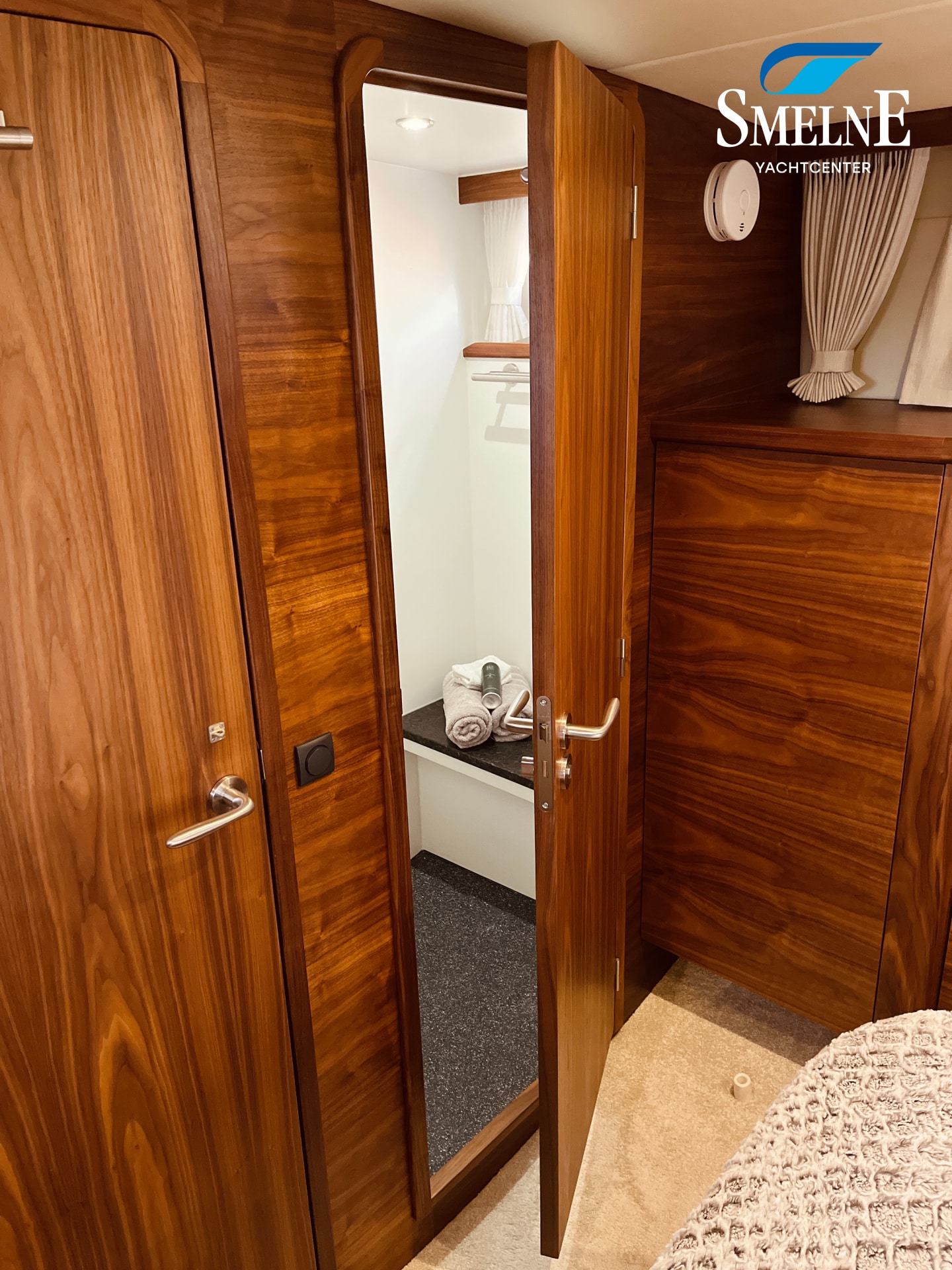 The forward cabin features a freestanding double bed and an ensuite shower and toilet, giving guests the same luxury and privacy as the owner. The aft cabin offers the spacious owner's cabin with a comfortable double bed, ample storage, and its own ensuite shower. There is also a second, centrally located toilet, easily accessible from both the saloon and the owner's cabin, ideal for extended stays on board.