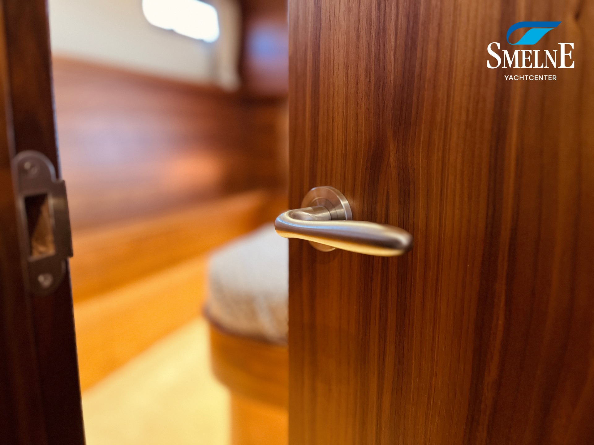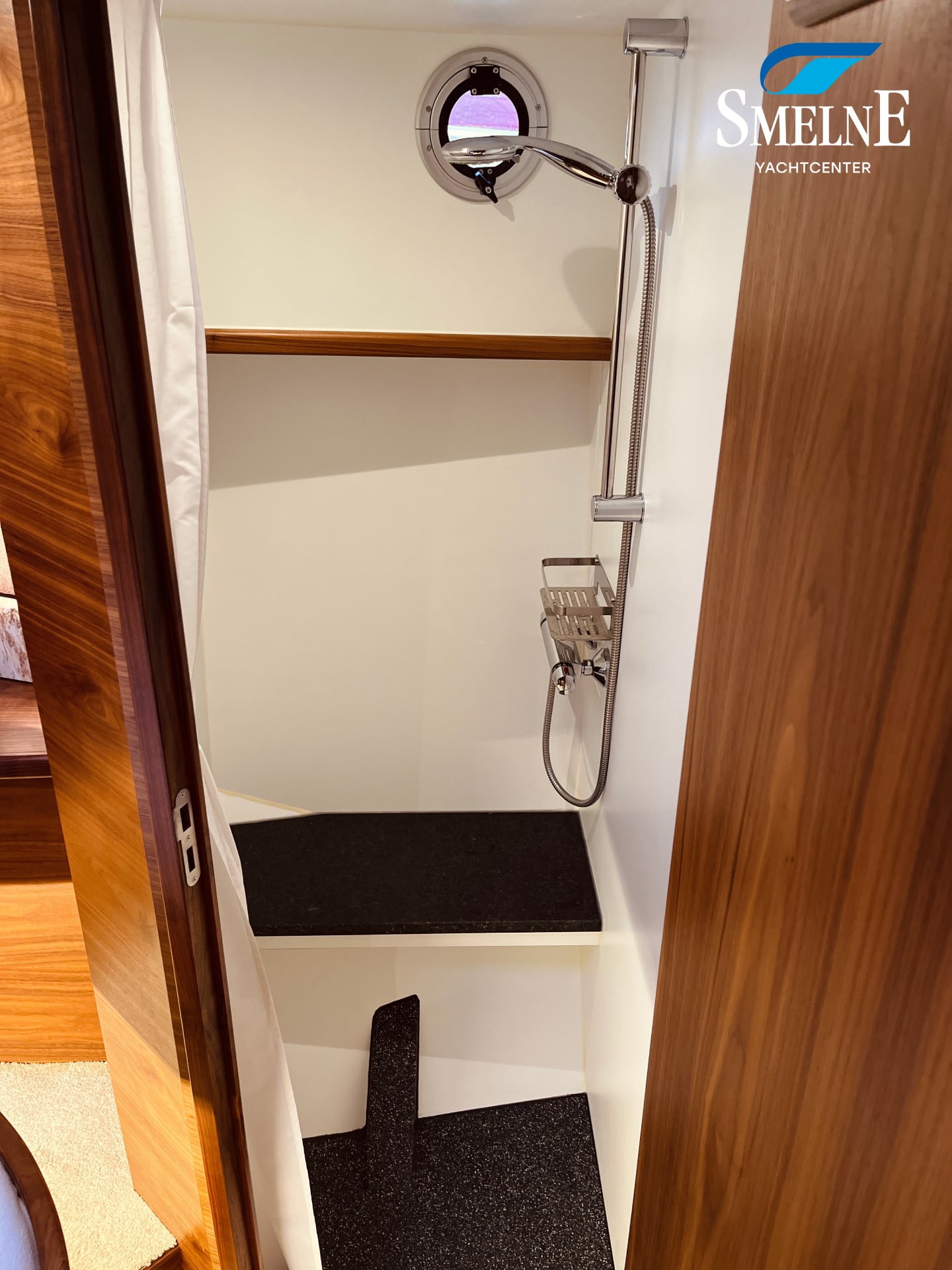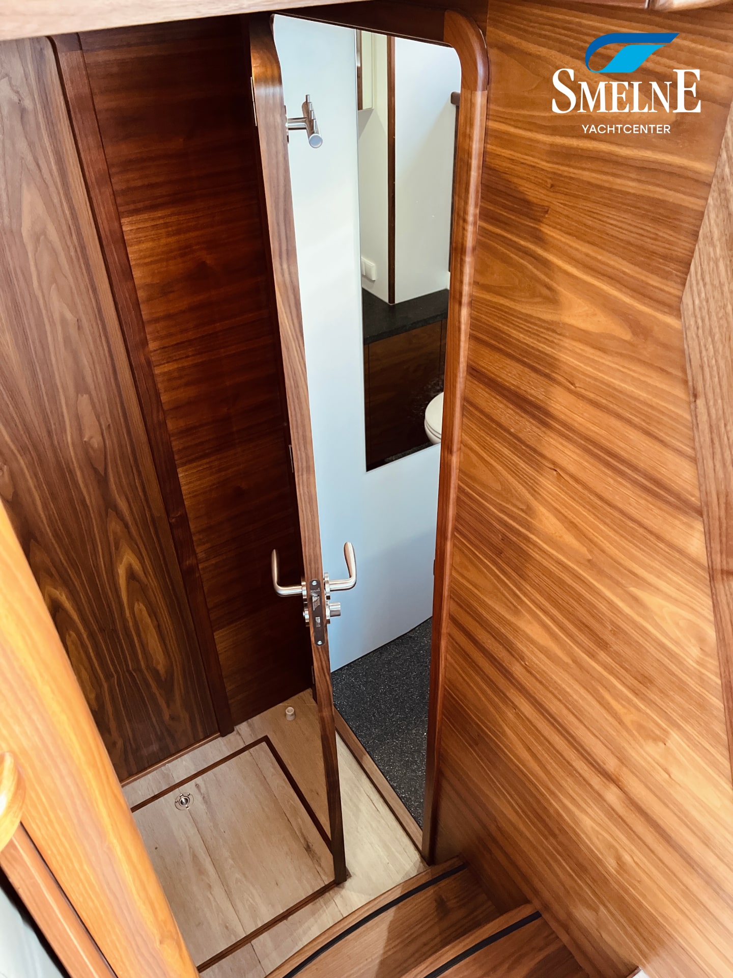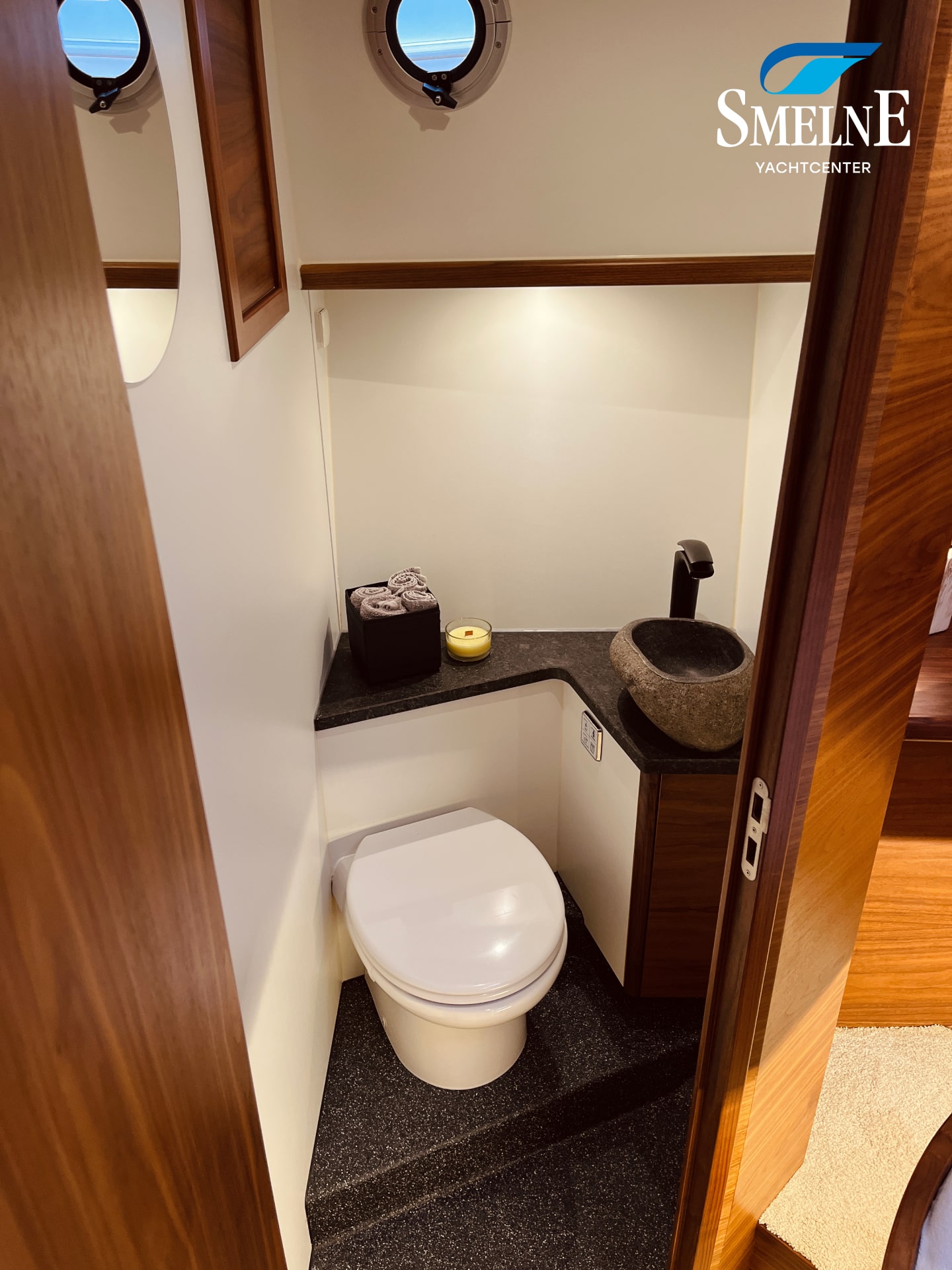 The forward cabin features a freestanding double bed and an ensuite shower and toilet, giving guests the same luxury and privacy as the owner. The aft cabin offers the spacious owner's cabin with a comfortable double bed, ample storage, and its own ensuite shower. There is also a second, centrally located toilet, easily accessible from both the saloon and the owner's cabin, ideal for extended stays on board.