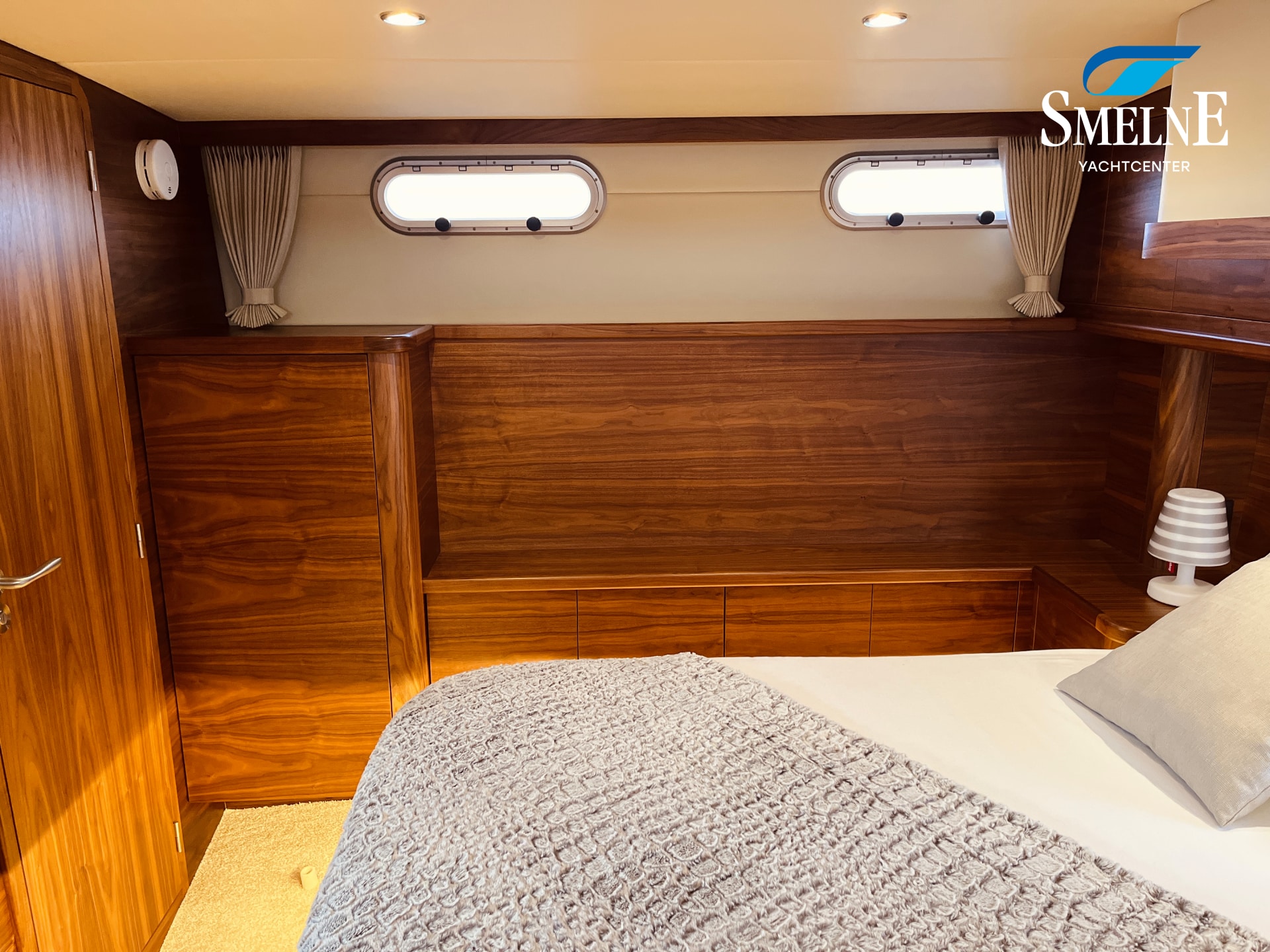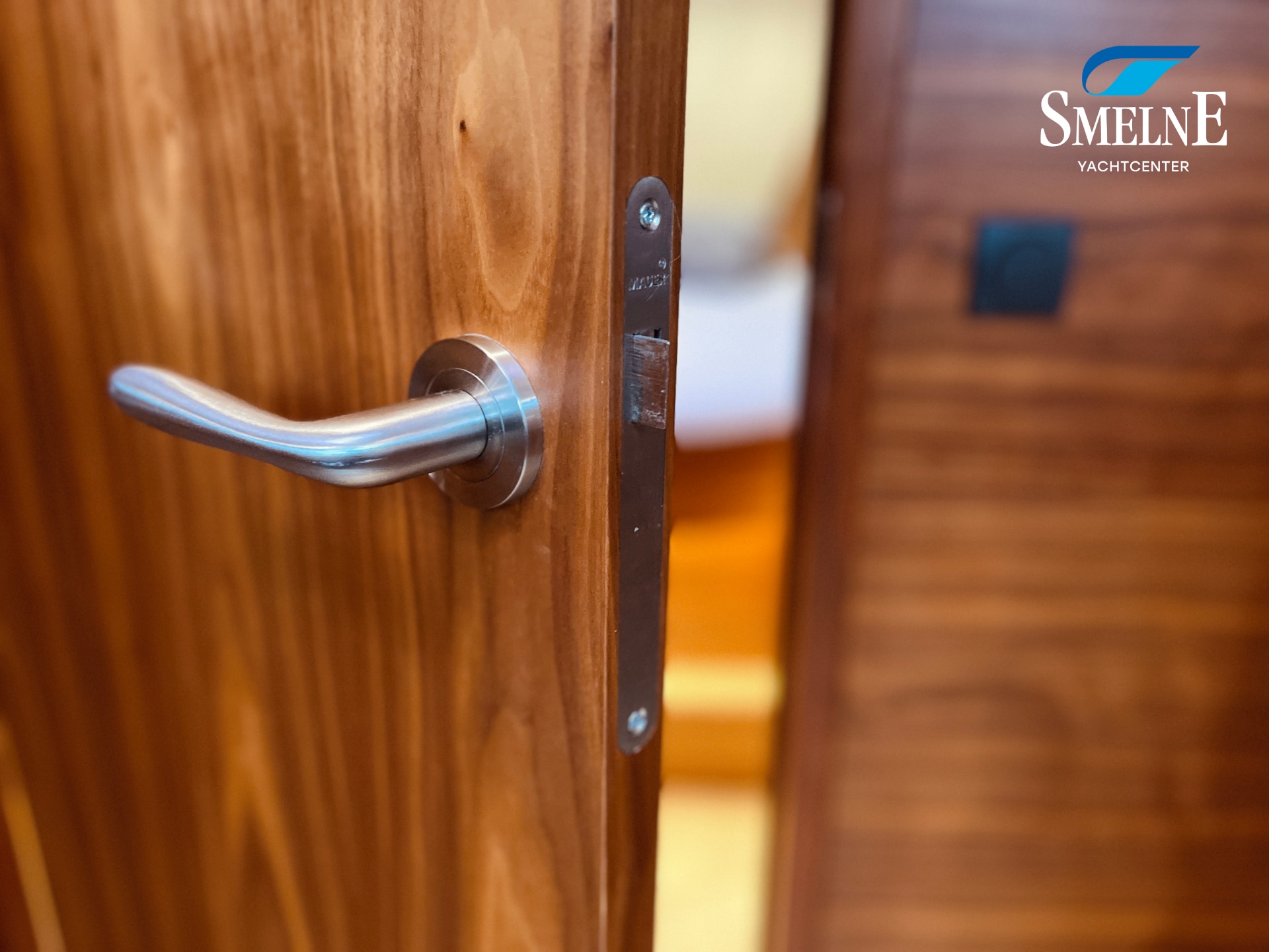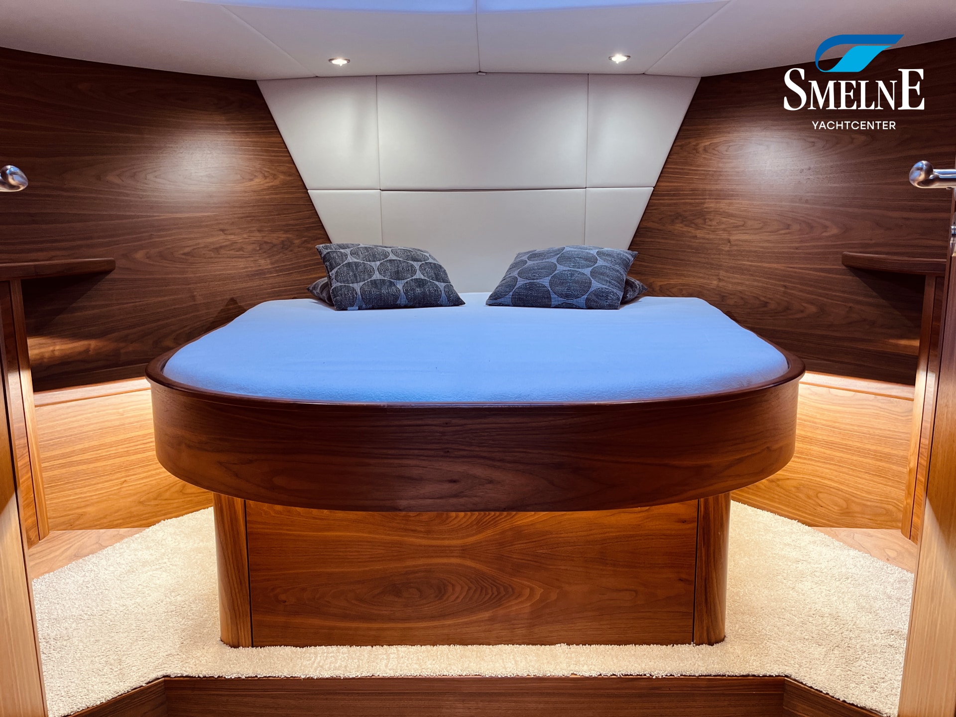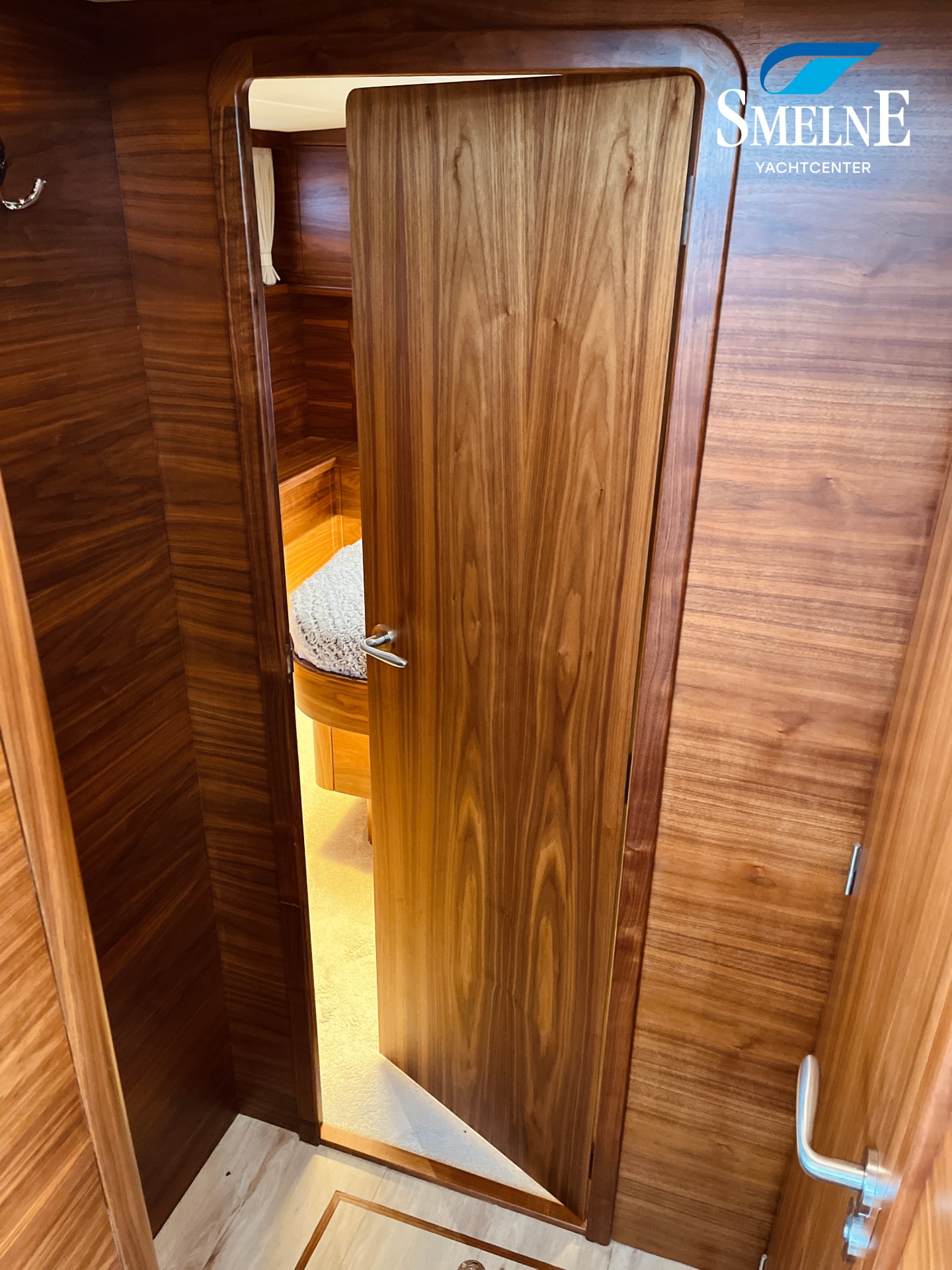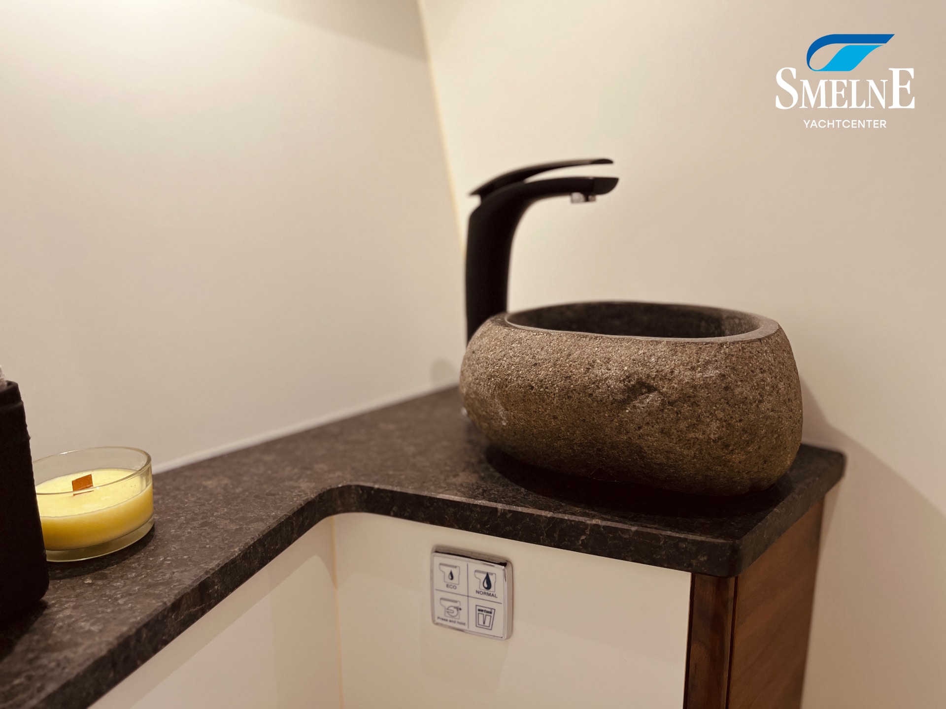 The forward cabin features a freestanding double bed and an ensuite shower and toilet, giving guests the same luxury and privacy as the owner. The aft cabin offers the spacious owner's cabin with a comfortable double bed, ample storage, and its own ensuite shower. There is also a second, centrally located toilet, easily accessible from both the saloon and the owner's cabin, ideal for extended stays on board.