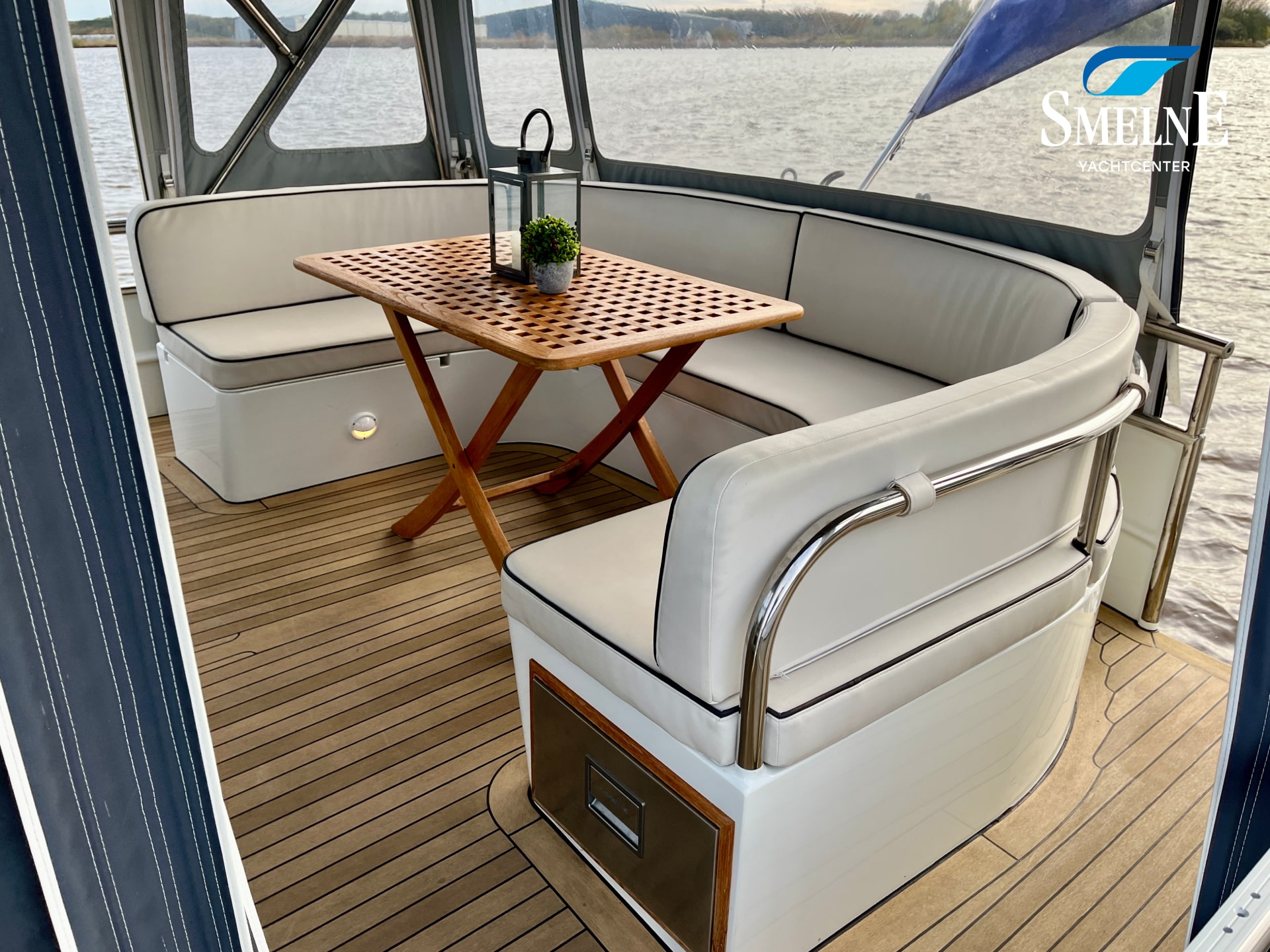 The spacious aft deck is a true outside space on the water. Accessible from the bathing platform via the integrated stairs or directly from the gangways, it offers a perfect place to relax or gather. A generous U-shaped deck settee invites you to lounge, while the midship steering position with a double steering chair offers optimal control and comfort while cruising. Everything is covered by an XL-canopy, allowing you to enjoy the view regardless of the weather or simply bask in the sunshine.