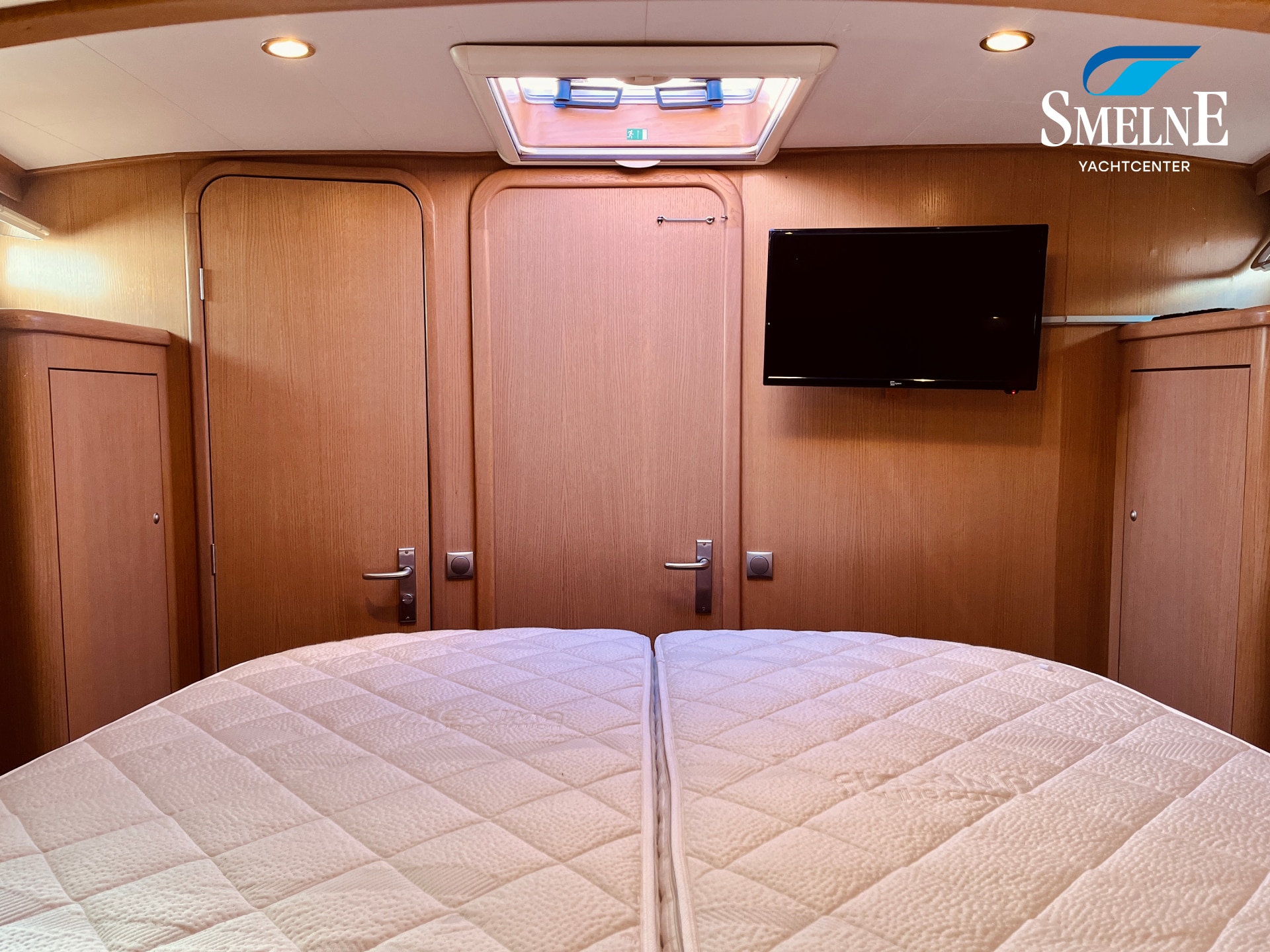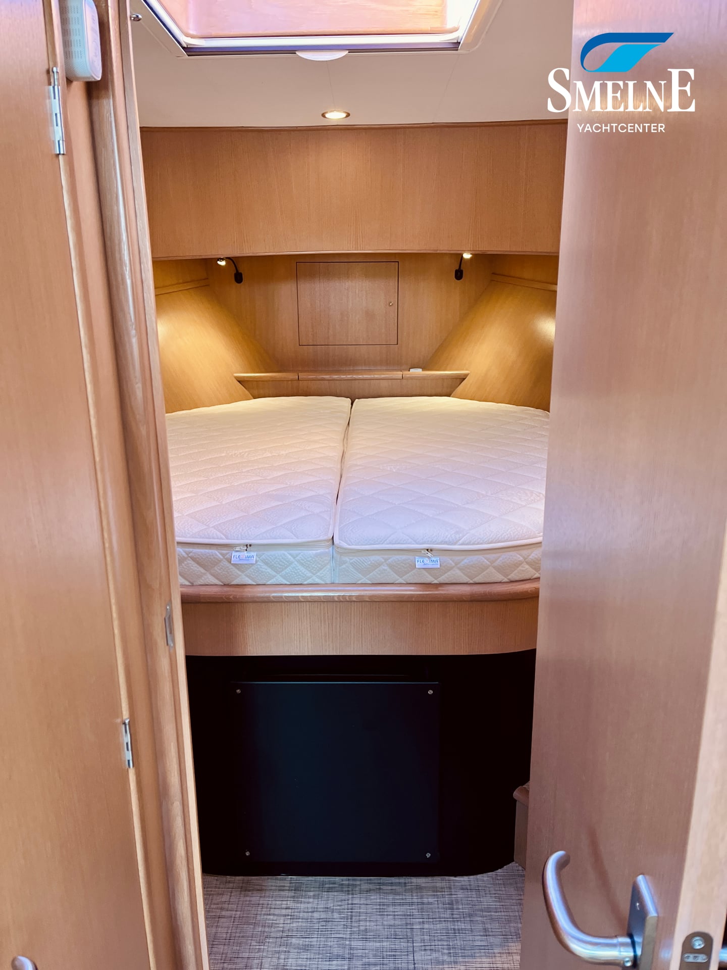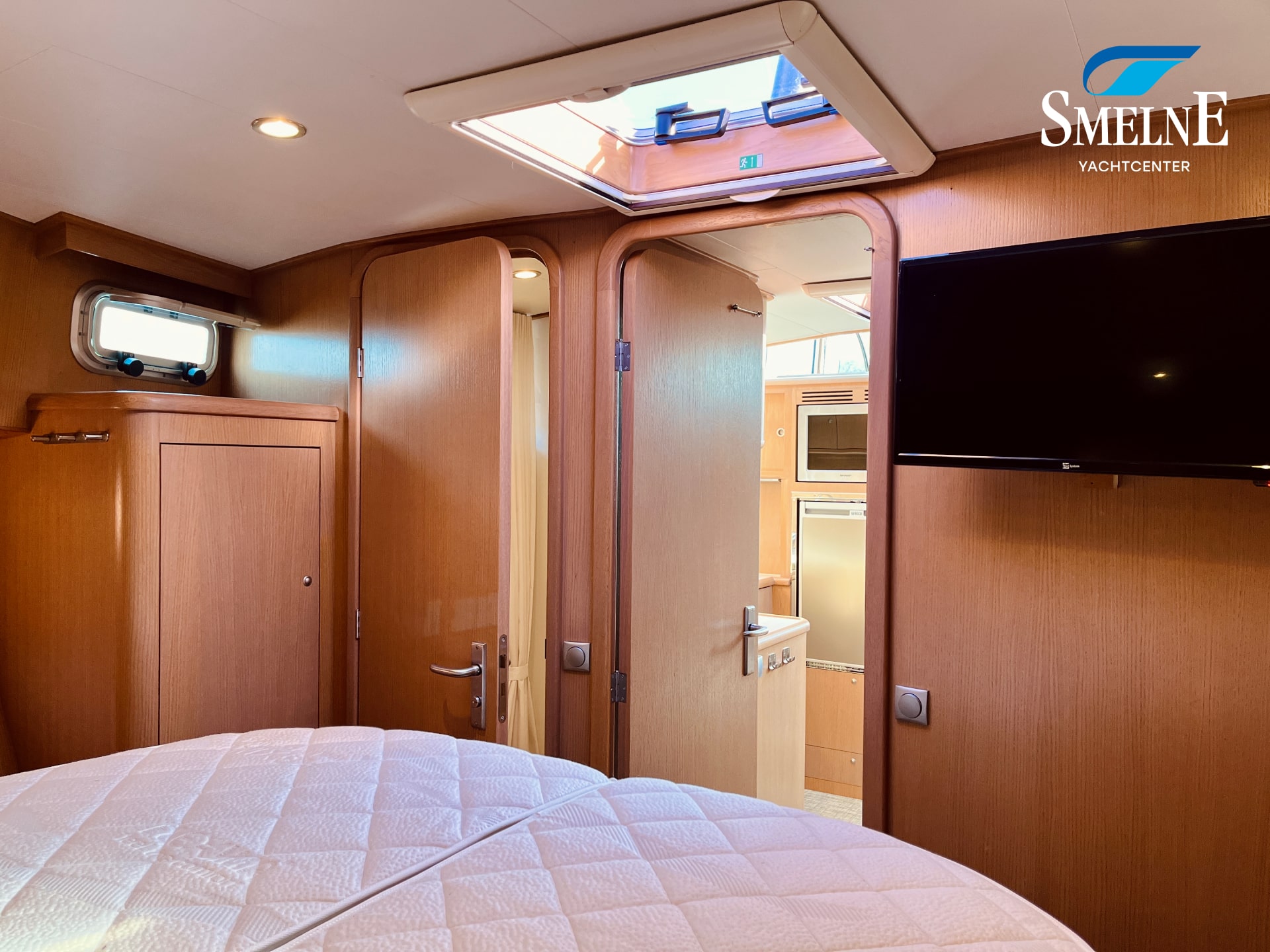 The galley is located forward, equipped with a practical kitchen and a cozy dinette, which can easily be converted into an additional sleeping place. From the galley, there is access to a sanitary room with an electric toilet. The forward cabin houses the spacious owner's cabin with a comfortable freestanding double bed, ample storage, and an ensuite shower room, ensuring optimal privacy and comfort.