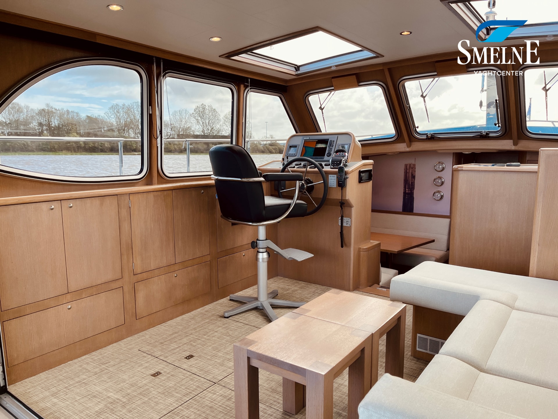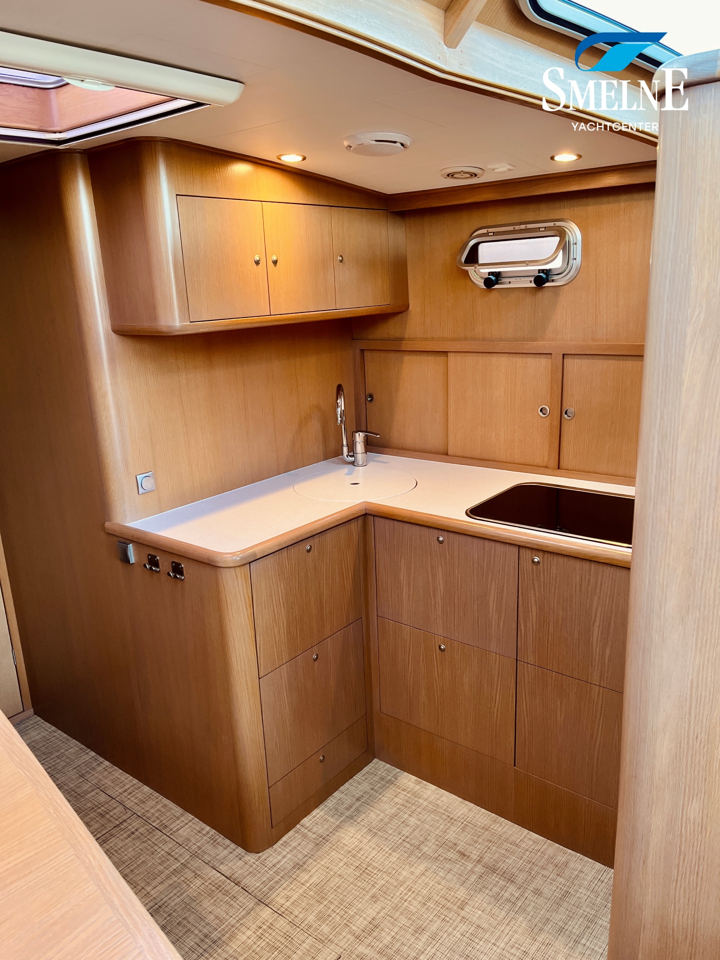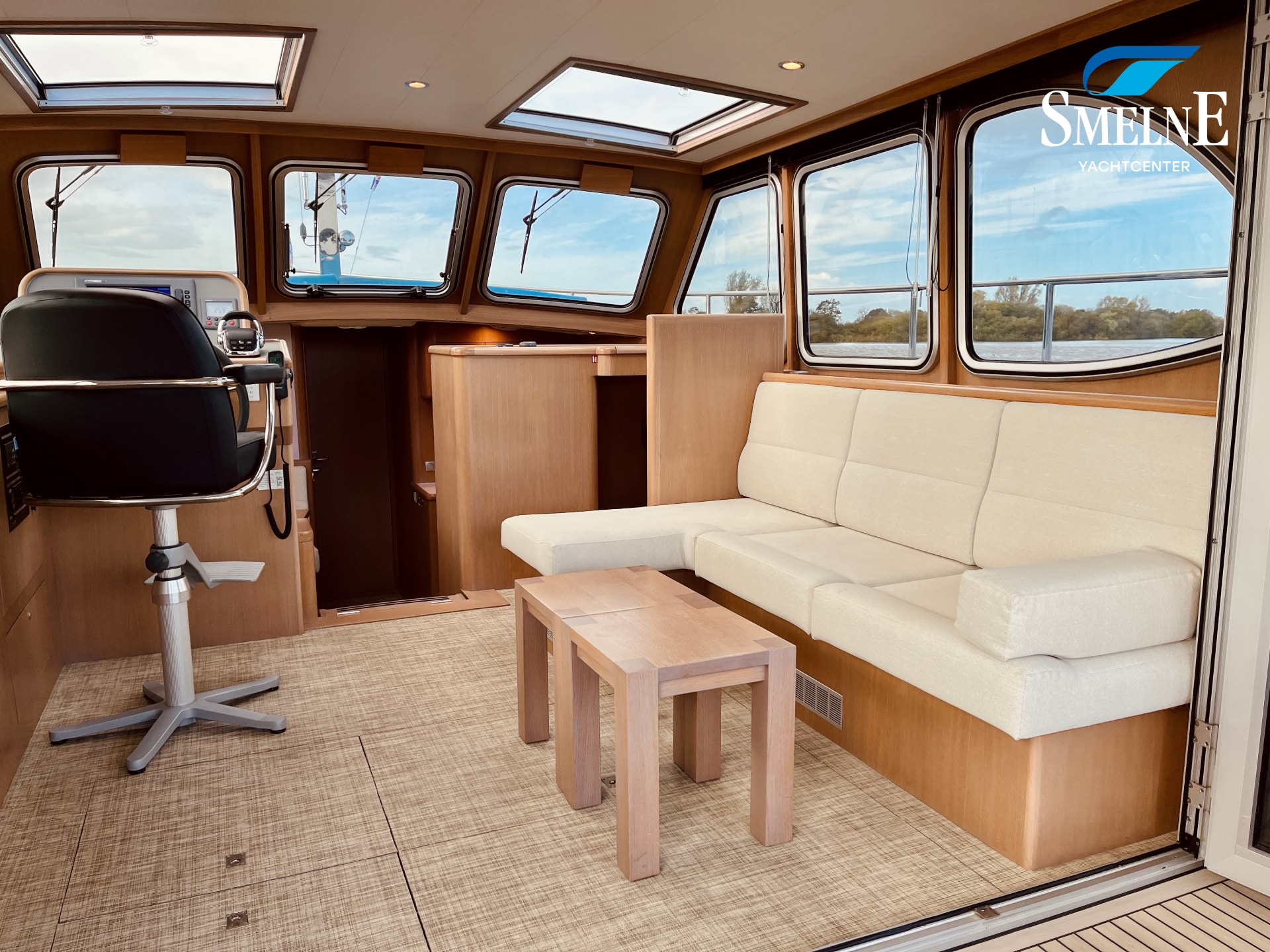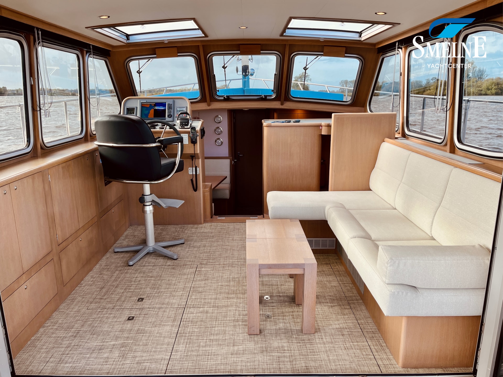 The interior is bright, spacious, and thoughtfully laid out. The saloon features an L-shaped settee facing a wall of cabinets and the steering position, with a comfortable co-pilot seat next to it, allowing you to navigate together. Two large sliding roof hatches provide pleasant light and optimal ventilation, keeping the interior feeling airy.