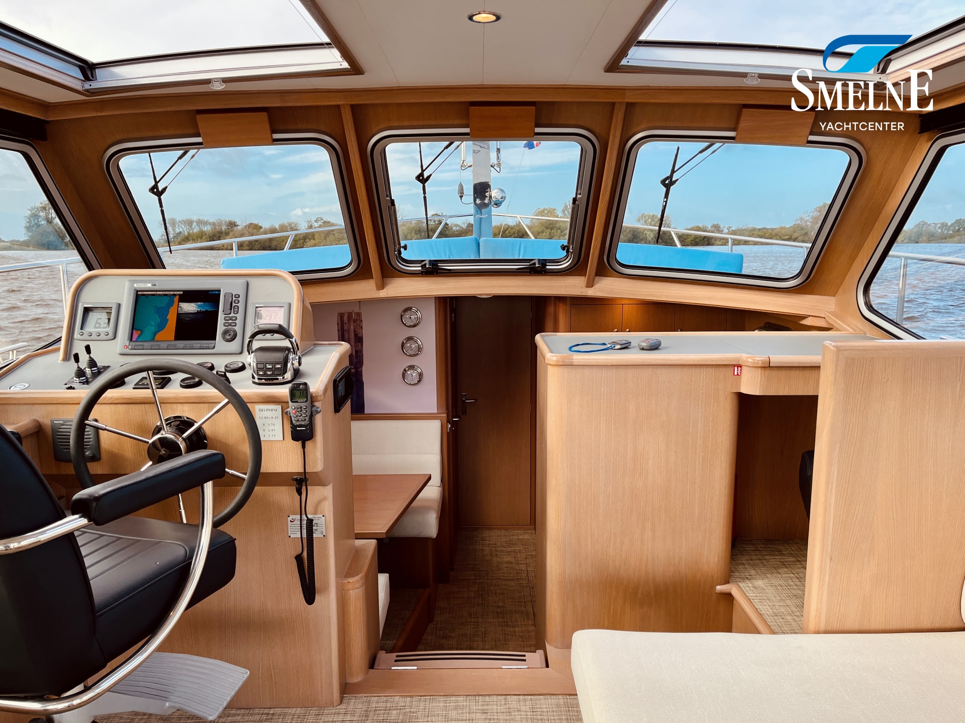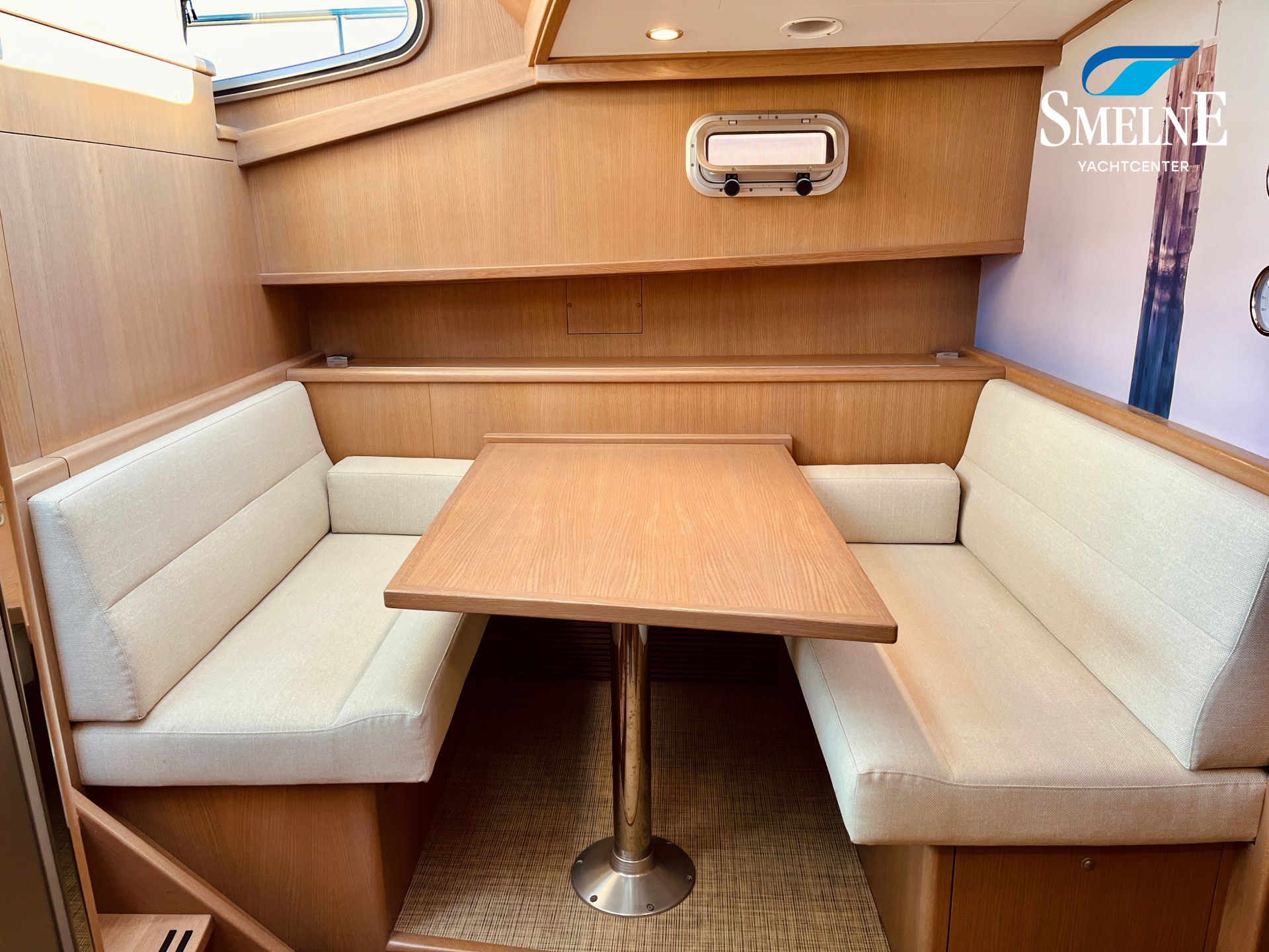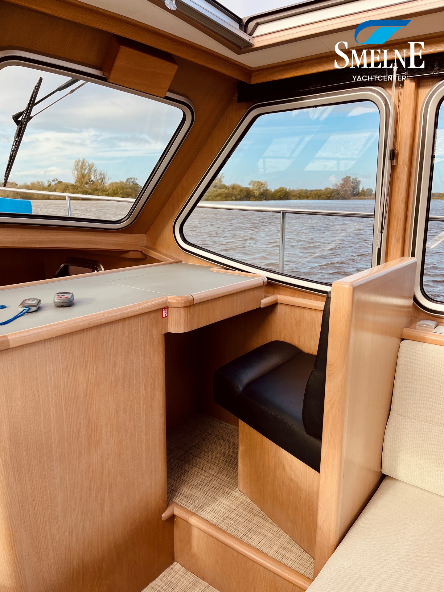 The interior is bright, spacious, and thoughtfully laid out. The saloon features an L-shaped settee facing a wall of cabinets and the steering position, with a comfortable co-pilot seat next to it, allowing you to navigate together. Two large sliding roof hatches provide pleasant light and optimal ventilation, keeping the interior feeling airy.