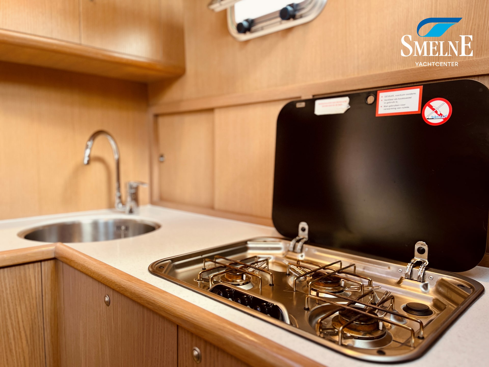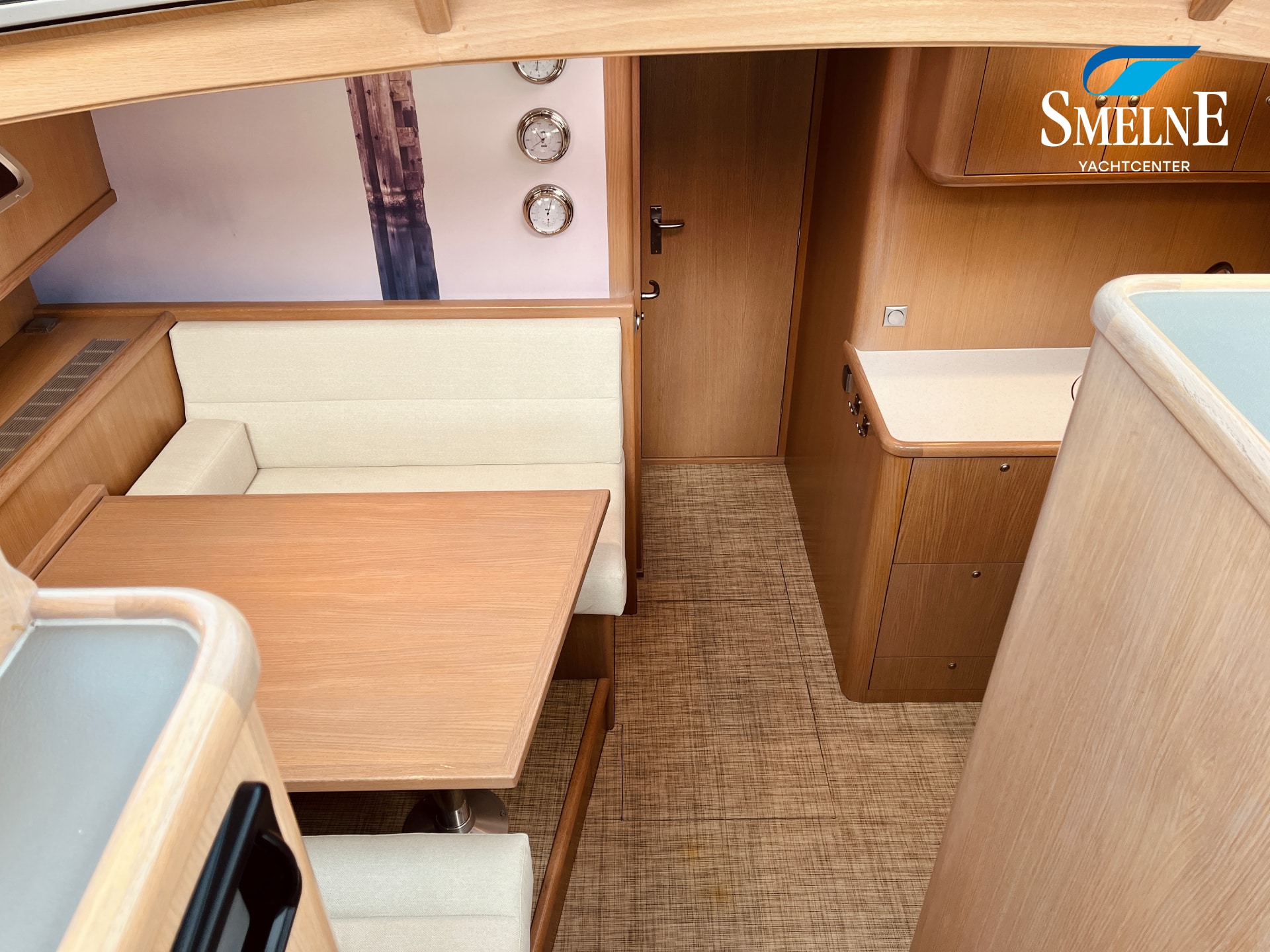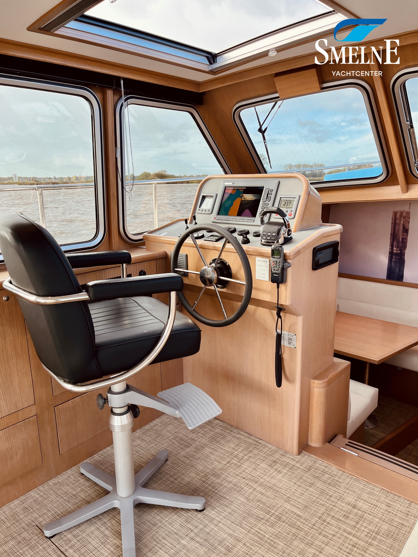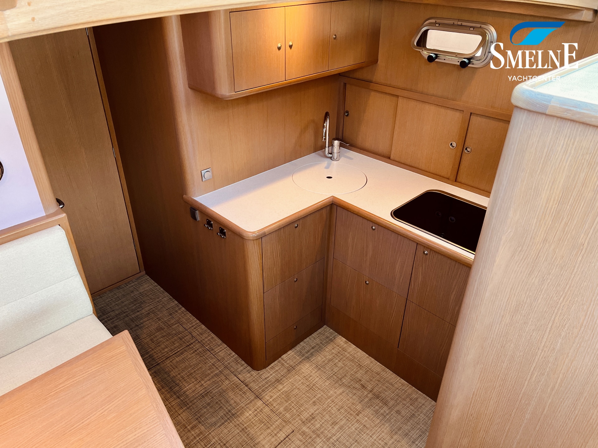 The interior is bright, spacious, and thoughtfully laid out. The saloon features an L-shaped settee facing a wall of cabinets and the steering position, with a comfortable co-pilot seat next to it, allowing you to navigate together. Two large sliding roof hatches provide pleasant light and optimal ventilation, keeping the interior feeling airy.