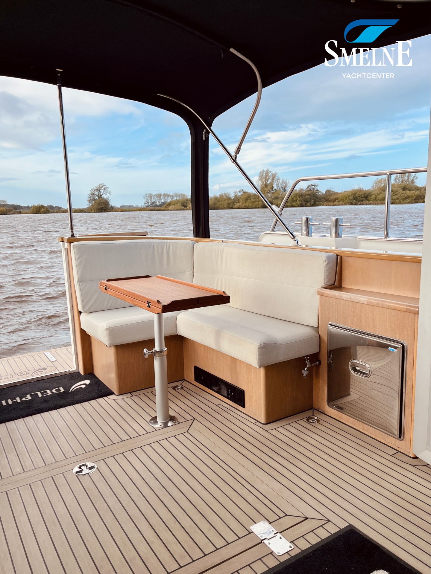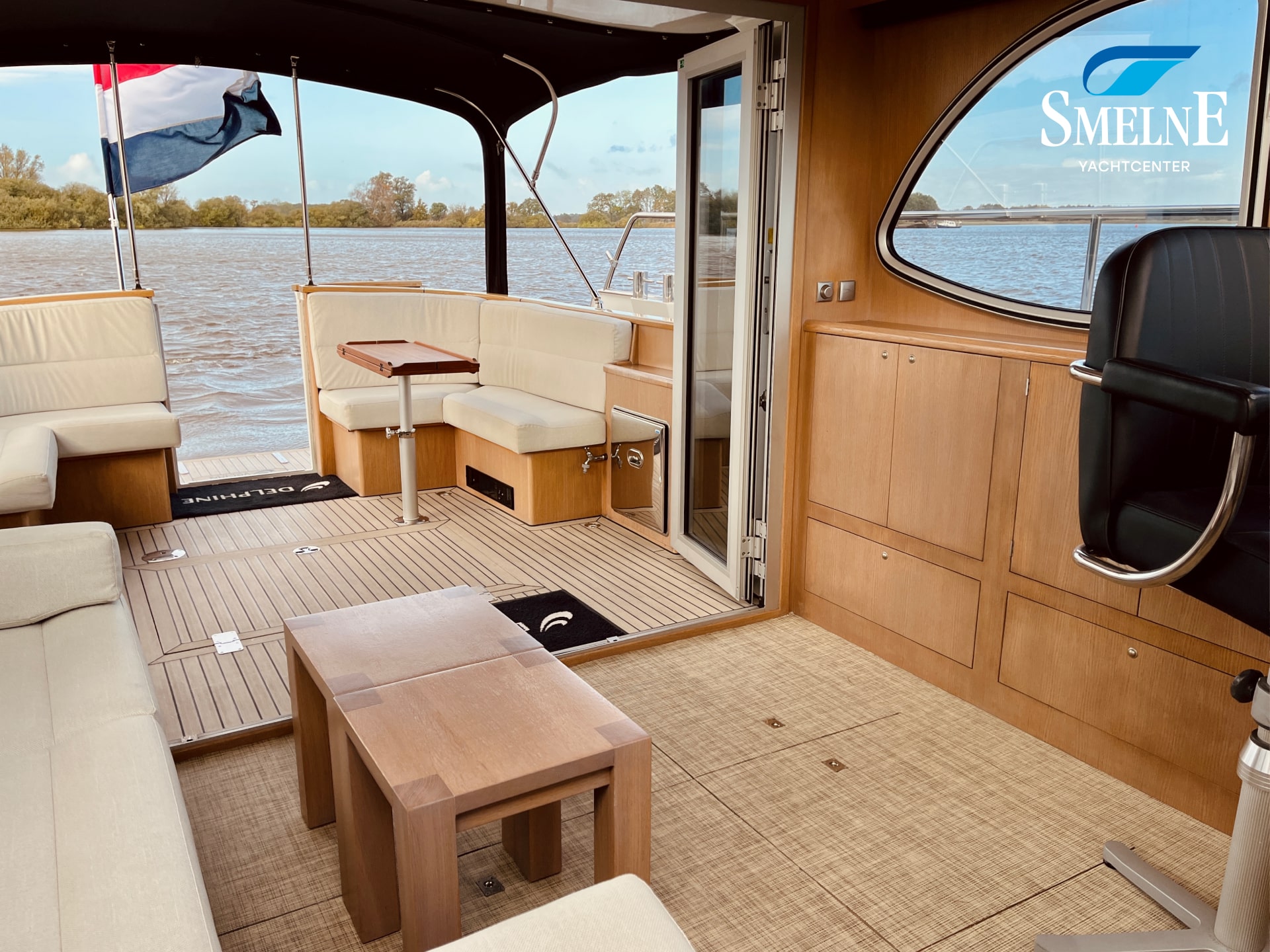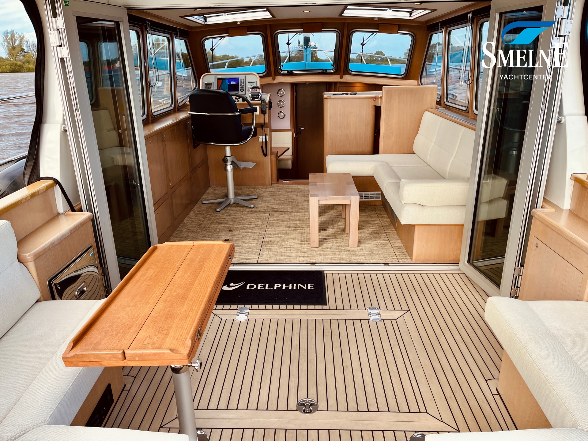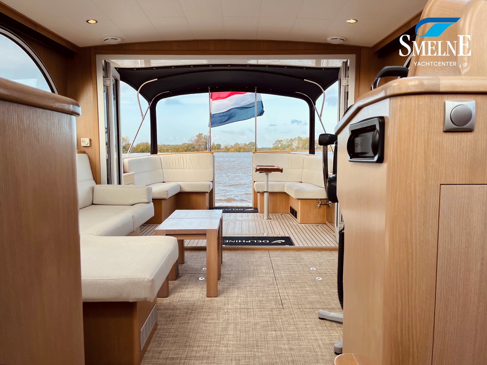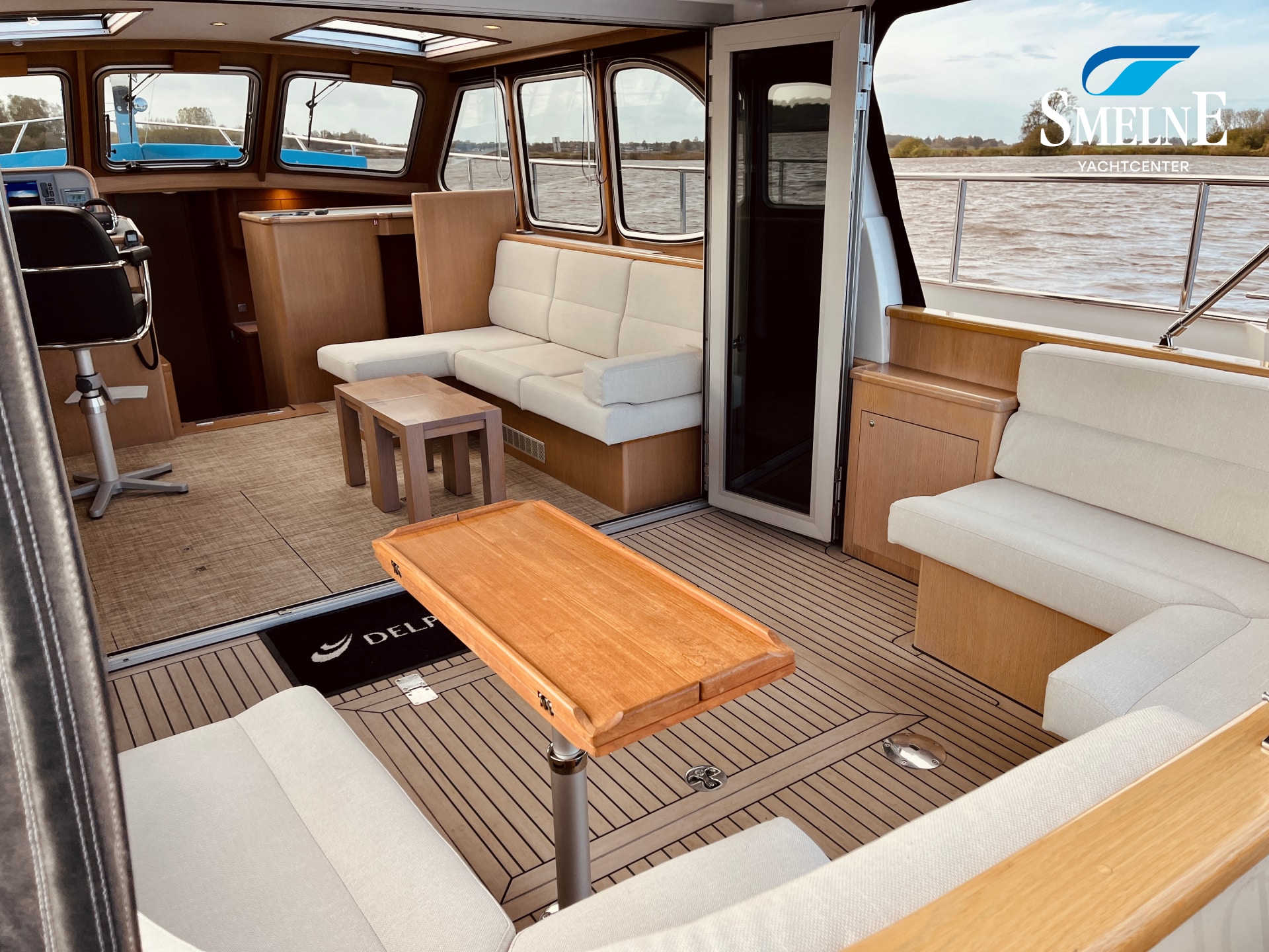The spacious open cockpit combines comfort and functionality. Two L-shaped cockpit benches, with matching height-adjustable cockpit tables, easily transform into a generous U-shaped bench seat, ideal for convivial moments with family or friends. Ample cupboard and storage space is available under and around the cockpit. The aluminum cockpit doors seamlessly connect the cockpit with the saloon, creating one large, bright living space. Even in less favorable weather, the cockpit canopy and Kickspace heating unit provide additional shelter and warmth, ensuring a pleasant atmosphere.